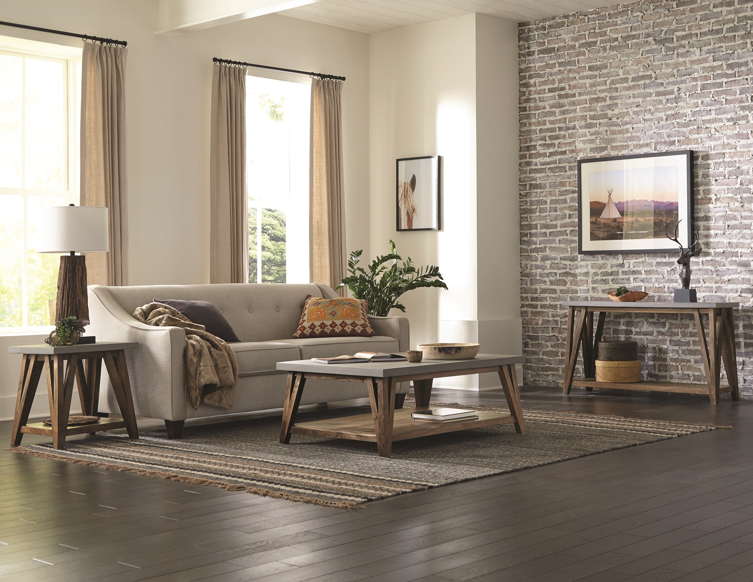 Decorate your living space with this new innovative collection. Modern, industrial Concrete-coated-topped tables with solid wood base and shelf will offer a fresh new look to your living room. We see this collection in a modern city loft or a transitional living room that needs just a pop of updated style. Sleek and clean, these pieces combine both style and functionality.