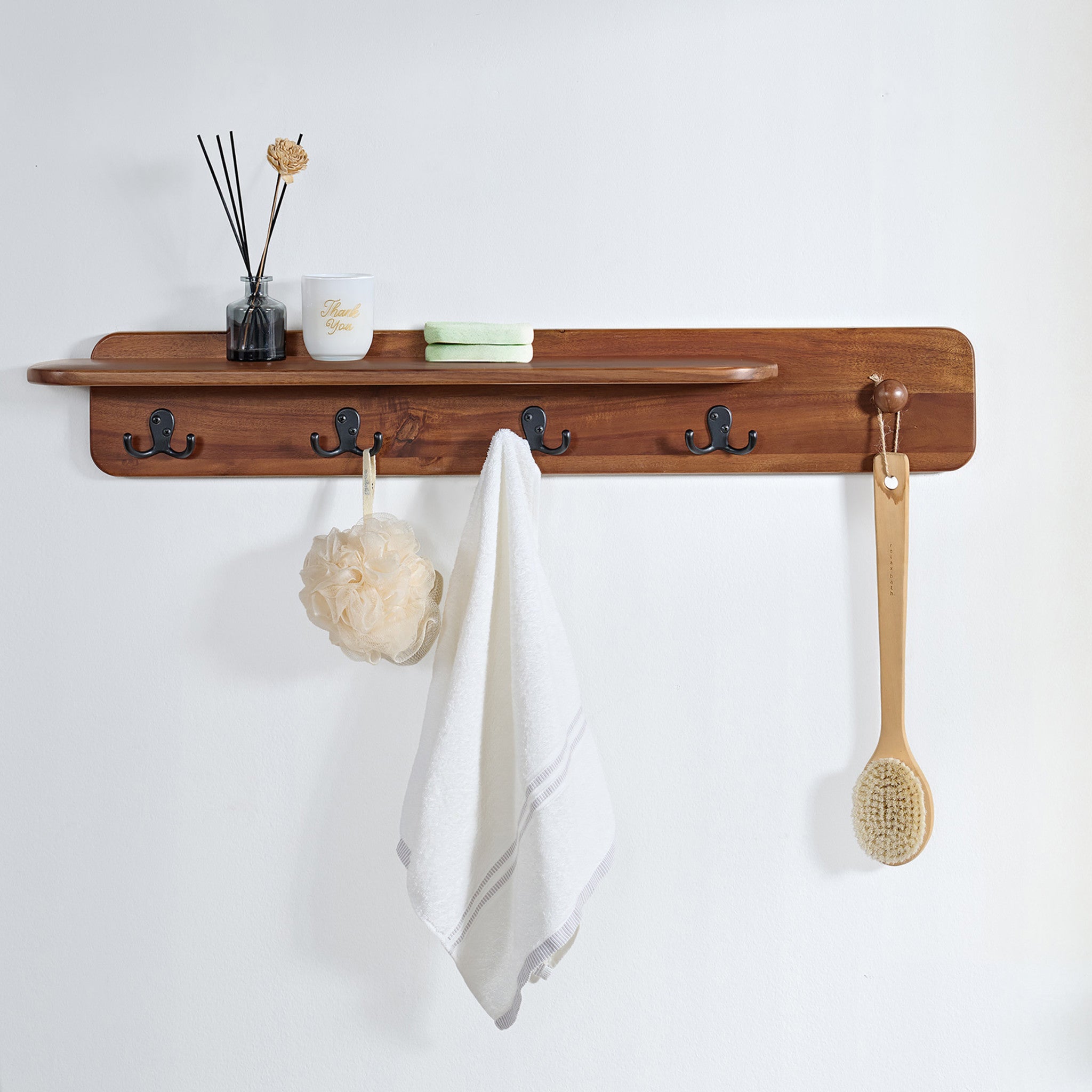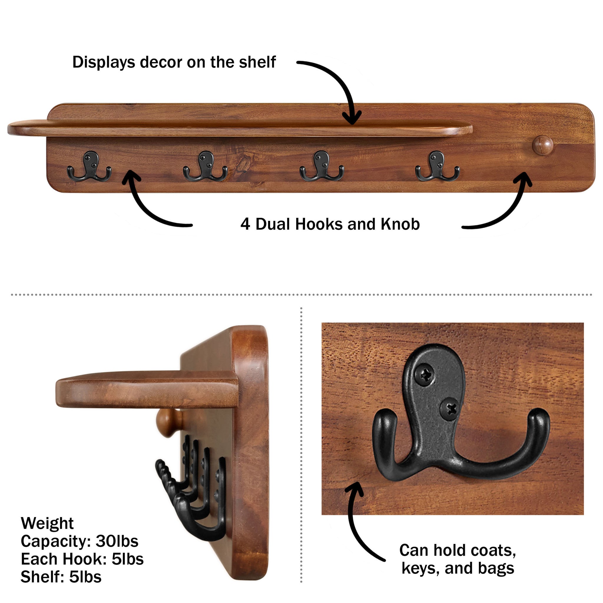 Achieve a high-end look with the Calais Collection 36-Inch Coat Rack Wall Mount by Alaterre Furniture. This wall coat rack with hooks is composed of solid acacia wood with a warm chestnut finish and clean lines that pair beautifully with a variety of styles, including coastal, modern, minimalist, and farmhouse furniture. The coat hooks wall mount feature a convenient shelf for displaying home décor overtop 4 dual wall hooks for coats, purses, keys, hats, dog leashes, or anything else you may need before leaving the house, supporting a total weight capacity of 30lbs.