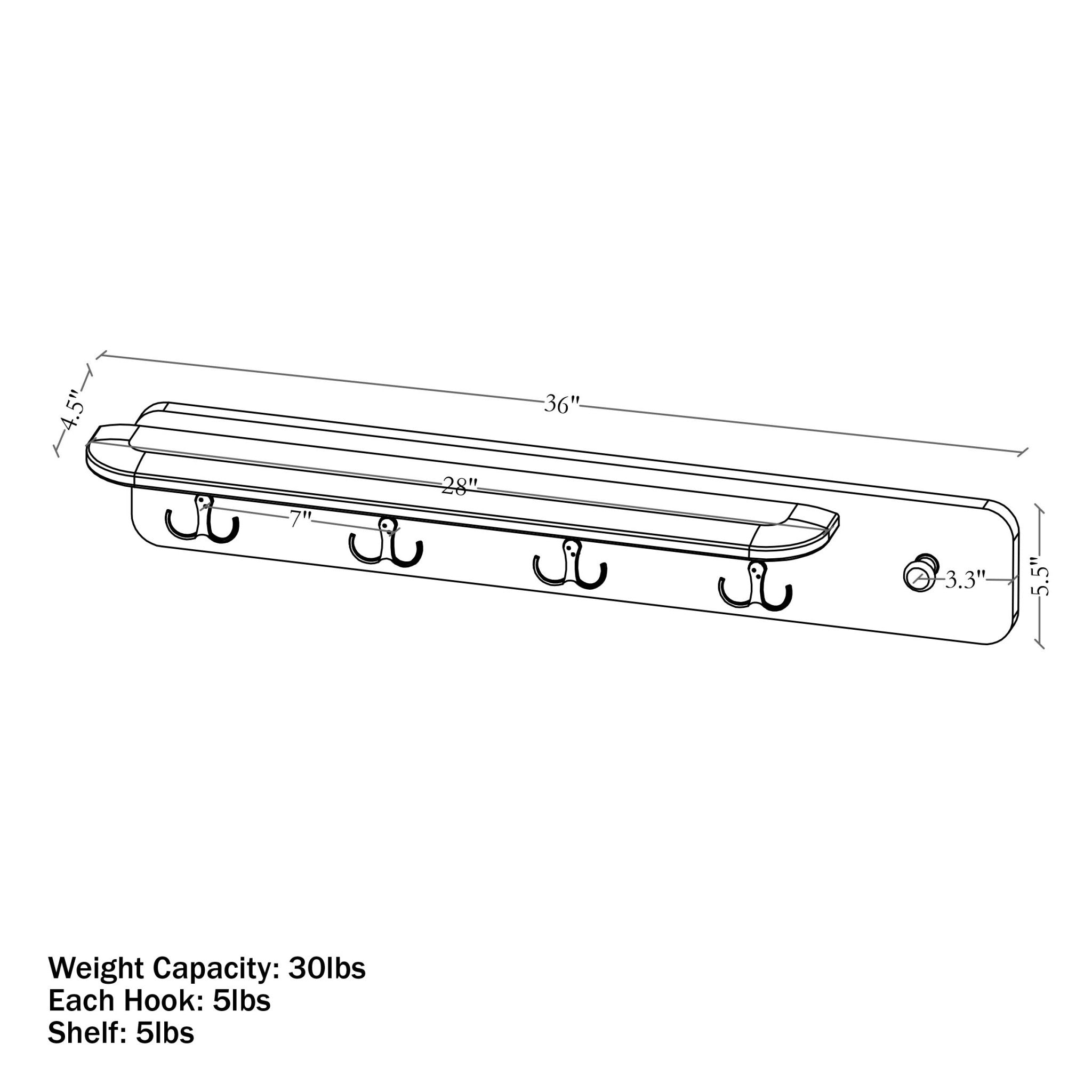 - Dimensions: (L) 36 x (W) 4.5 x (H) 5.5-inches; Product Weight: 4.6lbs; Weight Capacity: 30lbs; Each Hook: 5lbs; Shelf: 5lbs