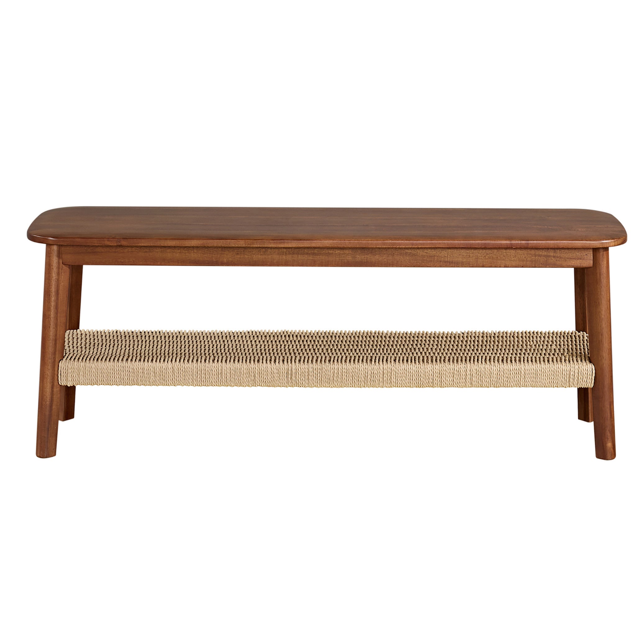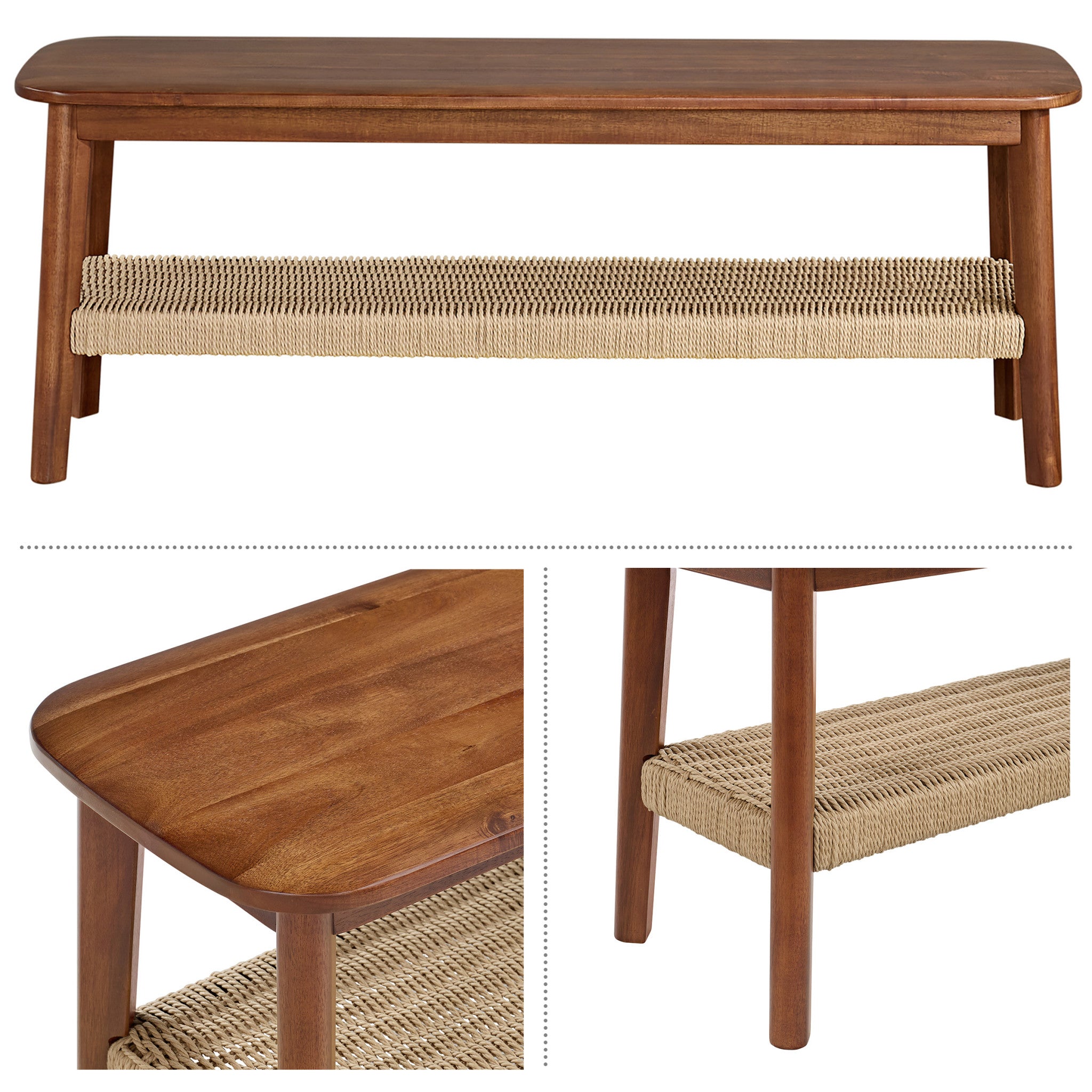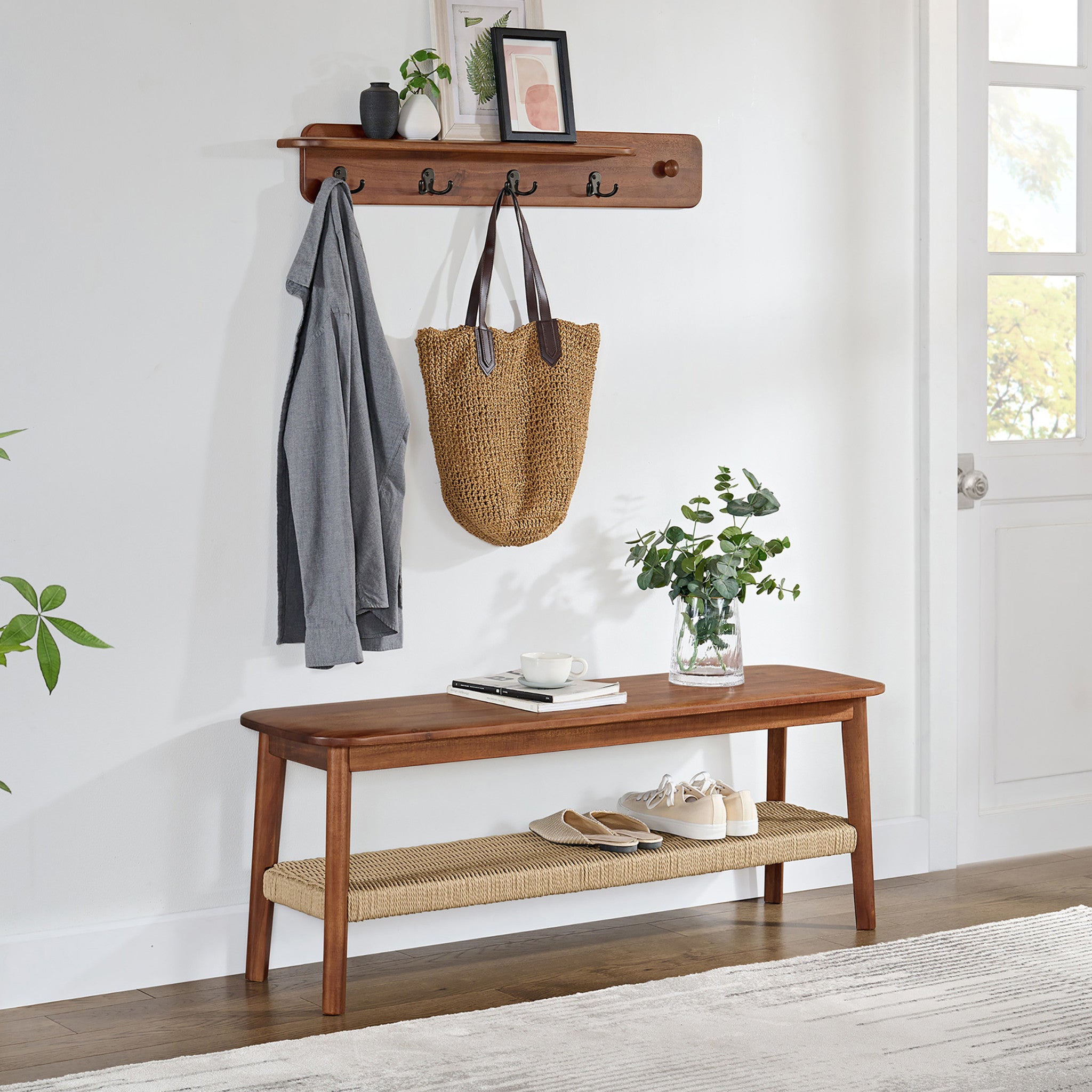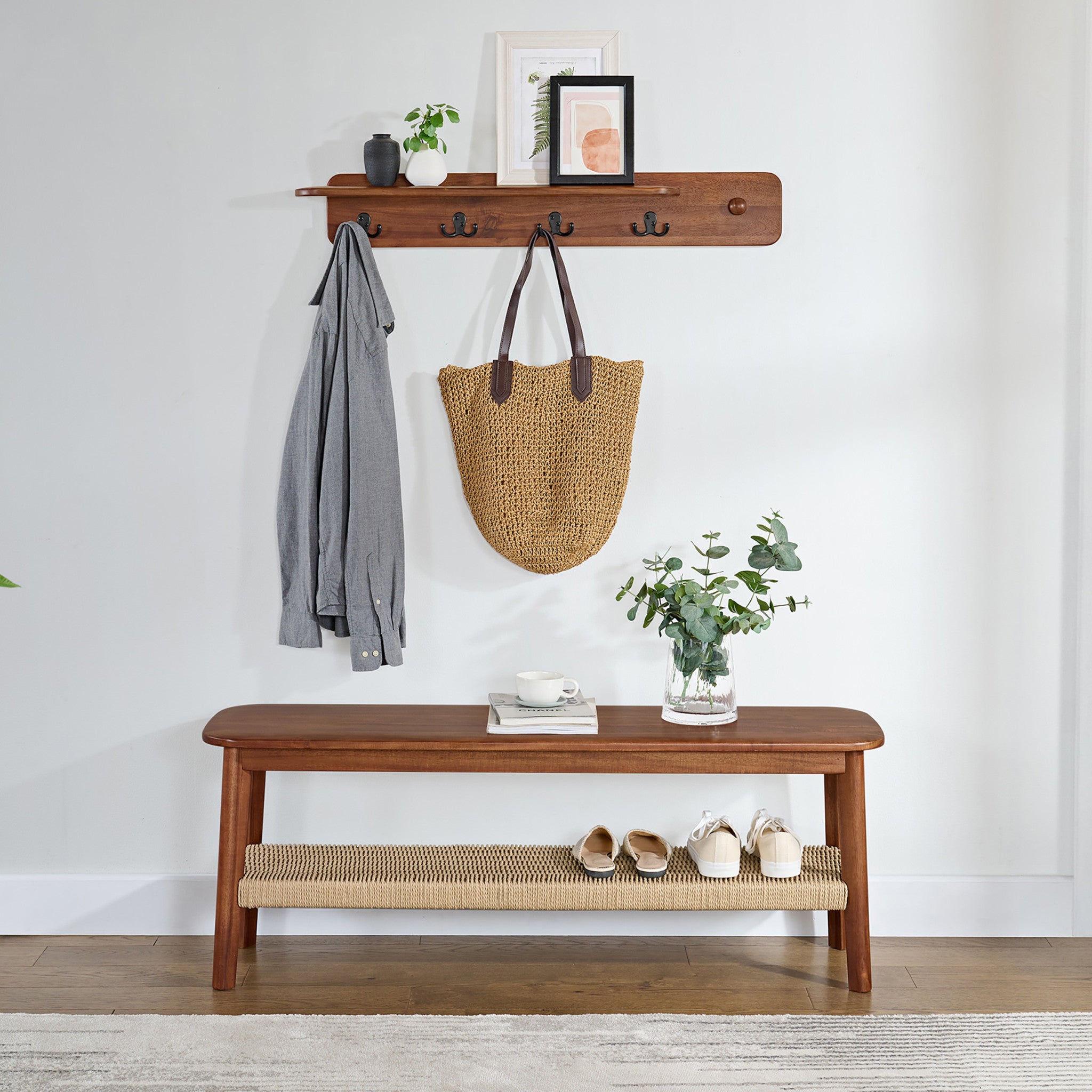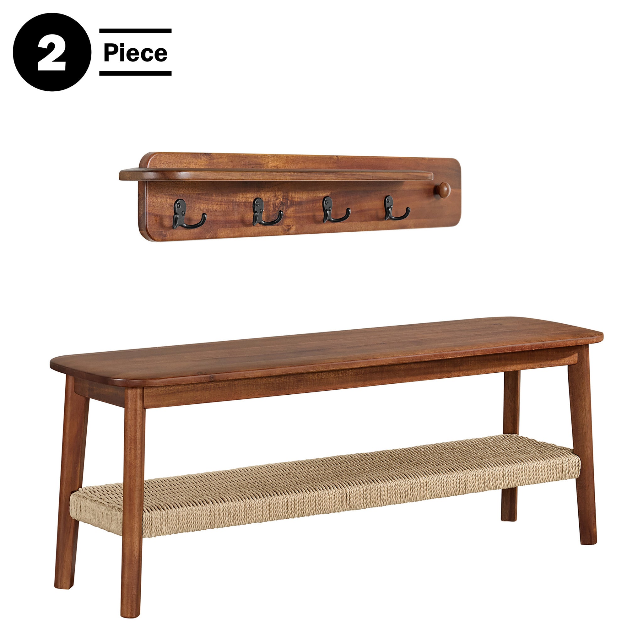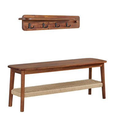 Achieve a high-end look with the Calais Collection Coat Rack with Bench Set by Alaterre Furniture. The shoe storage bench and coat hooks are both composed of solid acacia wood with a warm chestnut finish and clean lines that pair beautifully with a variety of styles, including coastal, modern, minimalist, and farmhouse furniture. The coat hooks wall mount is equipped with a convenient shelf for displaying home décor overtop 4 dual wall hooks for coats, purses, keys, hats, and more while the mudroom bench has a woven bottom shelf and angled legs, supporting a bench seat top with a weight capacity of 250lbs.
