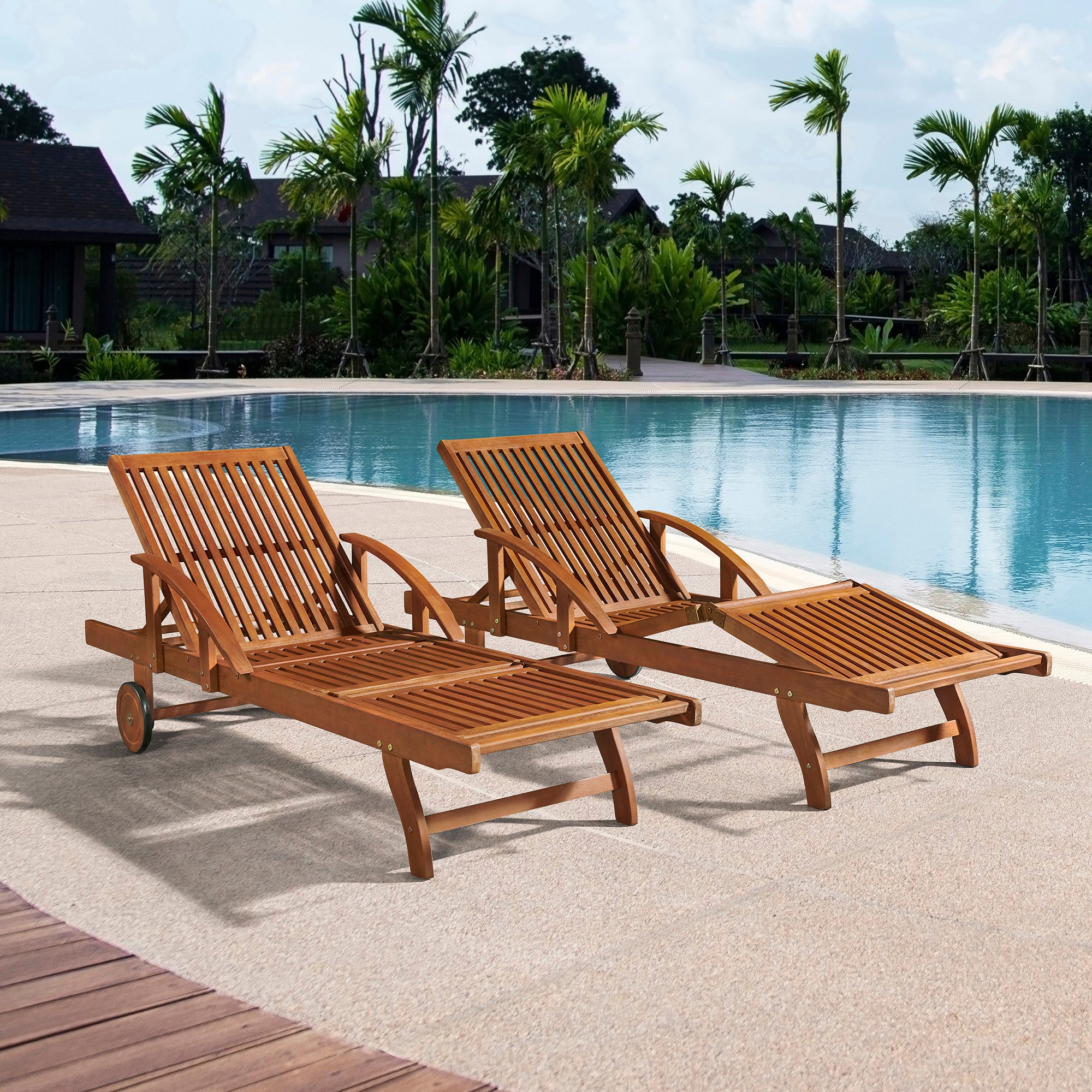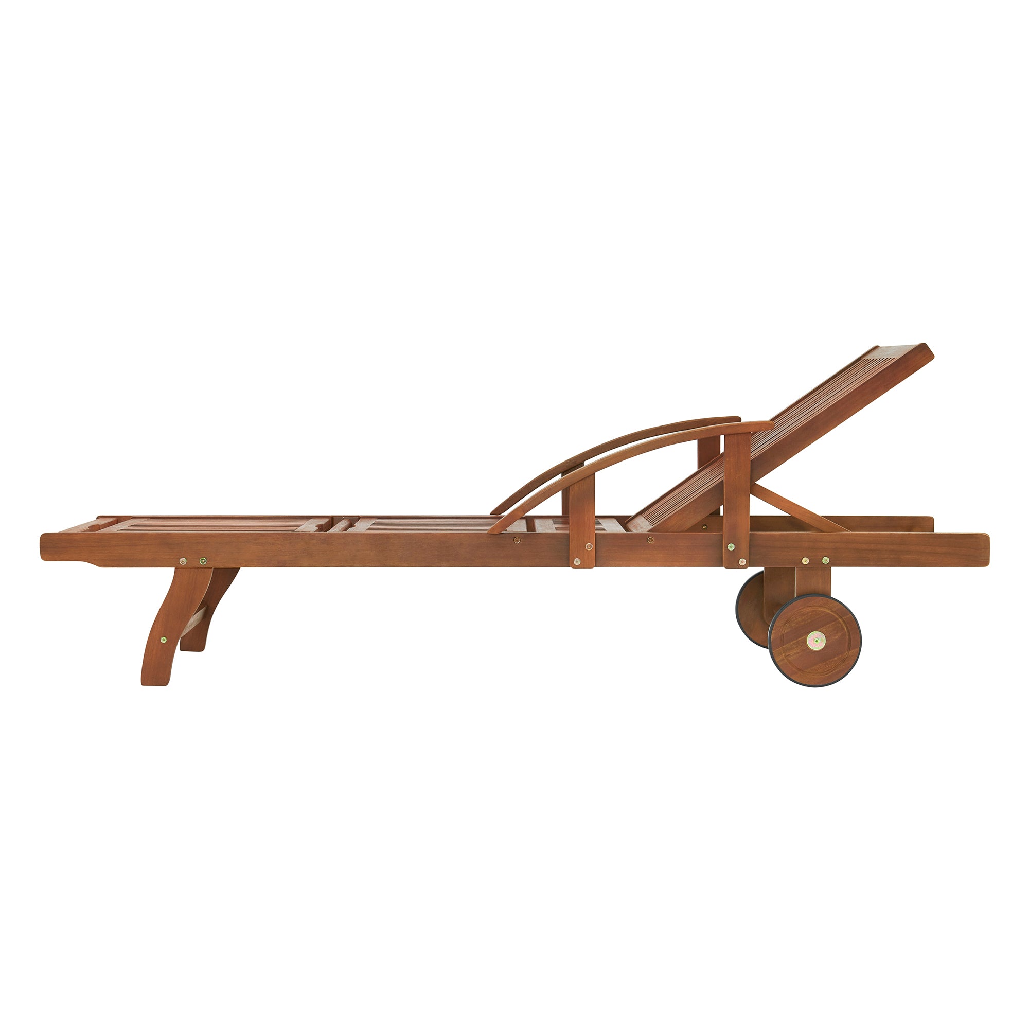 Add style and relaxation to your outdoor living space with this attractive Eucalyptus Wood Outdoor Reclining Chaise Lounge Chair. The lounge chair is made from durable eucalyptus wood that will stand up to varying weather conditions. Plus, it includes two wheels on the back, making transport a cinch. Its stylish design pairs seamlessly with any accent pieces in your outdoor space. These outdoor chaise lounges are the perfect way to add some relaxation to you patio and backyard.