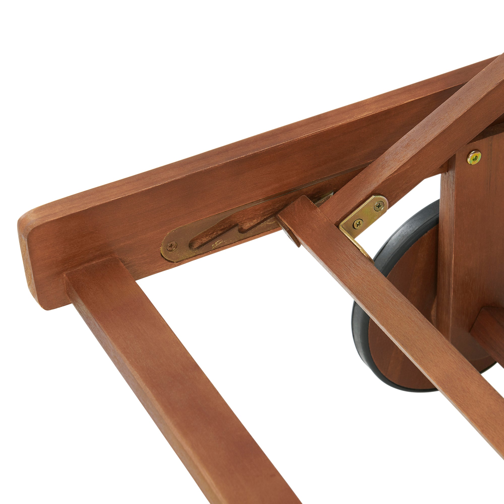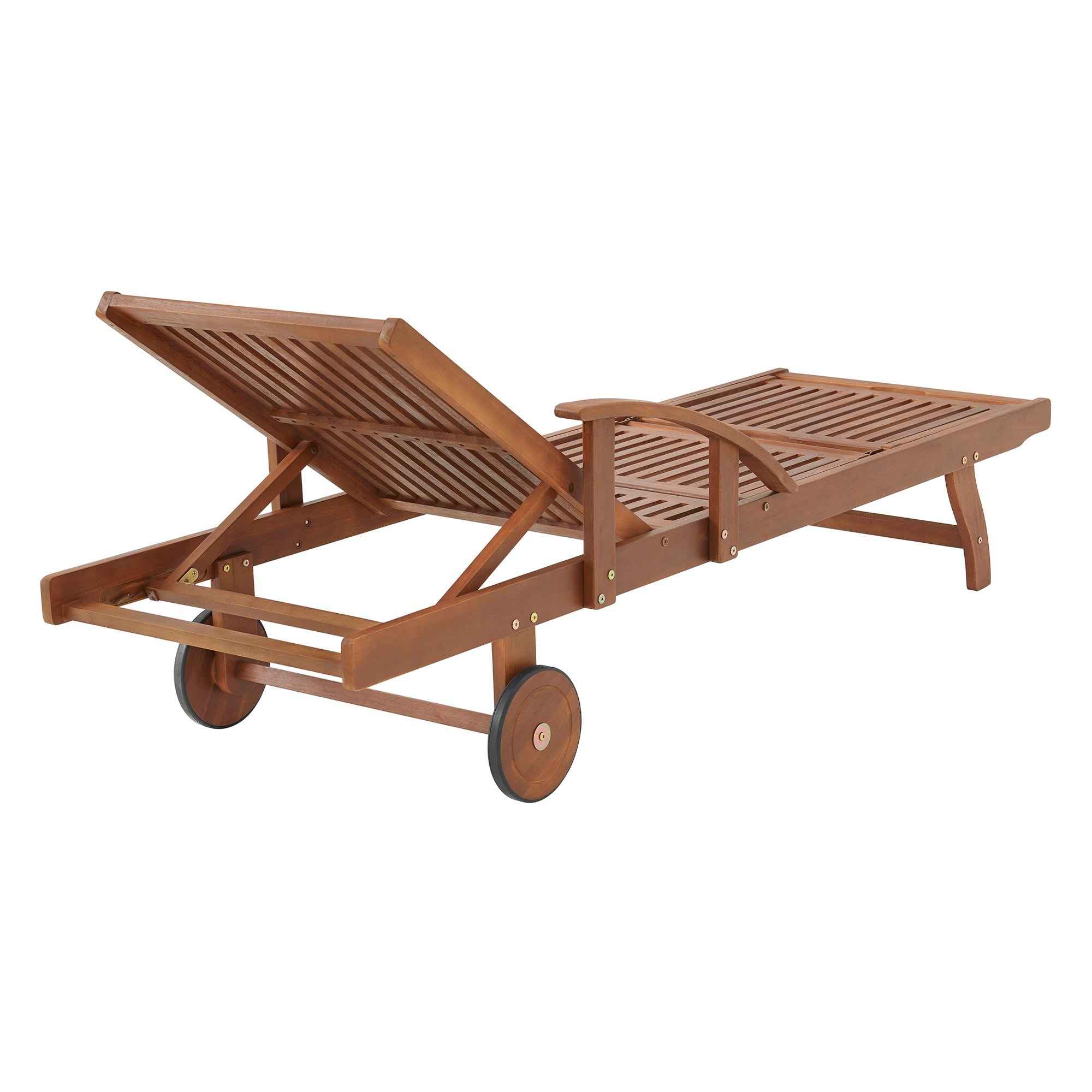 Add style and relaxation to your outdoor living space with this attractive Eucalyptus Wood Outdoor Reclining Chaise Lounge Chair. The lounge chair is made from durable eucalyptus wood that will stand up to varying weather conditions. Plus, it includes two wheels on the back, making transport a cinch. Its stylish design pairs seamlessly with any accent pieces in your outdoor space. This outdoor chaise lounge is the perfect way to add some relaxation to you patio and backyard.