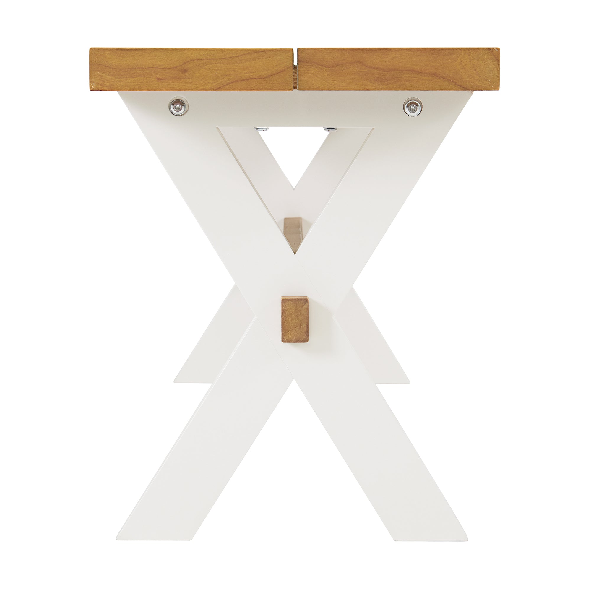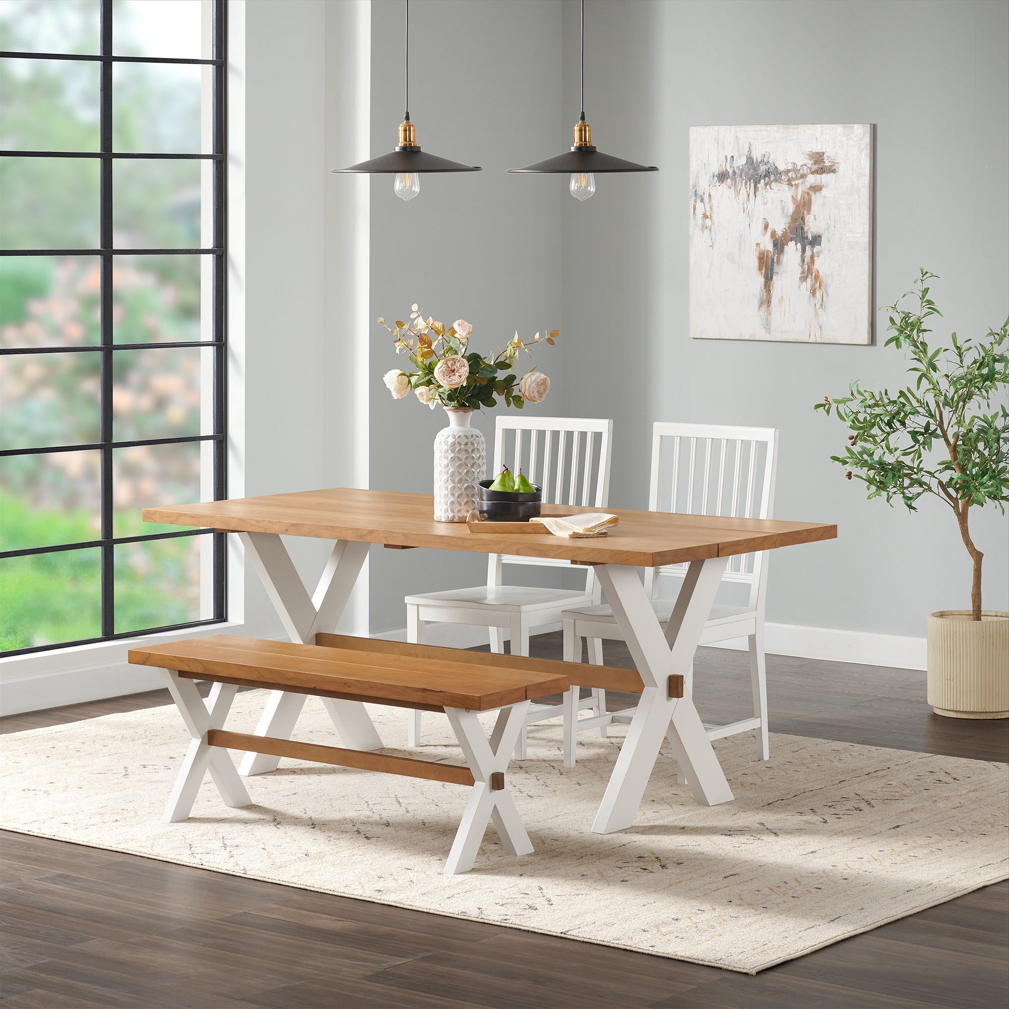 Enjoy making memories around this gorgeous dining table with bench and two dining chairs. This versatile and neutral design goes well with many aesthetics from modern farmhouse to coastal retreat. The two-tone finish on the table and bench serves up twice the charm and character. The table and bench feature a sturdy construction with X-leg trestle base. Constructed of solid birch, composite wood and cherry veneer. The solid white slatted back chairs are the perfect compliment to this set.