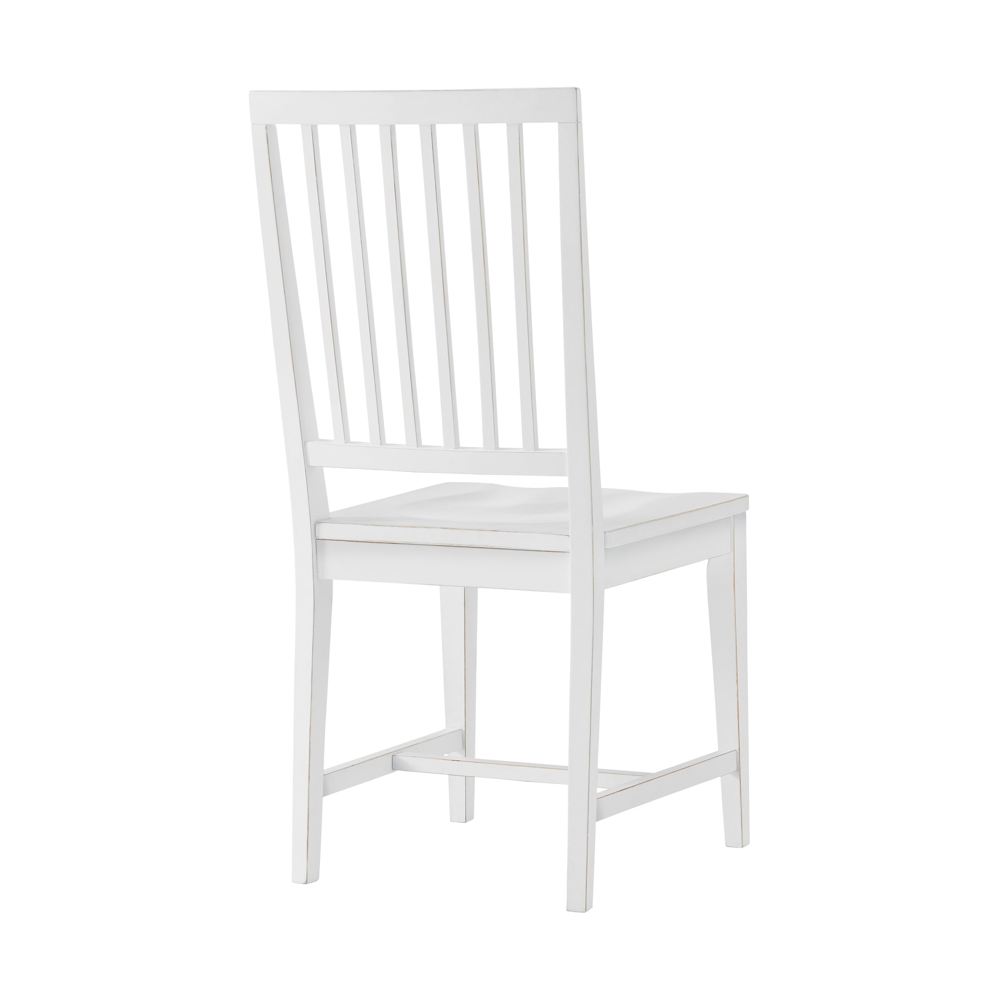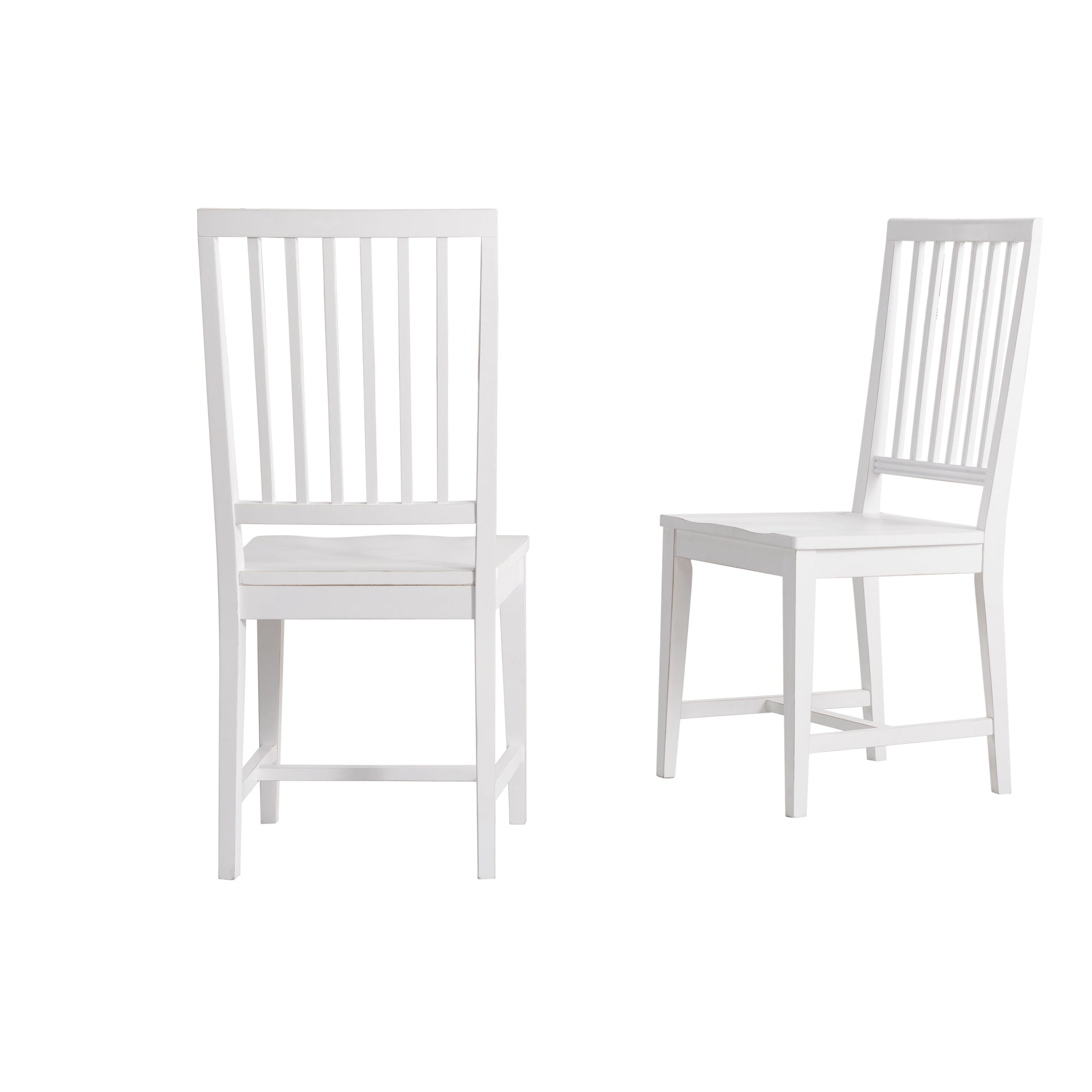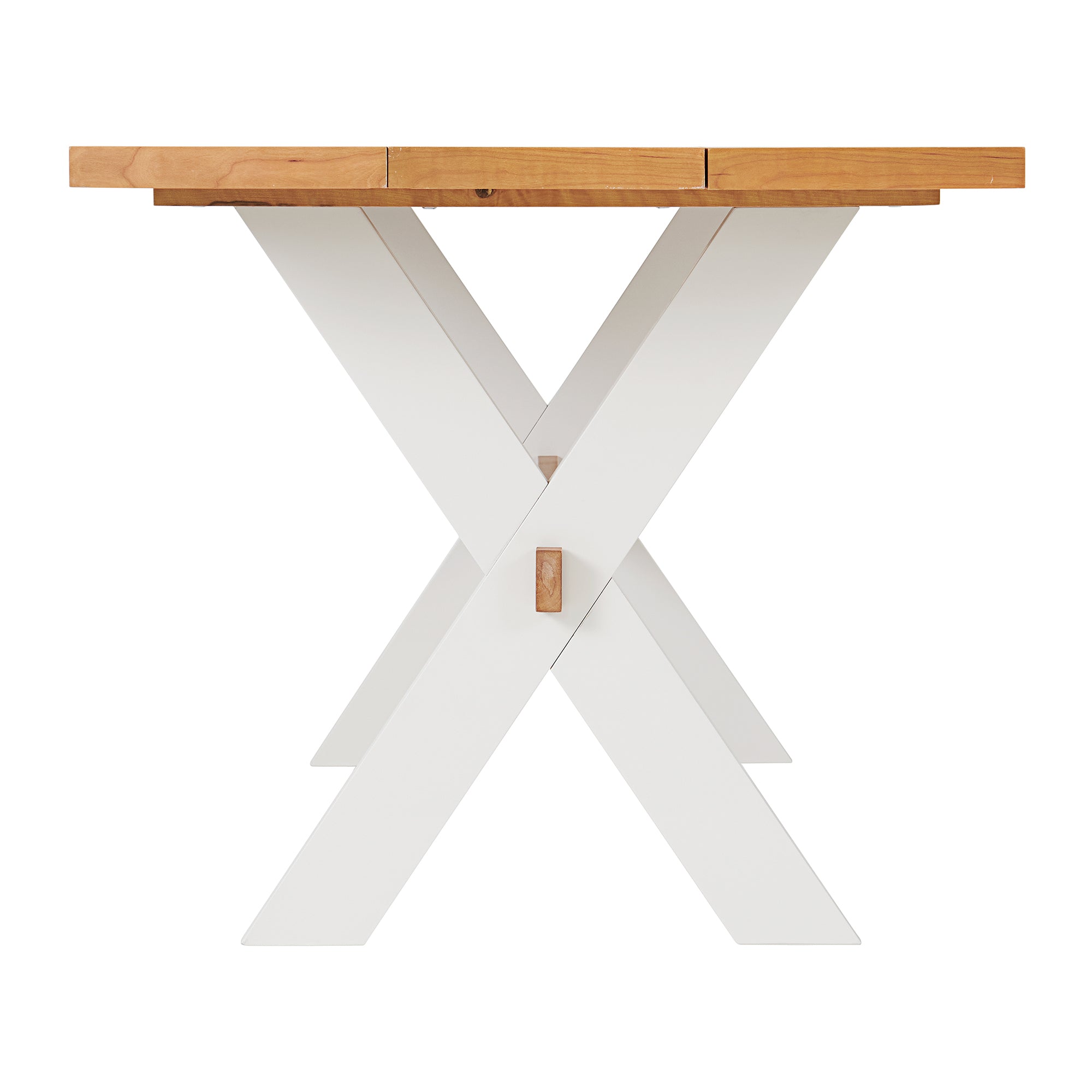 Enjoy making memories around this gorgeous dining table with four dining chairs. This versatile and neutral design goes well with many aesthetics from modern farmhouse to coastal retreat. The two-tone finish serves up twice the charm and character. The table feature a sturdy construction with X-leg trestle base. Constructed of solid birch, composite wood and cherry veneer. The solid white slatted back chairs are the perfect compliment to this set.