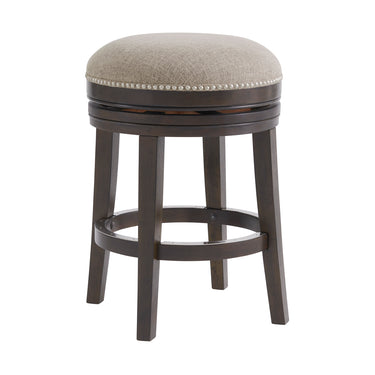 Simple yet full of style this counter height stool will be the perfect accent to your home. This stool is the perfect addition to your bar, kitchen island or bistro table. It features a backless design, a built-in footrest, 360-degree swivel range, and nail head trim. Exquisitely crafted from rubberwood and linen like upholstery. This stool features legs that are flared for stability and a metal-plated footrest for durability. Easily tuck in this backless stool to keep your look clean.