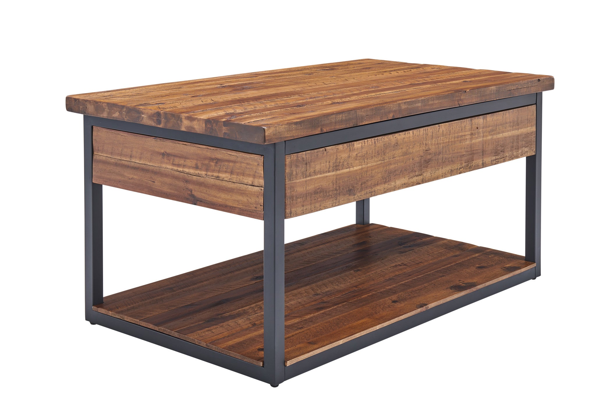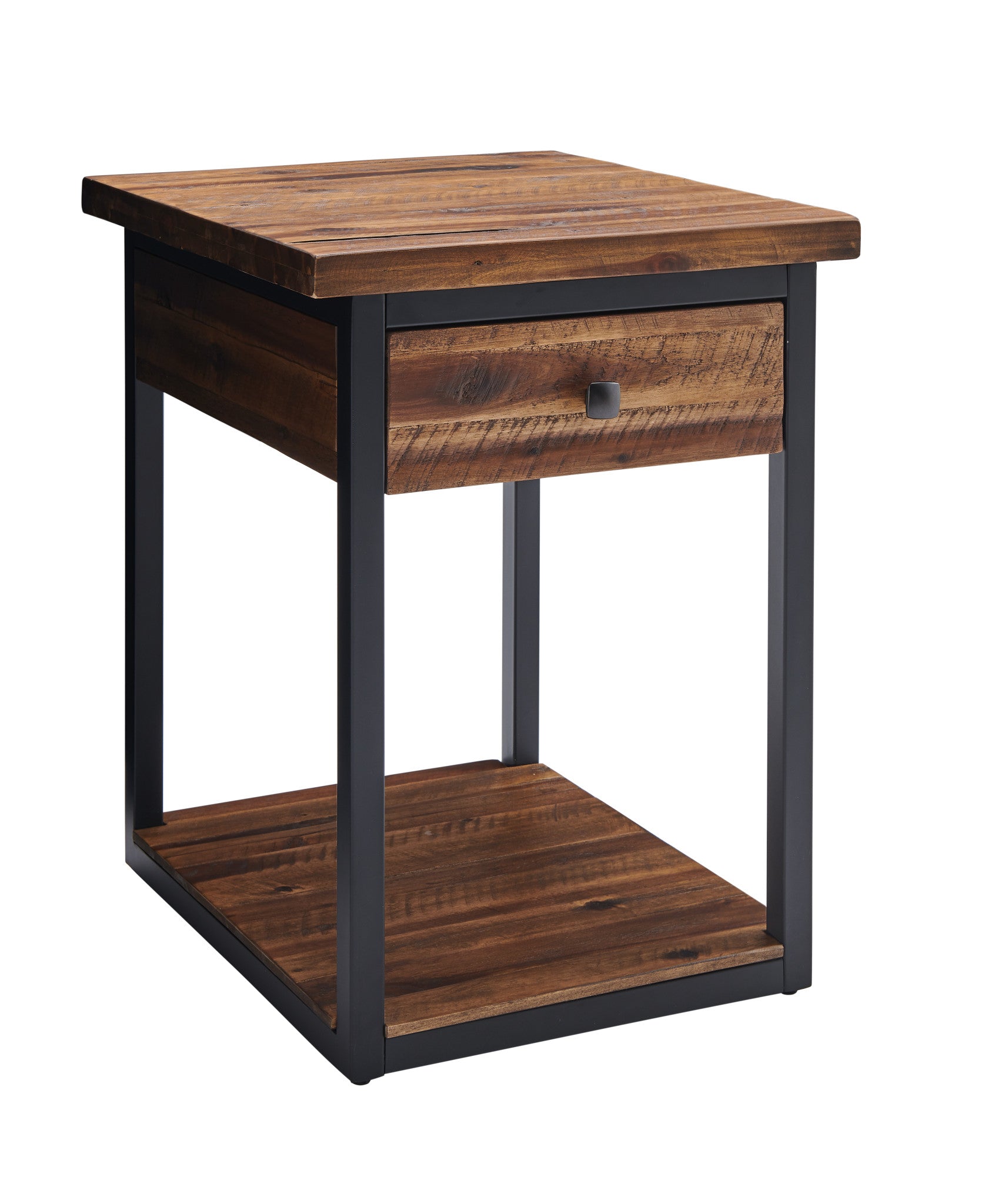 This collection of rustic wood and metal provides unpolished elegance to your space. With functional drawers and a low shelf each piece is uniquely yours. Knots, cracks and even rough-hewn edges showcase the wood's original qualities. Our lacquer finish with light and dark tones allows for the wood's natural grain to show through. This collection of accent furniture will make a statement in your living space.
