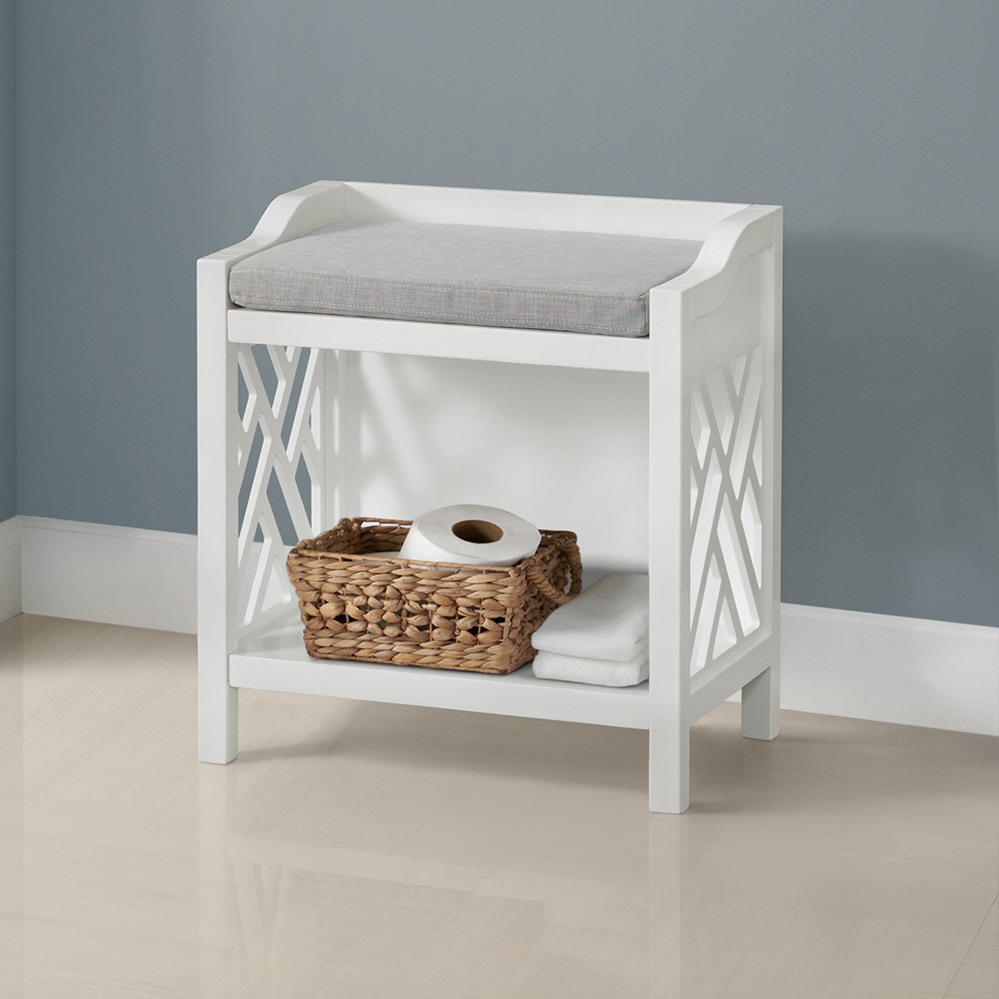 - Use the small bench in the bathroom to hold towels or toiletries, in the living room for remotes or books, by a vanity as a makeup stool, or near an entryway to sit while putting on shoes