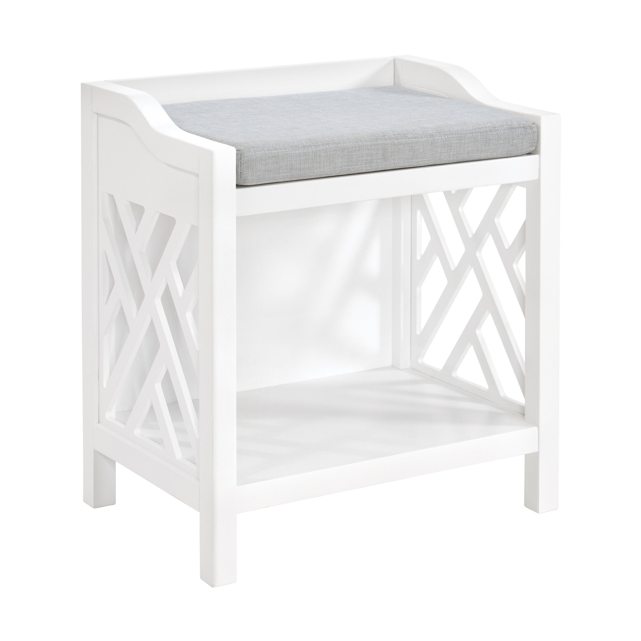 - This shoe bench features a comfortable seat cushion with a storage shelf underneath for shoes, toiletries, books, makeup, and more