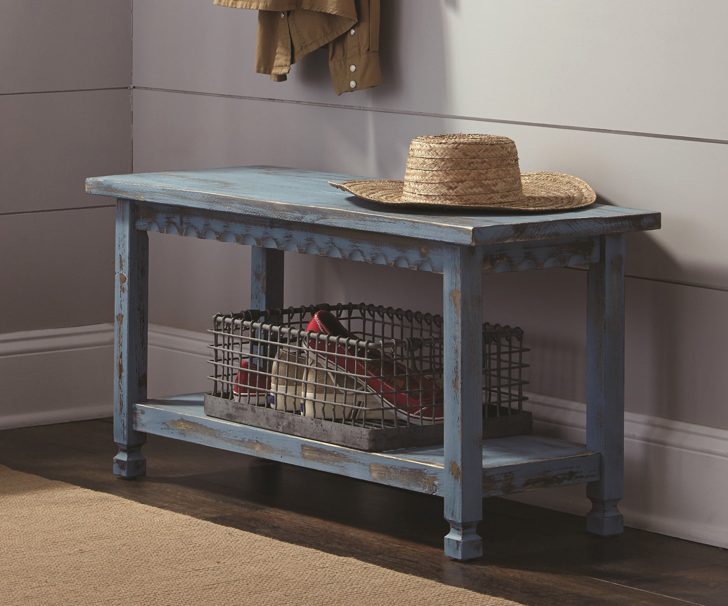 - DISTRESSED ANTIQUE BLUE BENCH – The hand-applied weathered finish delivers a reclaimed wood look that’s rich in farmhouse character. Its distressed antique blue tone pairs beautifully with both modern farmhouse and rustic cottage furniture.