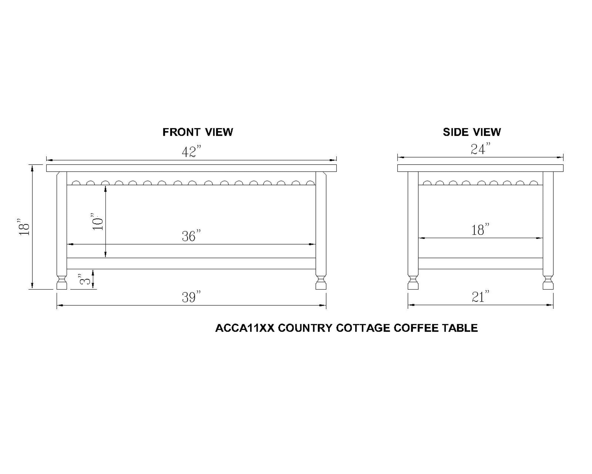 Country cottage collection will be a charming addition to your home's decor. Country Cottage has a weathered finish; each piece is uniquely yours. With its detailed dental work, square legs and wood construction, each piece will be unique in your living space. Distressed finish coffee table offers farmhouse style and functional design. This coffee table is the perfect size in front of your sofa and you can keep items out of sight on the bottom shelf.