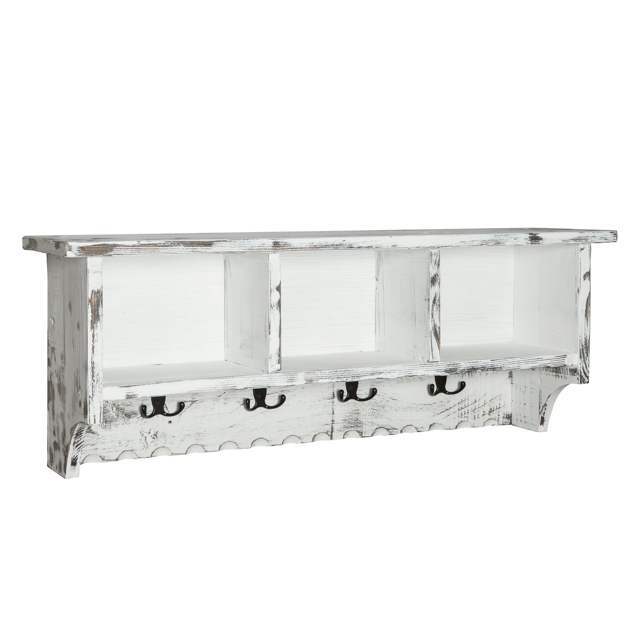 - [STORAGE AND STYLE] Features three spacious cubbies sized 10" w x 9" d x 7" h, perfect for storing essentials; antique white finish and distressed wood enhance the rustic charm of any entryway