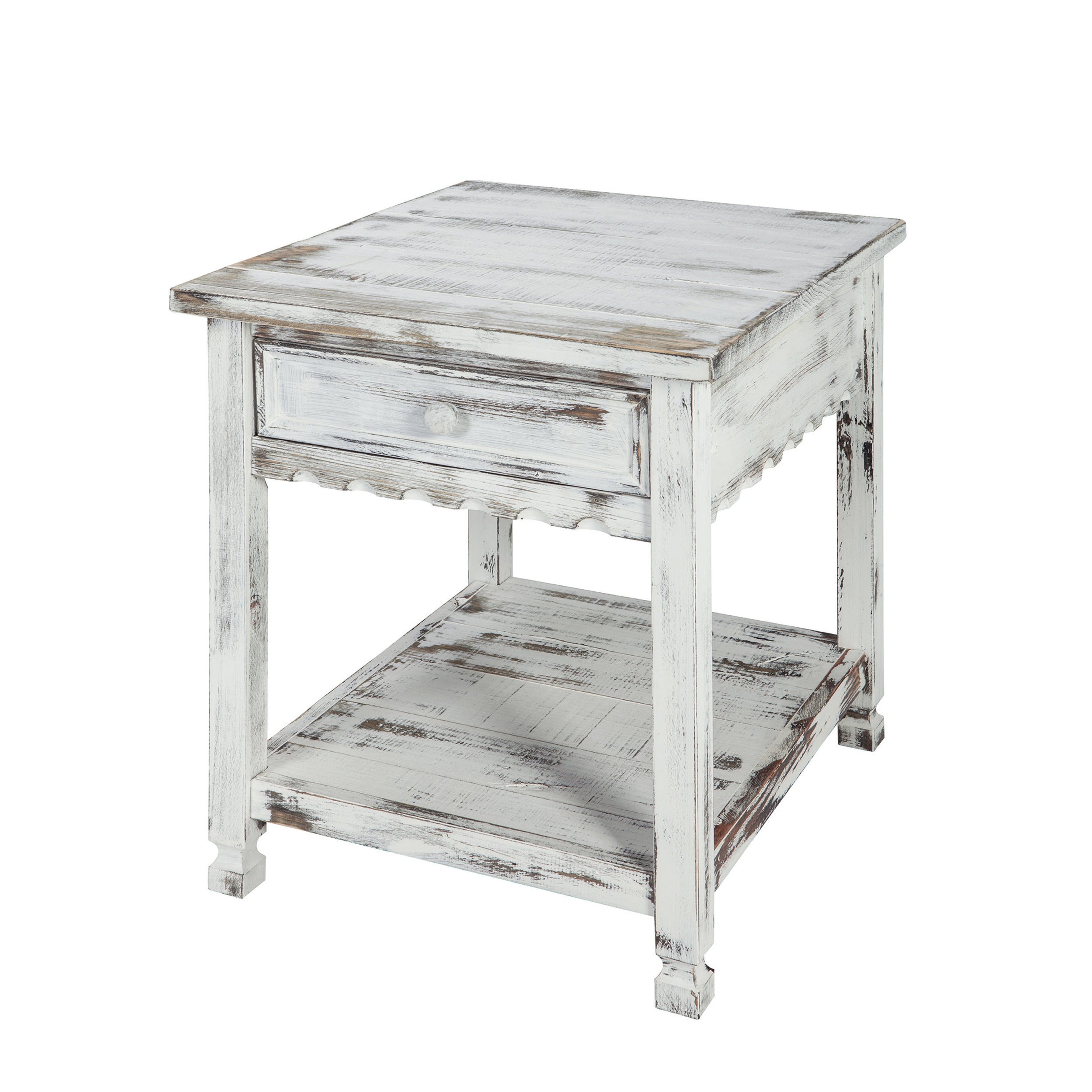 - [WEATHERED ELEGANCE] Boasts a weathered, rustic white antique finish that captures the essence of a well-loved heirloom; this end table is a perfect blend of functionality and antique charm, enhancing any room with its visual appeal and farmhouse style