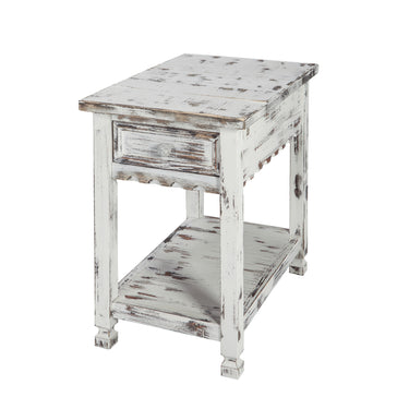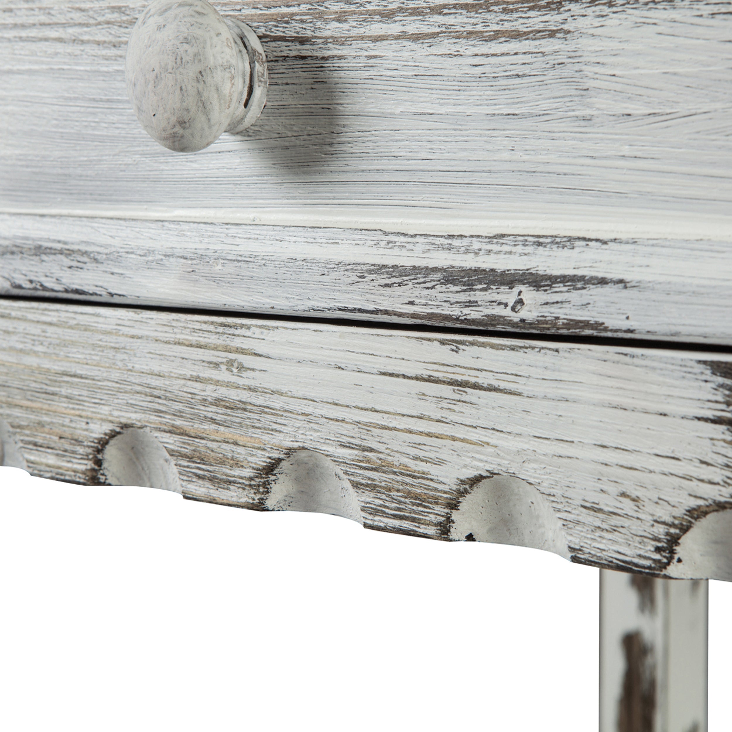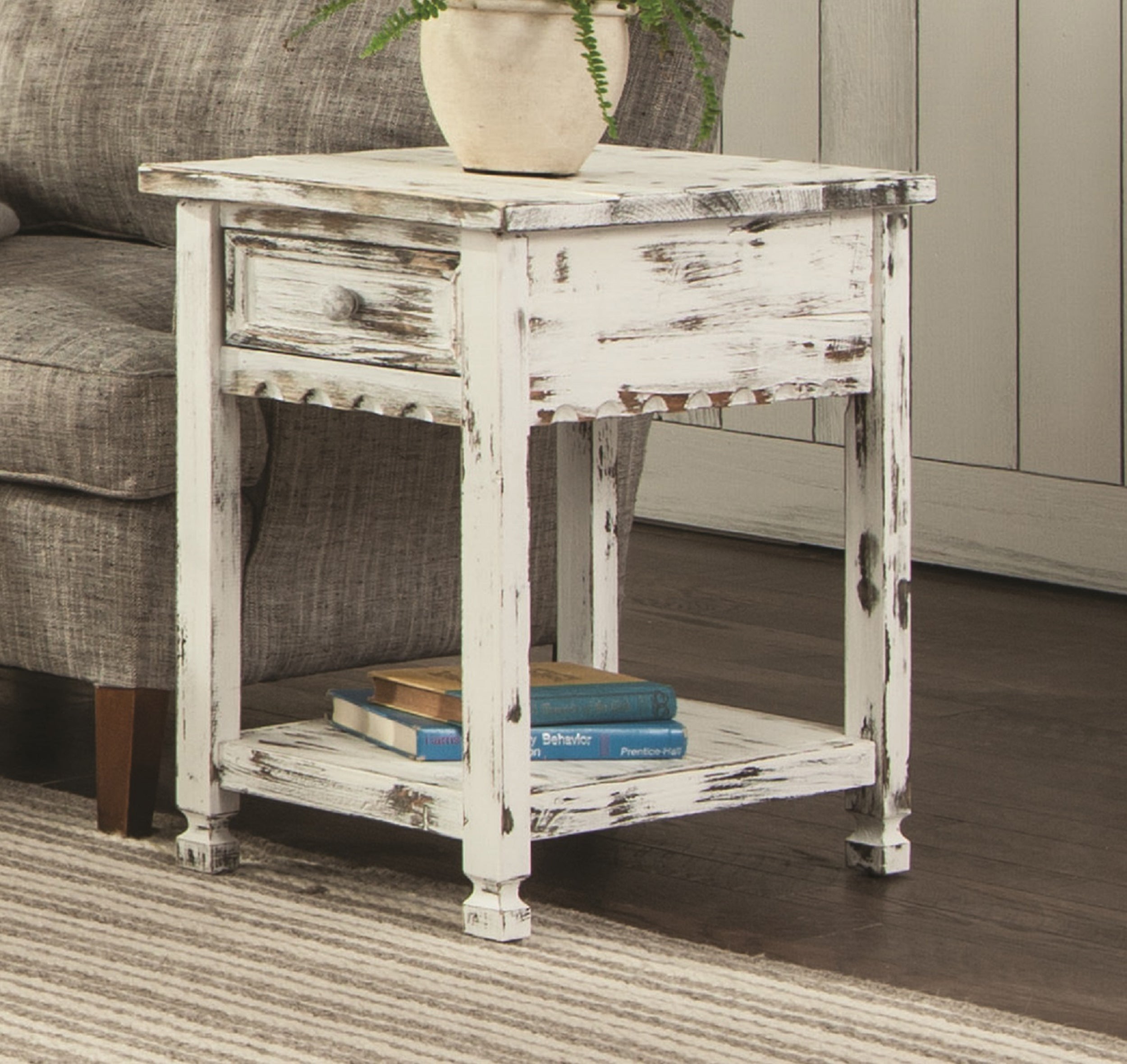 - WHITE SIDE TABLE – Bring rustic elegance to your home with this distressed white country cottage chairside end table. Featuring a rectangular top with carved scalloped edging and turned legs with square block detail at the bottom, this piece adds timeless farmhouse character to any living room, bedroom, or entryway.