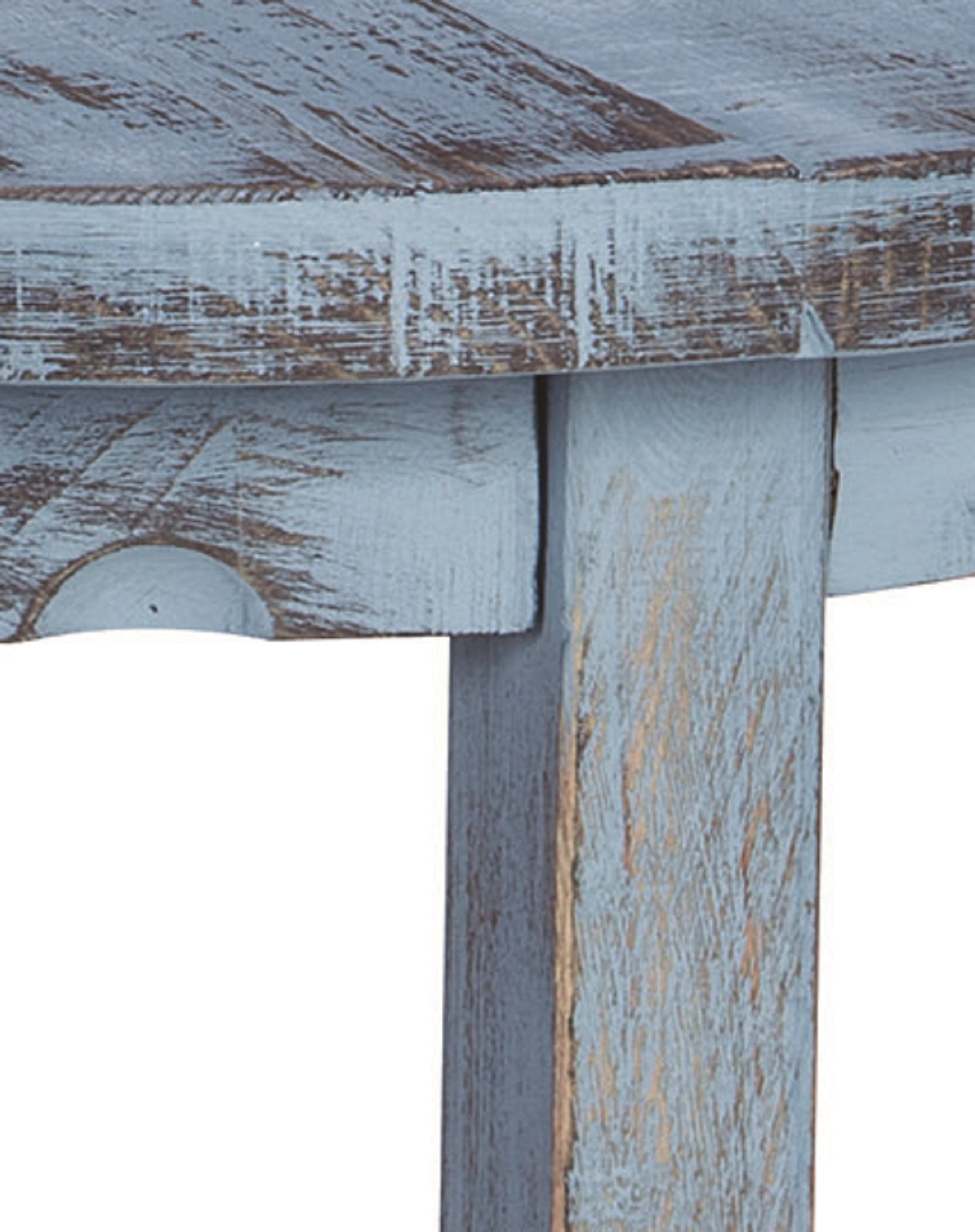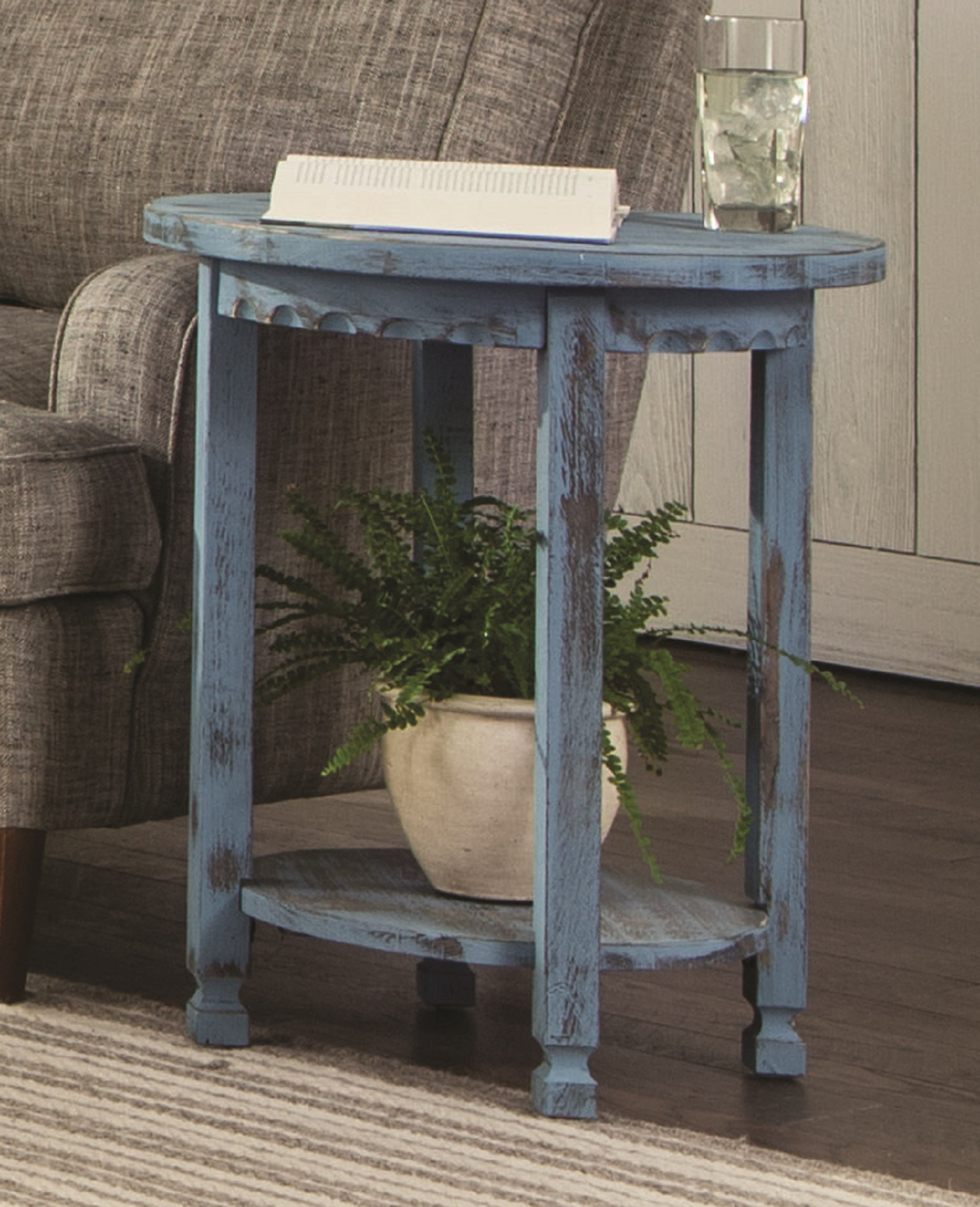 - [Rustic Elegance] Elevate your living room decor with this Alaterre Furniture Rustic Cottage Round End Table; featuring a distressed blue finish and intricate dental work, this piece perfectly blends traditional design with a modern twist; ideal for placing next to your sofa or favorite chair, it serves as a stylish spot for lamps, drinks, or decorative items