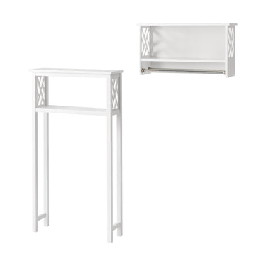 • Bath shelf with towel rods overall dimensions: 25"W x 9"D x 14"H; over toilet open storage shelf dimensions: 27"W x 8"D x 48"H