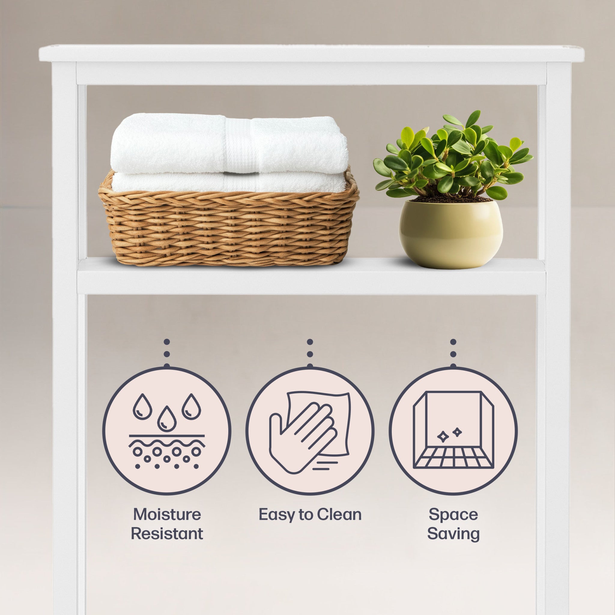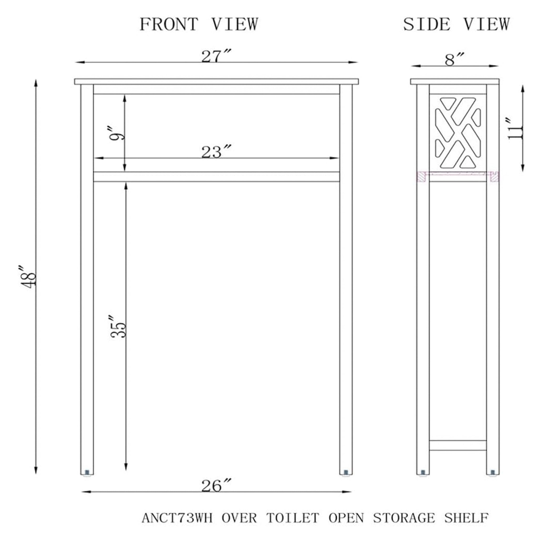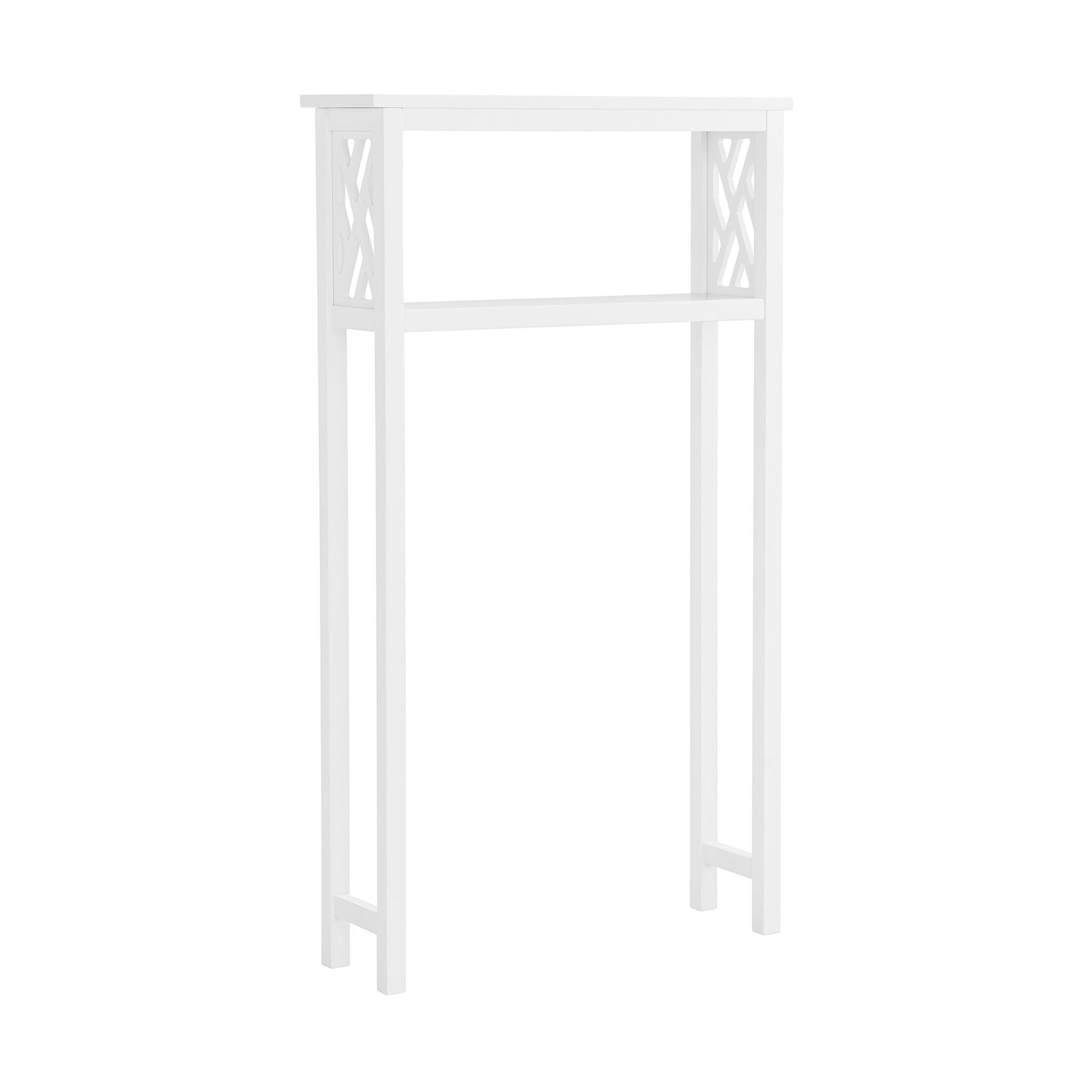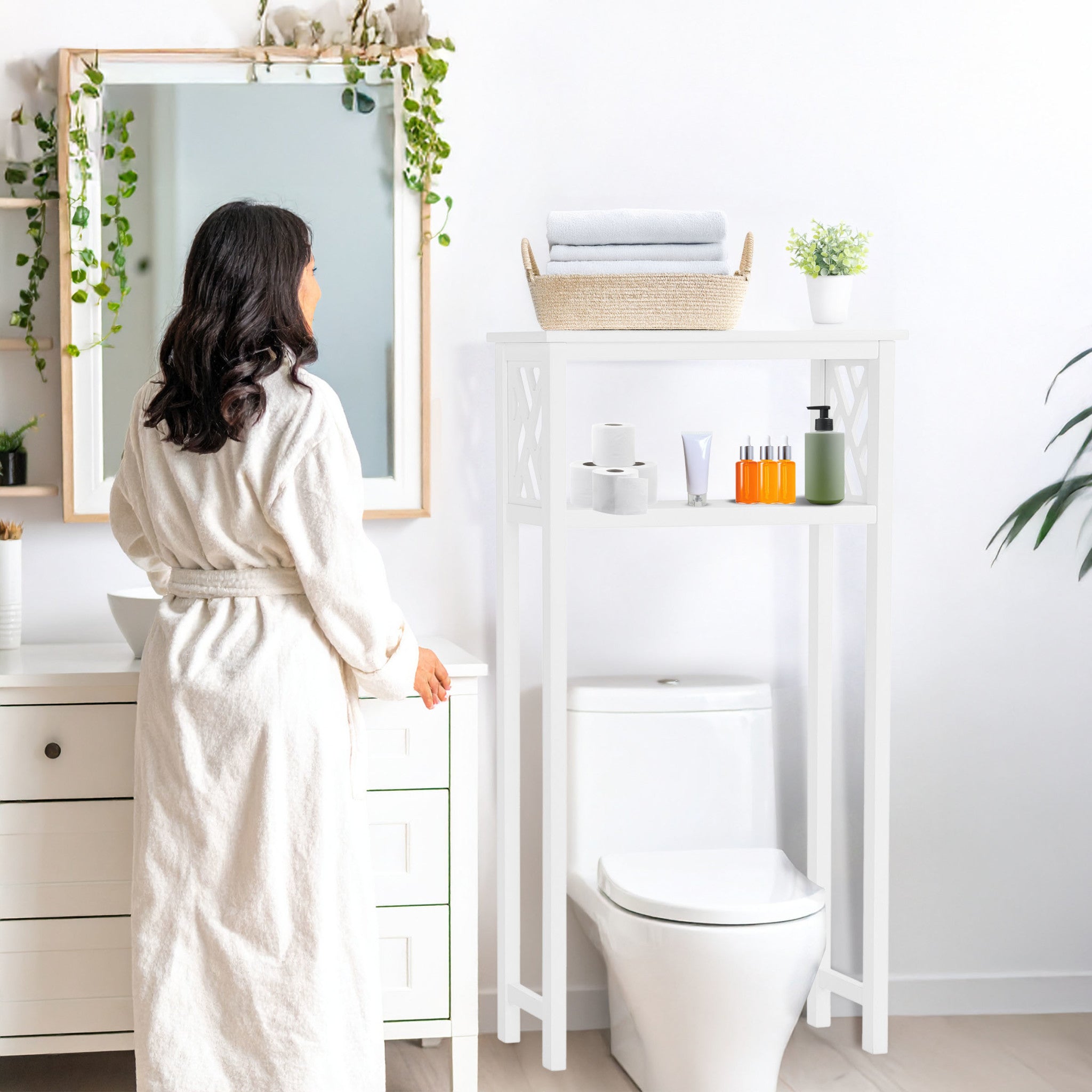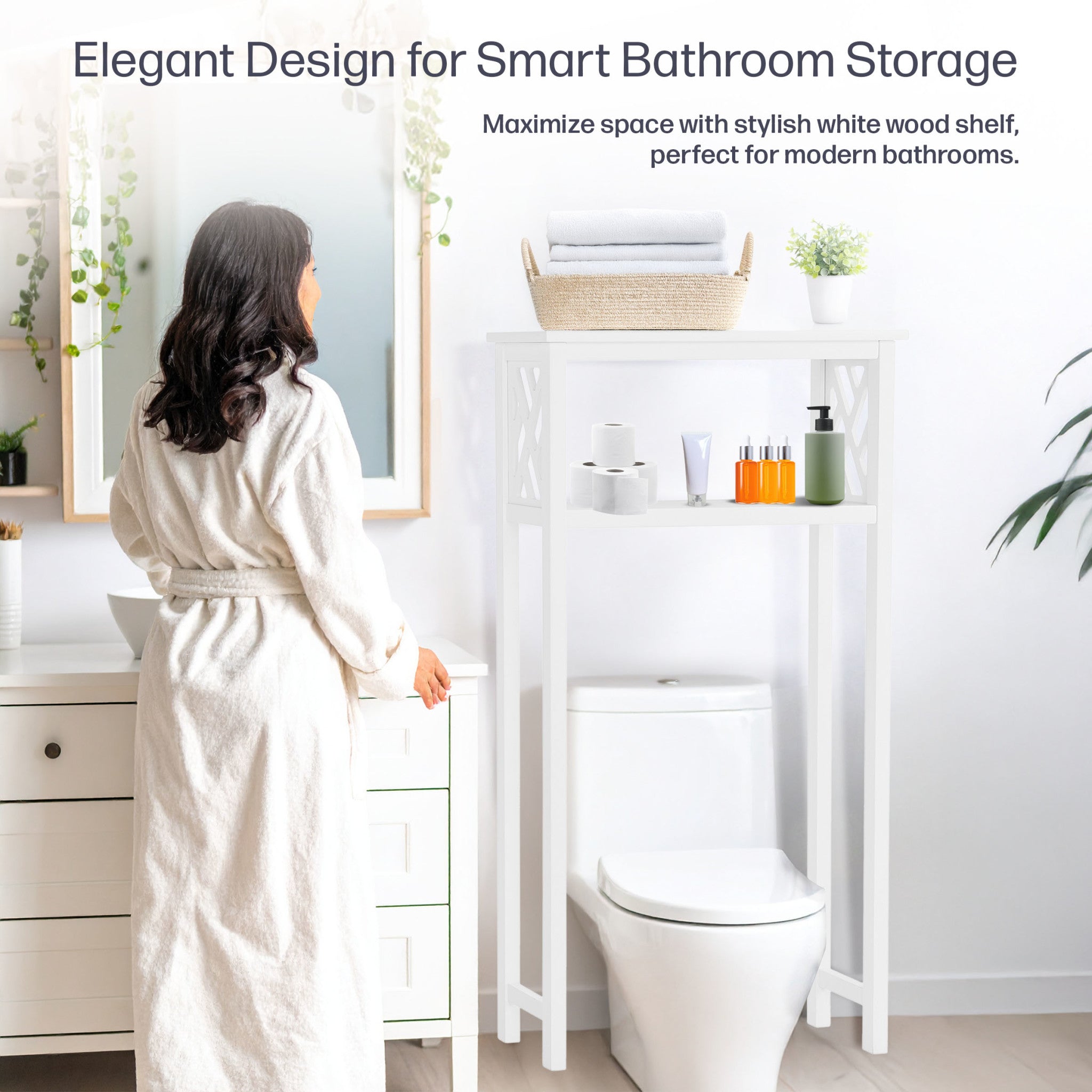 - Featuring clean lines, a white painted finish, and a decorative side-element, our bathroom shelves over toilet are an ideal addition to any restroom