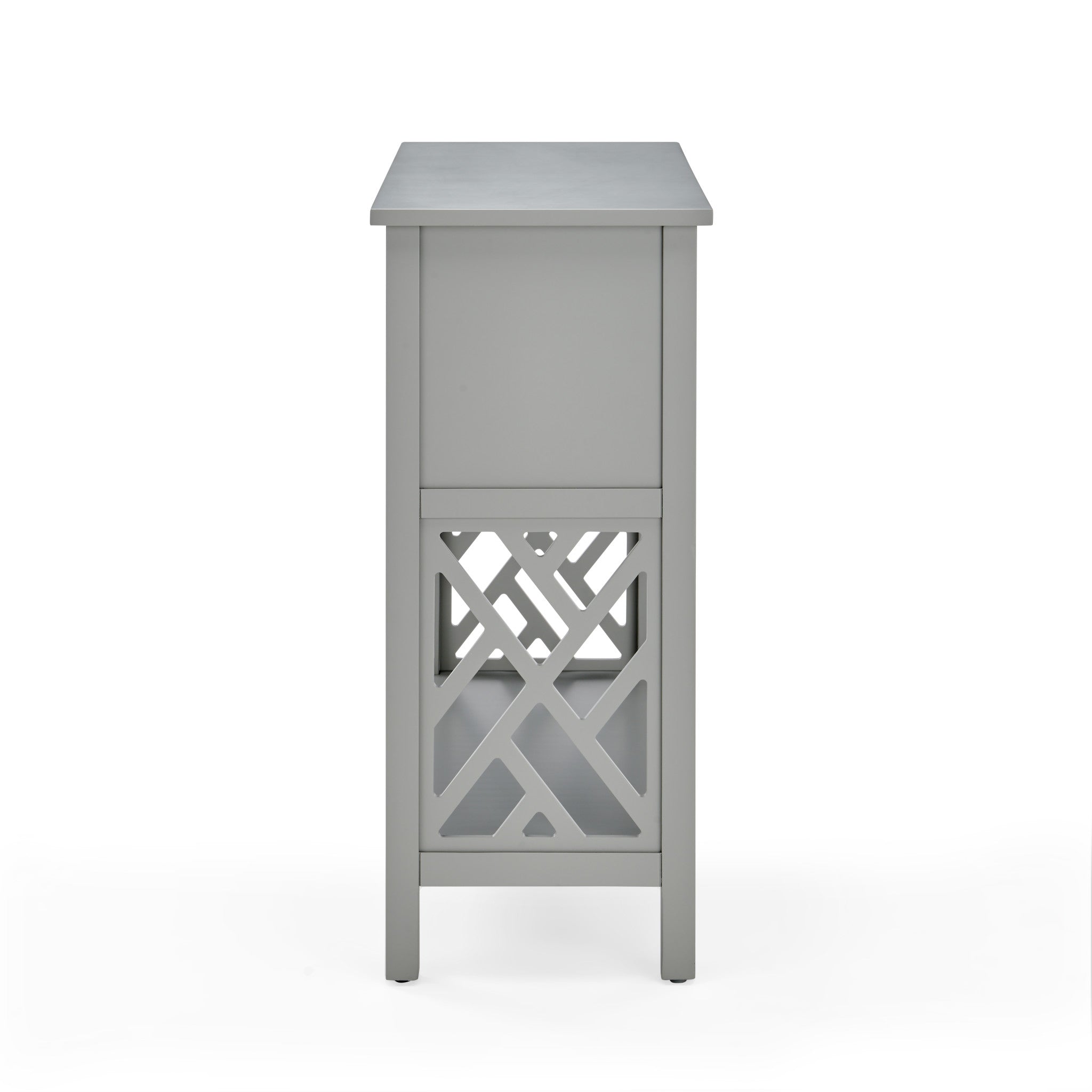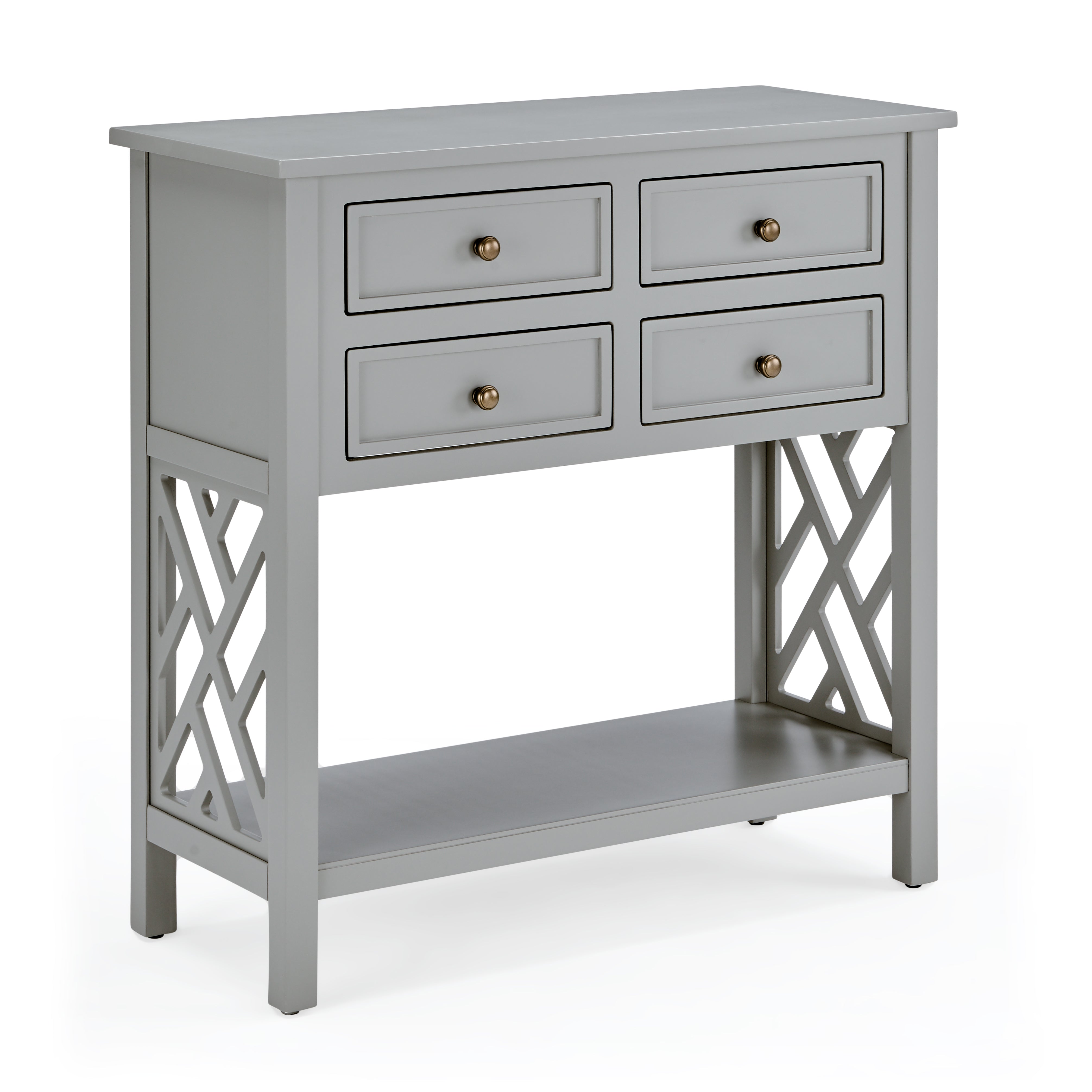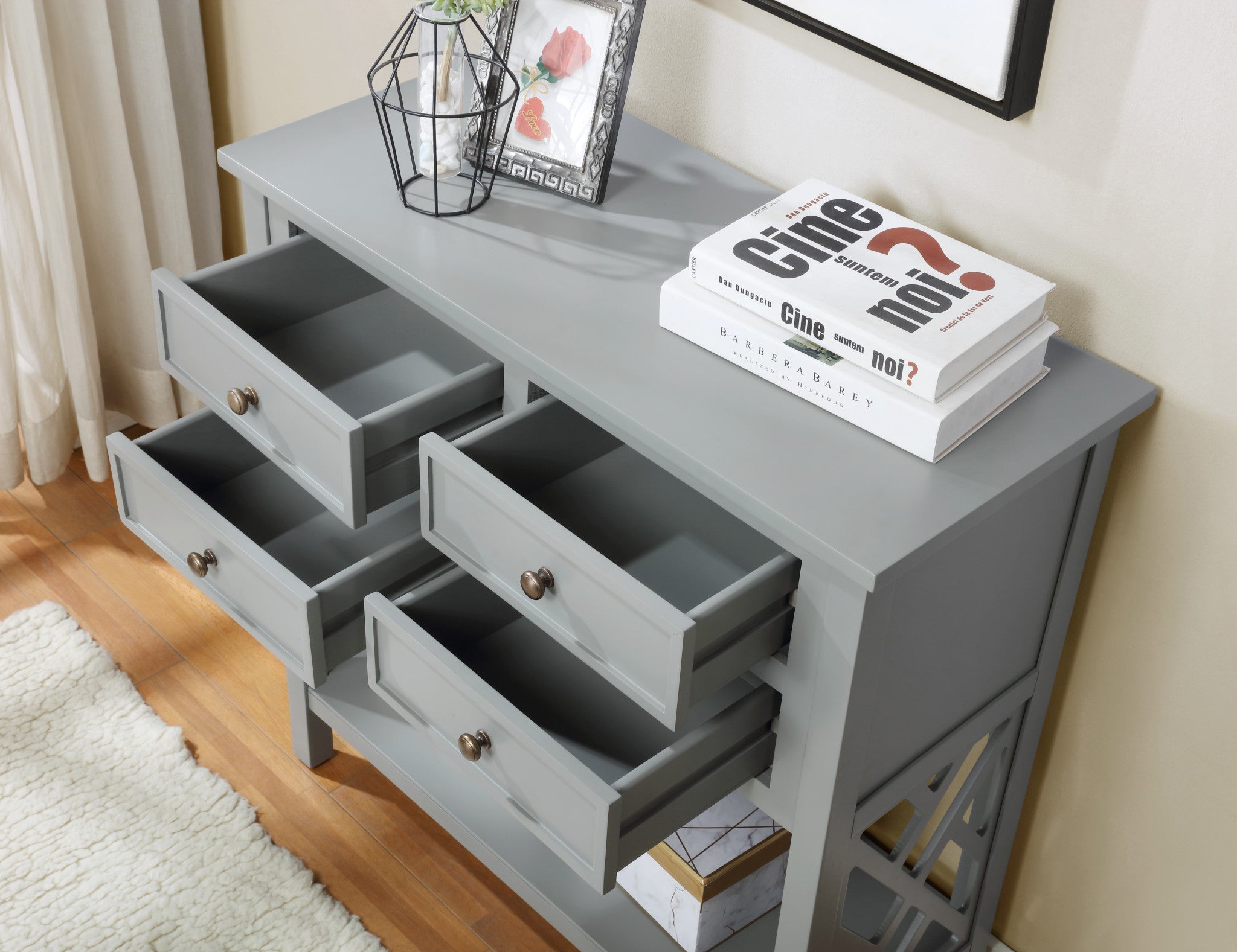 • [VERSATILE DESIGN] Coventry Entryway Table with 4-drawers and a classic grey finish. Striking square pattern and open detailing make it suitable for modern or traditional styles