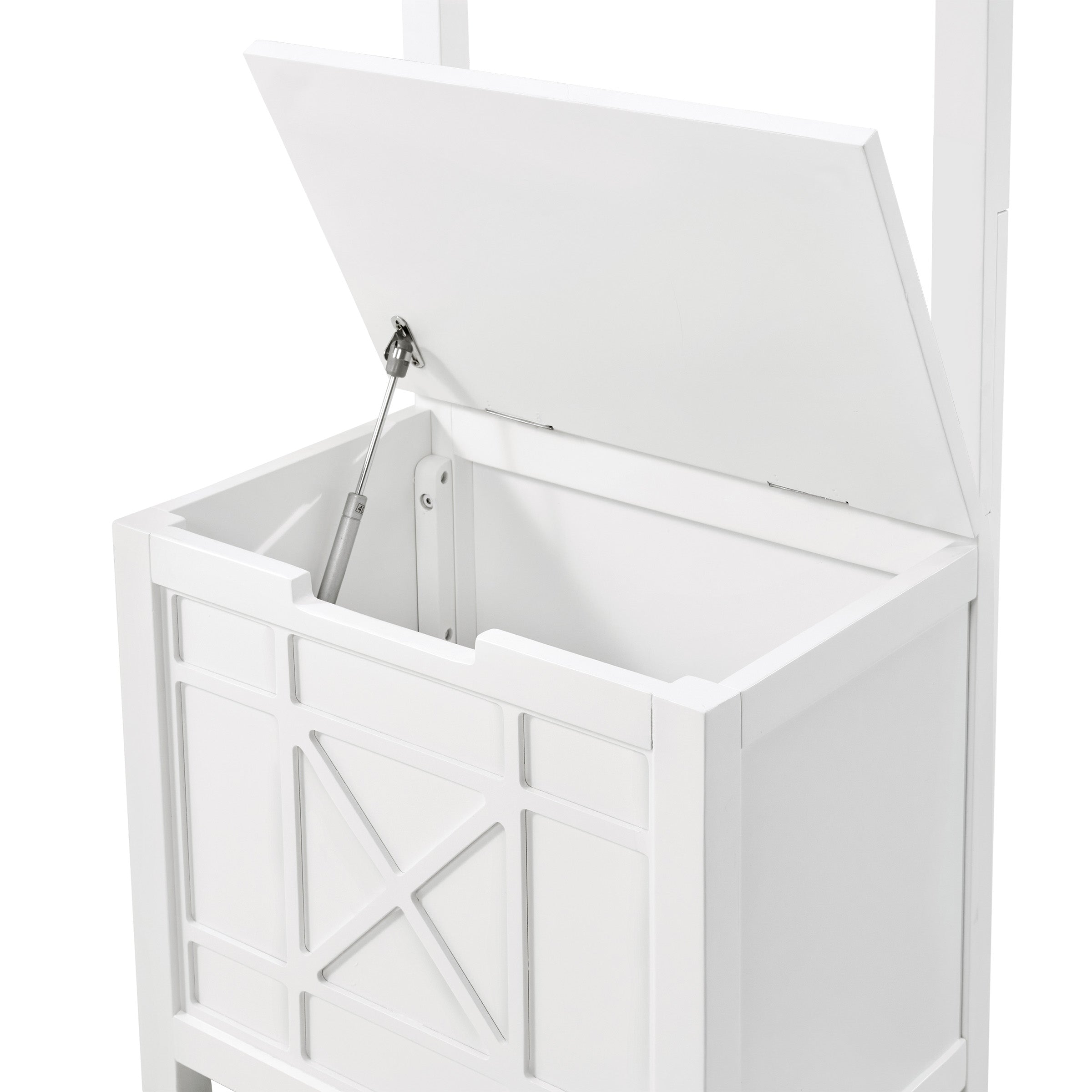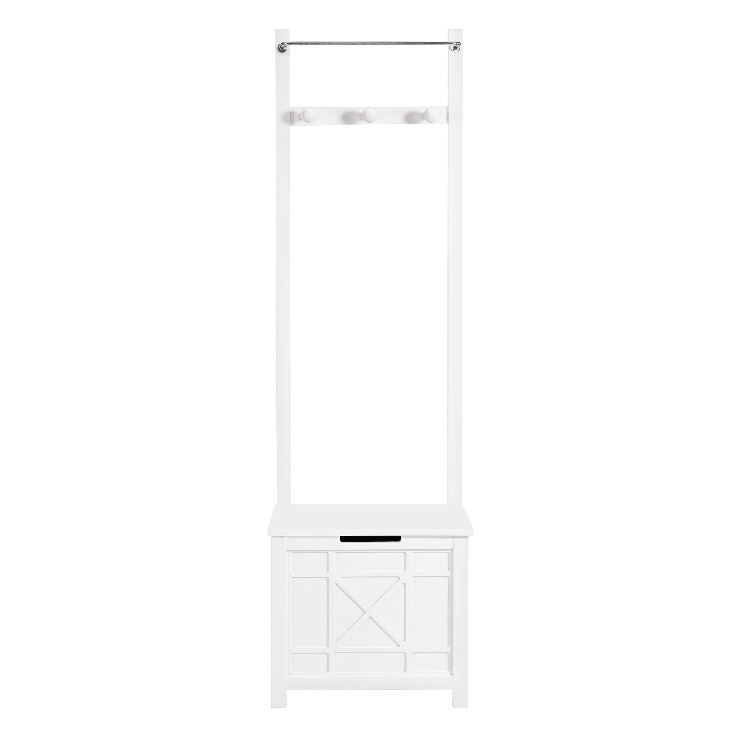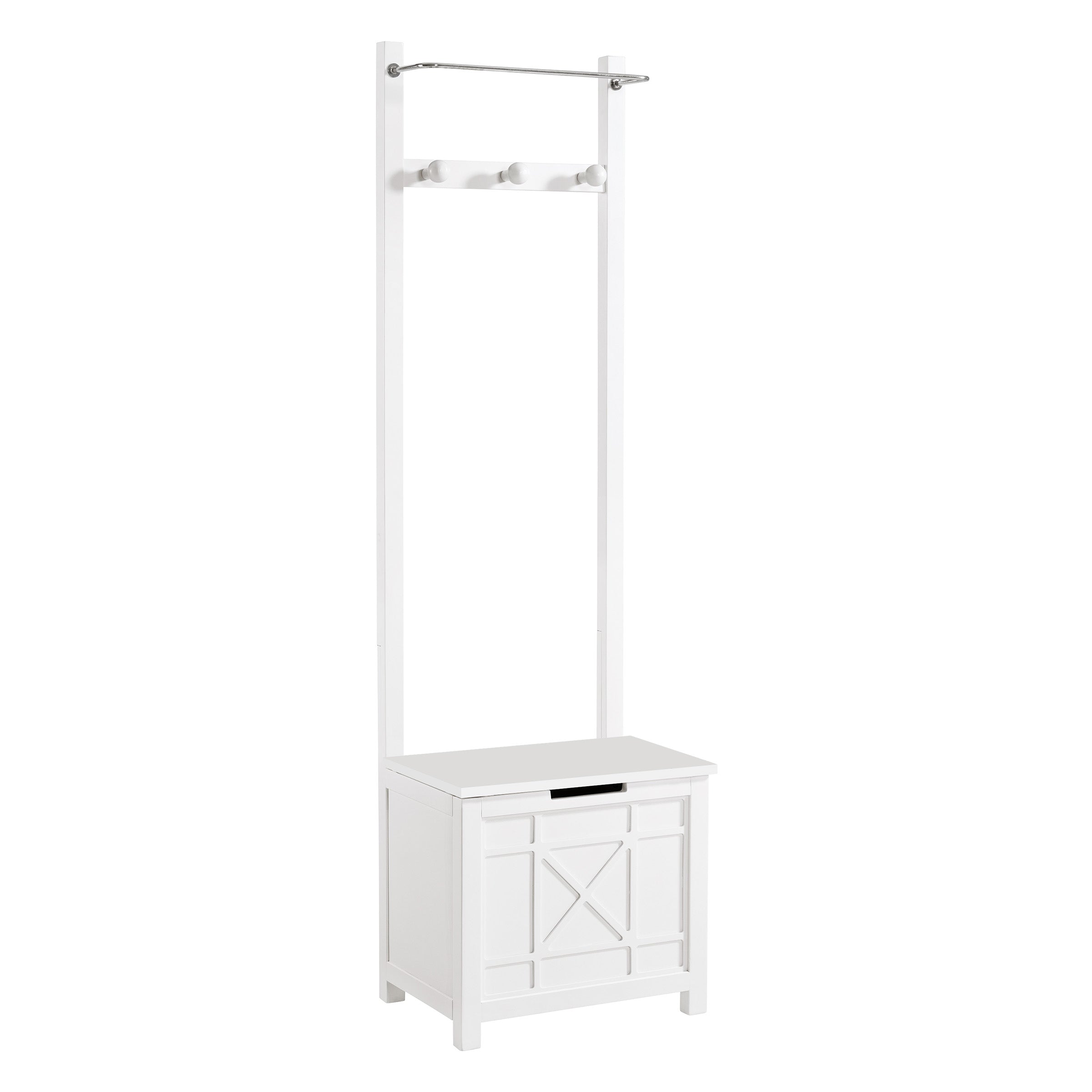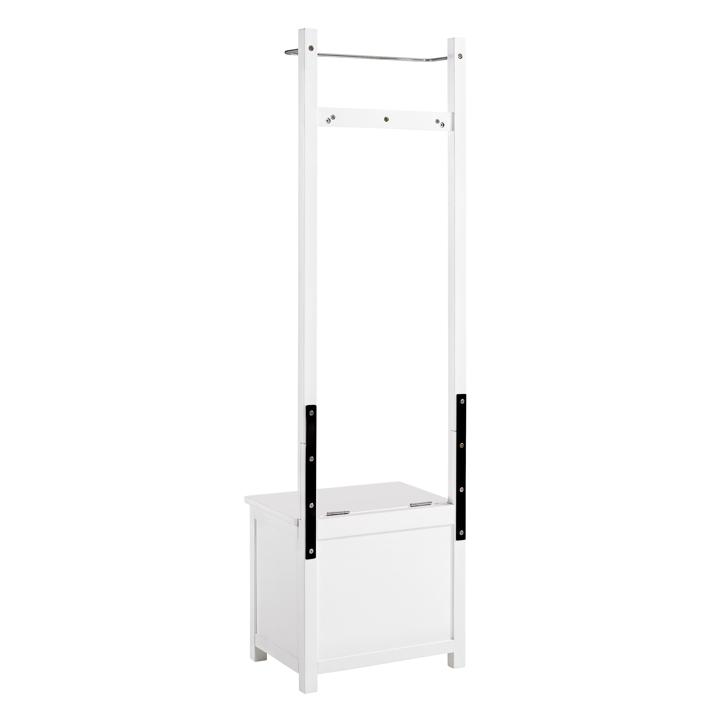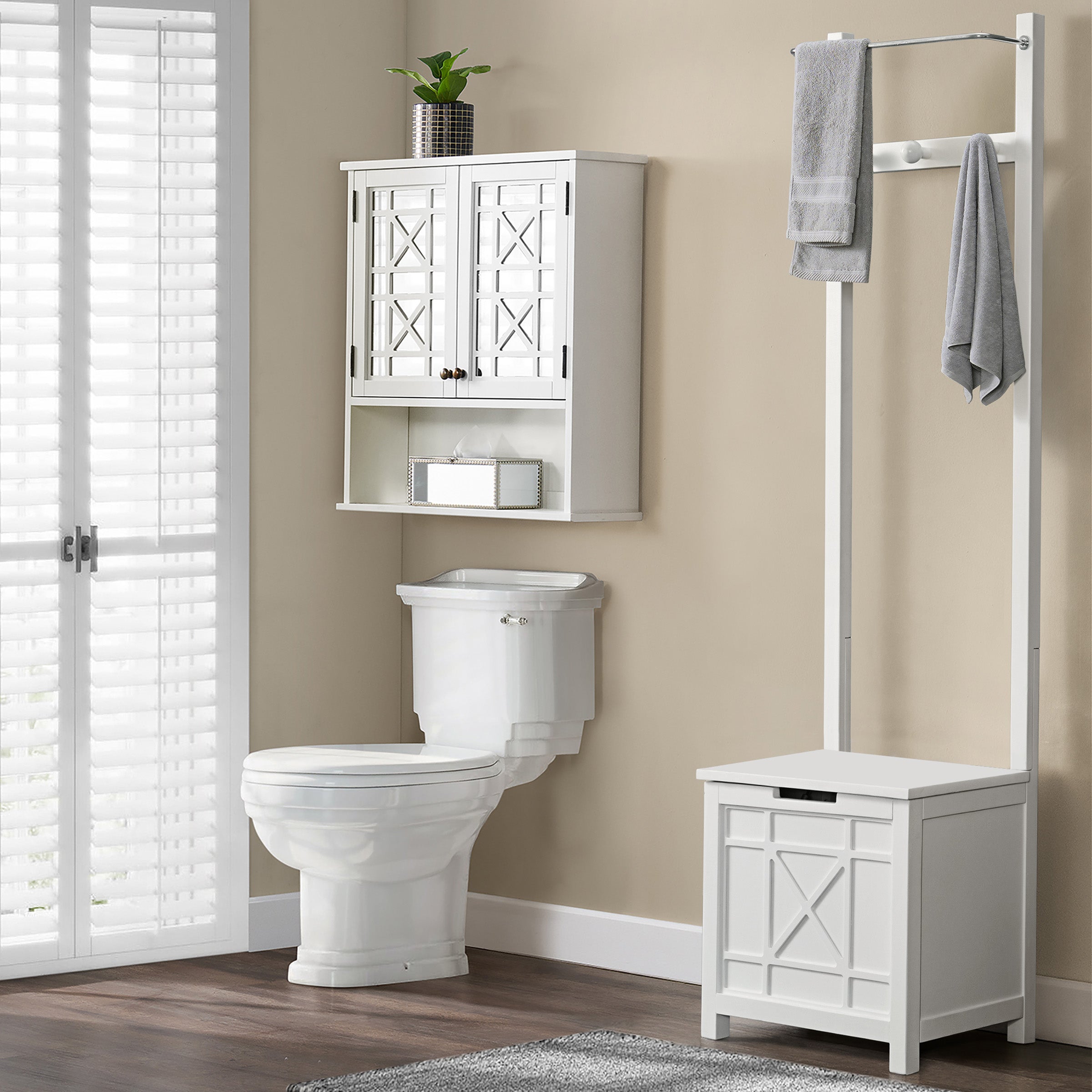 Add extra storage and seating to your entryway, kitchen, or bathroom with the Bathroom Organizer from the Derby Collection by Alaterre Furniture. This piece features a small seat and a weight capacity of 250lbs as well as a storage hamper underneath for dirty clothes, towels, shoes, and other accessories. The bathroom stool has an attached towel bar for draping towels or hanging shirts to air dry and 3 knobs for hanging coats in a mudroom, towels in the bathroom, or clean laundry in the laundry room.