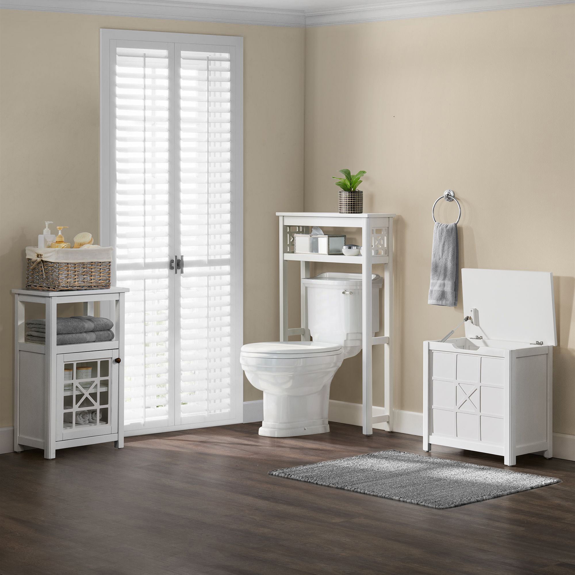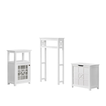Bring style and function to your bathroom with this collection. Distinctive styling and gridwork details are designed to complement any décor. Wood construction with a painted white finish, this piece works with most aesthetics. This set is a perfect storage solution for any size bathroom. The space saving over the toilet open shelf is designed to create and maximize bathroom storage. The shelf allows you to store toiletries, folded towels or display decorative accessories. The clothes hamper has a hinged lid that lifts and stays open, so you can easily access toys, towels, and anything else stashed inside. The deluxe floor storage cabinet offers a surprising amount of storage for such a small footprint.