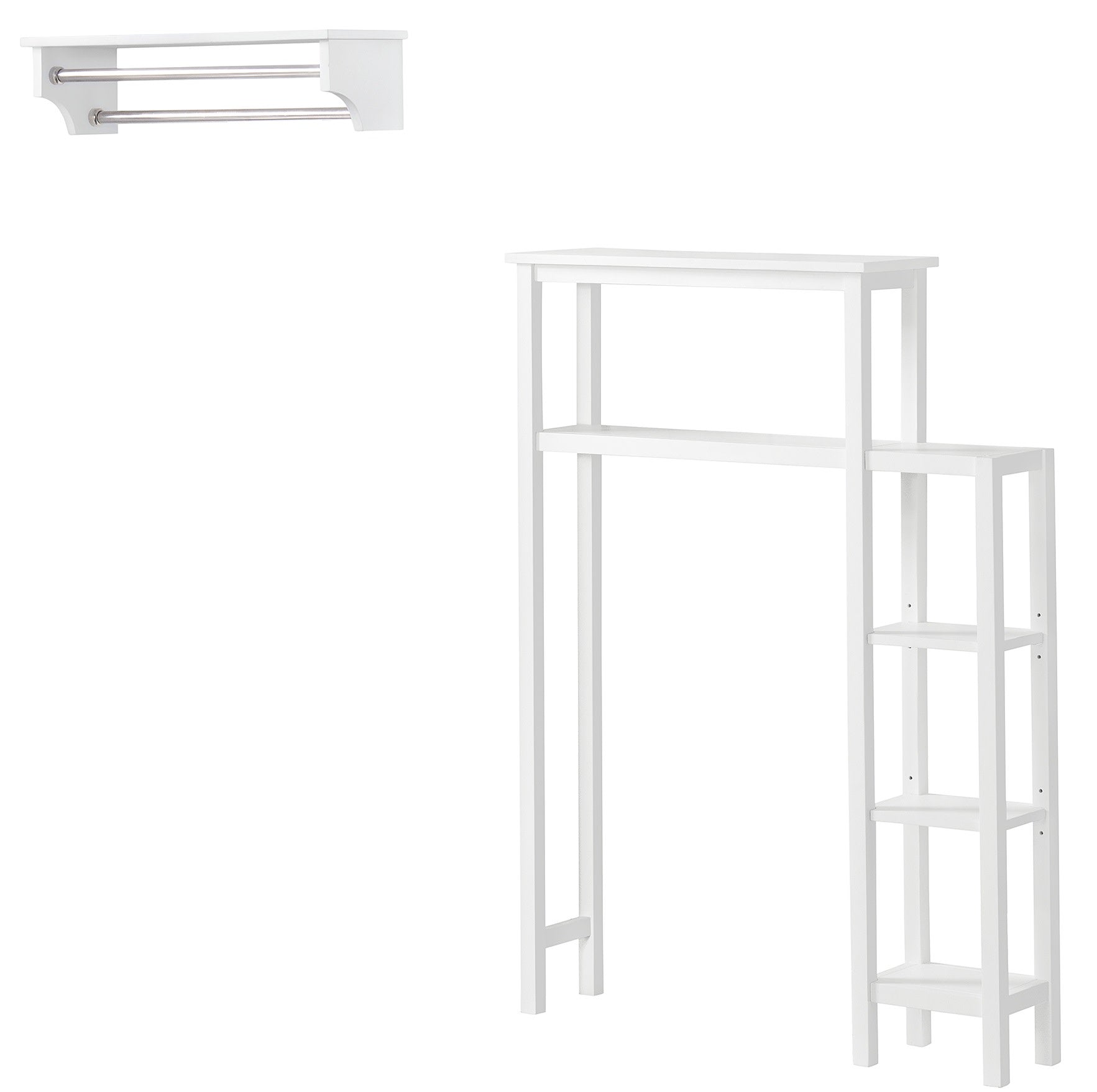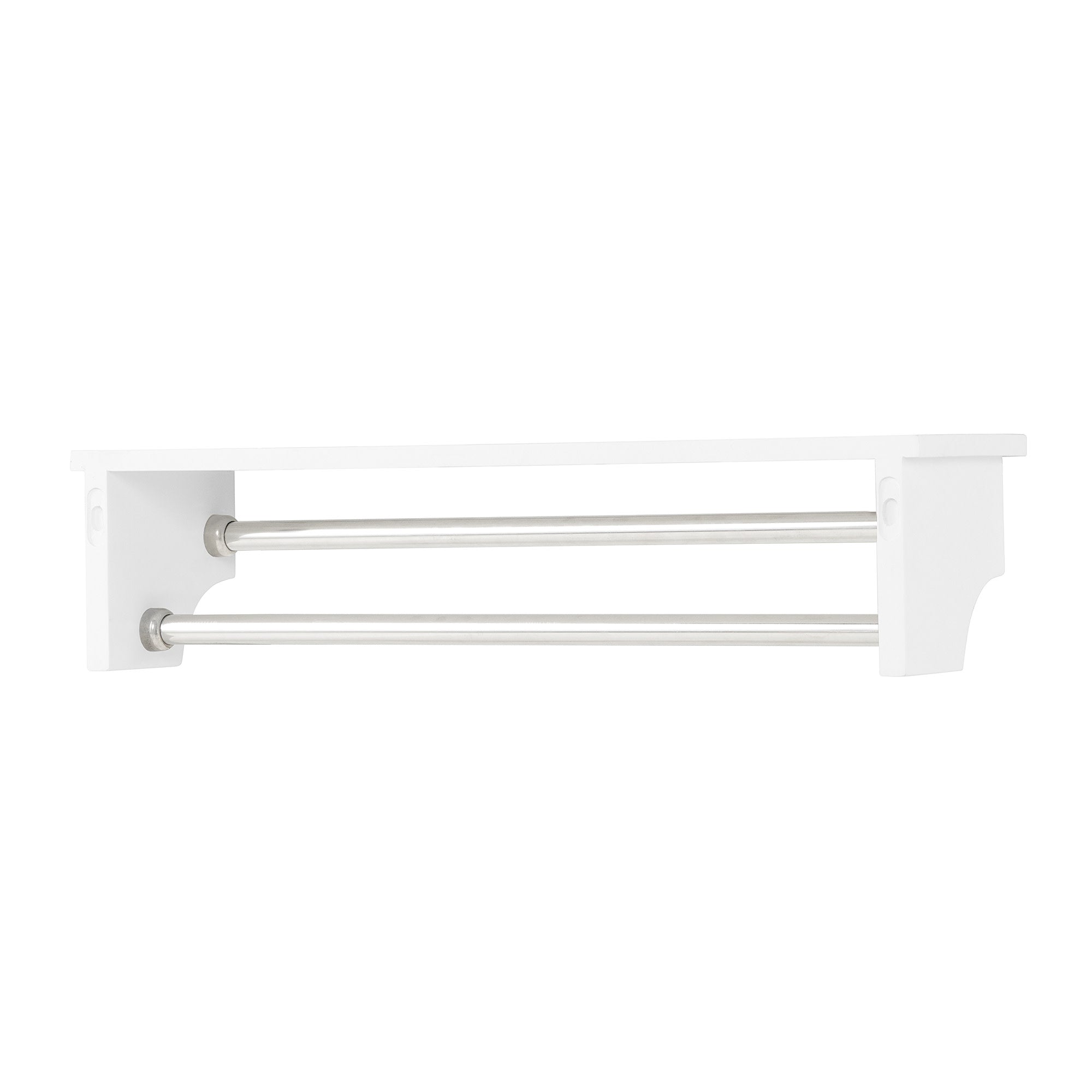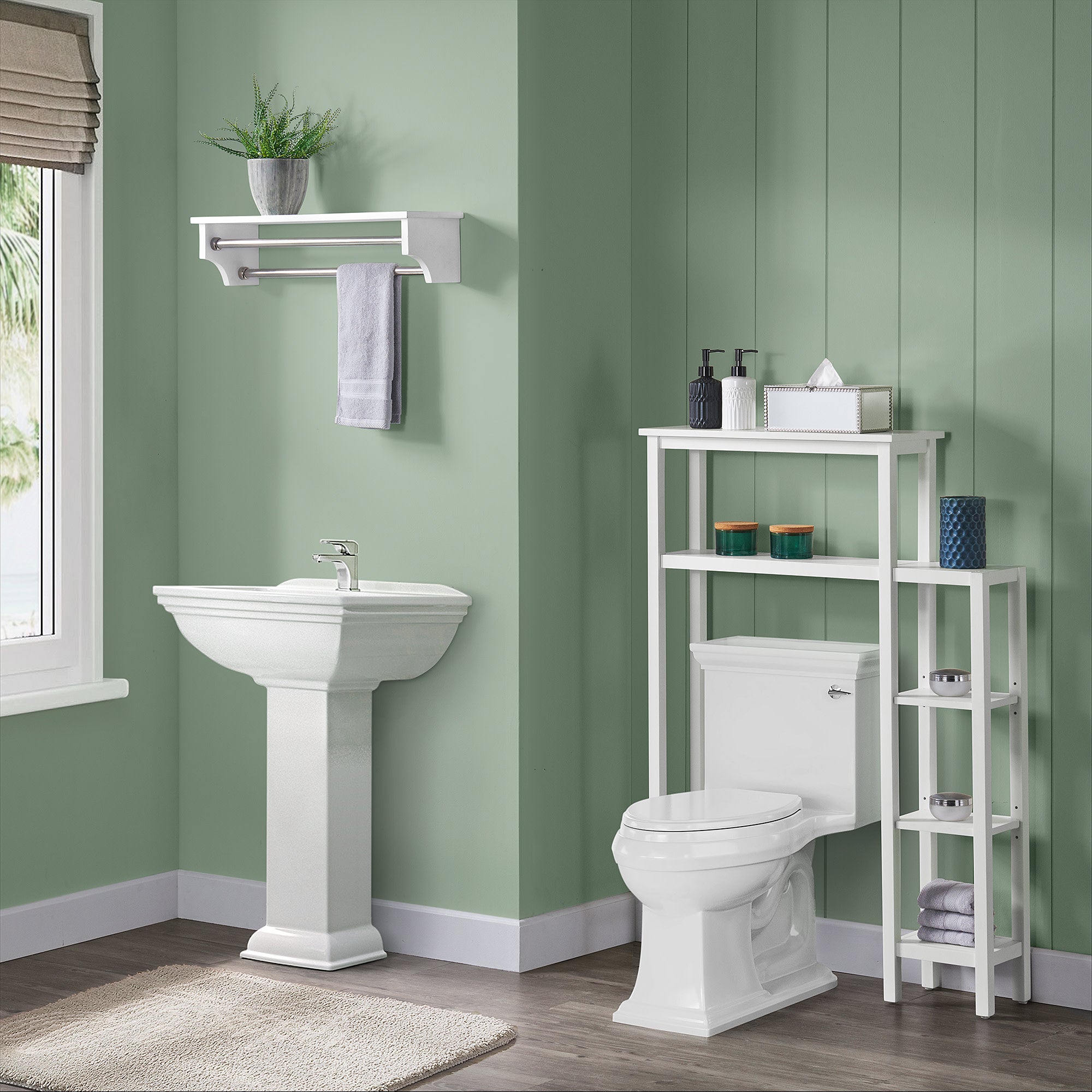 This collection brings space saving storage to your bathroom. The classic design compliments almost any bathroom décor. Wood construction with a white, painted finish, these pieces are designed for both style and functionality. A perfect space saver for your bathroom; over the toilet base space saver with side shelving allows you to store toiletries, washcloths and towels or display decorative accessories. The 27"W shelf provides space for decor or bathroom accessories and features two towel rods. Bath collection is moisture resistant.