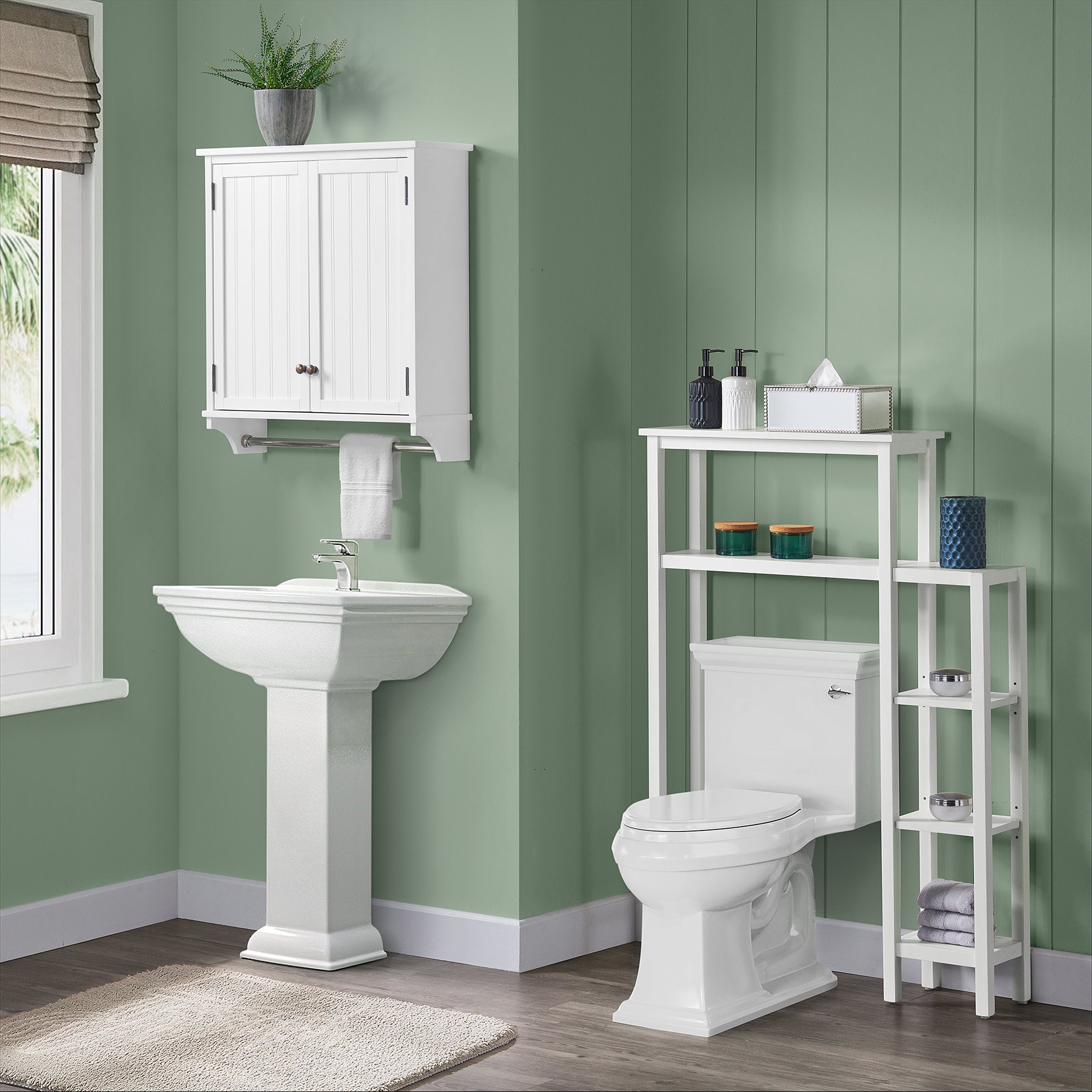 This collection brings space saving storage to your bathroom. The classic design compliments almost any bathroom décor. Wood construction with a white, painted finish, these pieces are designed for both style and functionality. A perfect space saver for your bathroom; over the toilet base space saver with side shelving allows you to store toiletries, washcloths and towels or display decorative accessories. The 27"W wall mounted storage cabinet includes two adjustable interior shelves and a towel bar for maximizing space. Bath collection is moisture resistant.