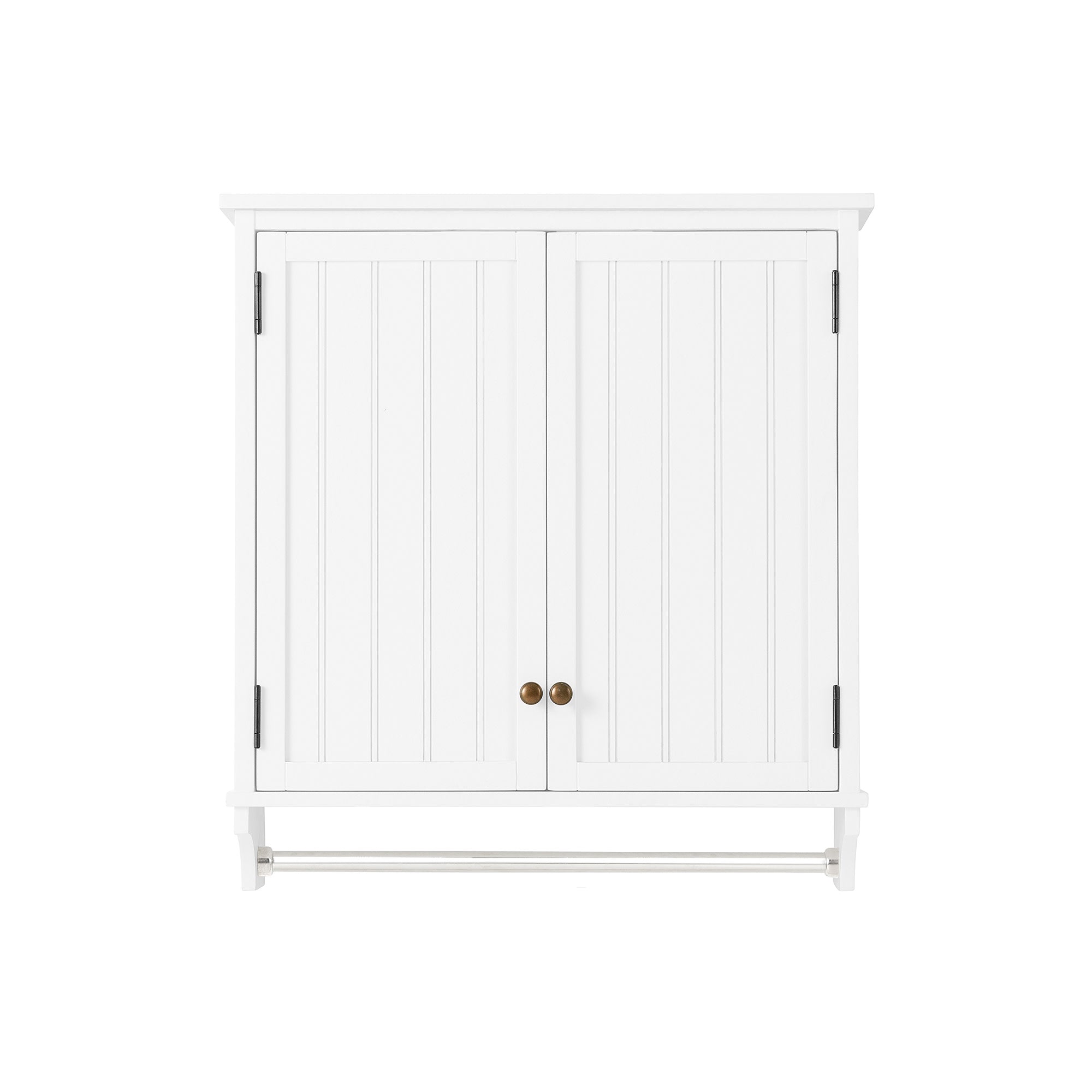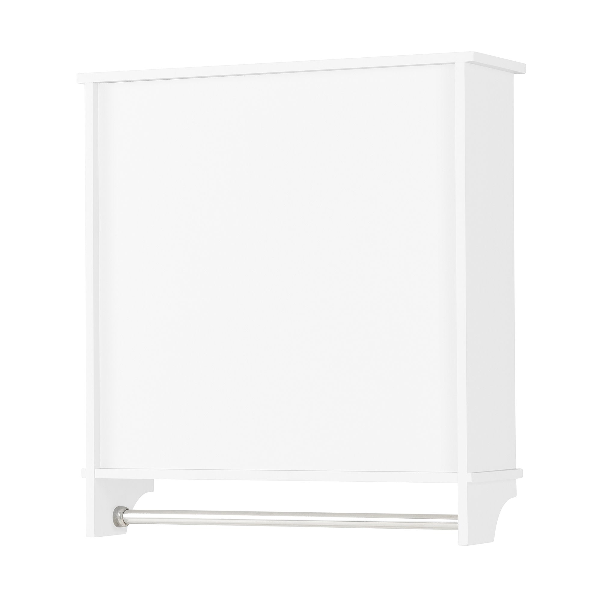 This collection brings space saving storage to your bathroom. The classic design compliments almost any bathroom décor. Wood construction with a white, painted finish, these pieces are designed for both style and functionality. A perfect space saver for your bathroom; over the toilet space saver organizer features three open shelves with plenty of space to keep toiletries, folded towels and decorative accessories. The 27"W wall mounted storage cabinet includes two adjustable interior shelves and a towel bar for maximizing space. Bath collection is moisture resistant.