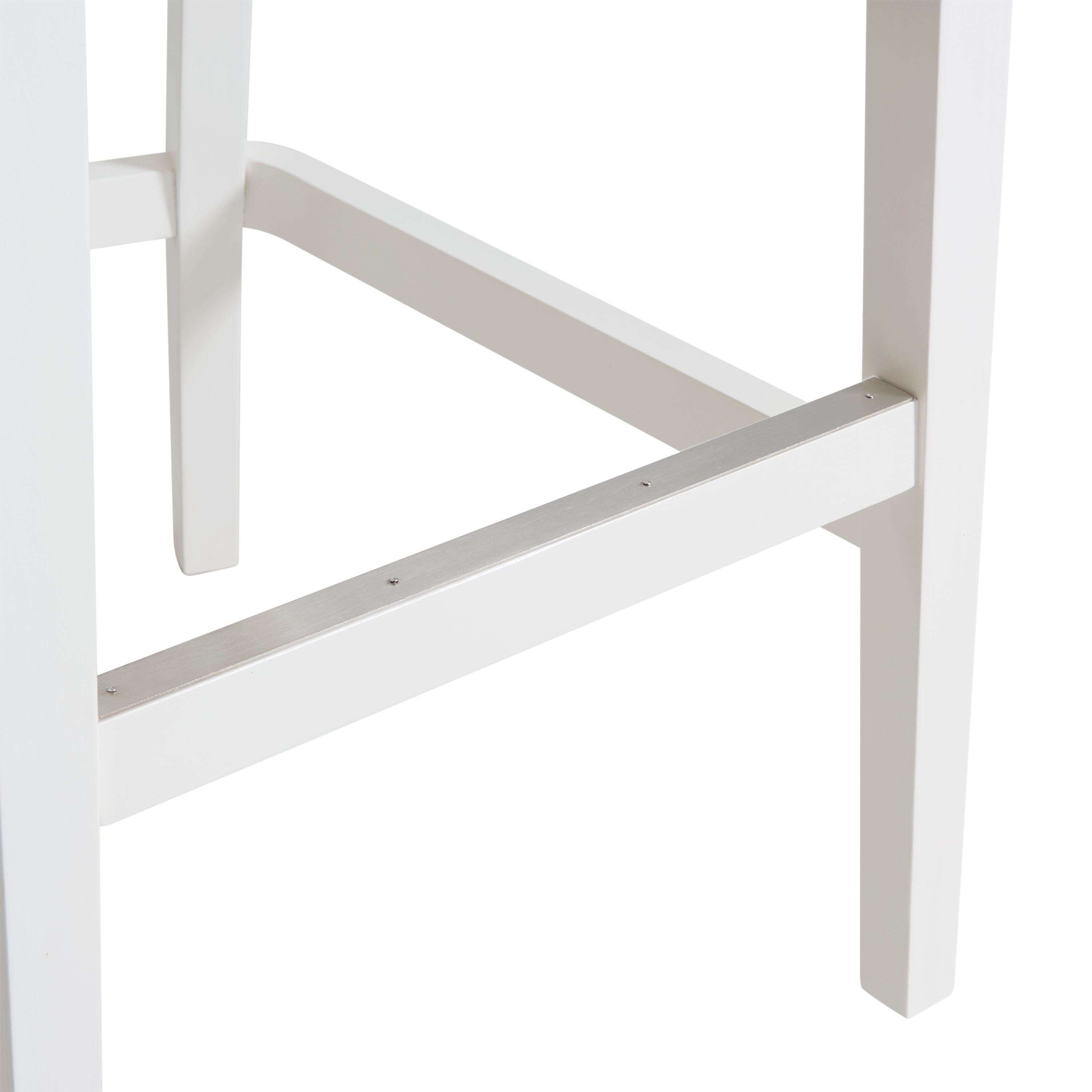 • BAR HEIGHT BARSTOOL – This bar height stool with light gray leather-like upholstered seat and backrest is supported by a solid white rubberwood frame, offering lasting comfort and back support for long seating sessions.