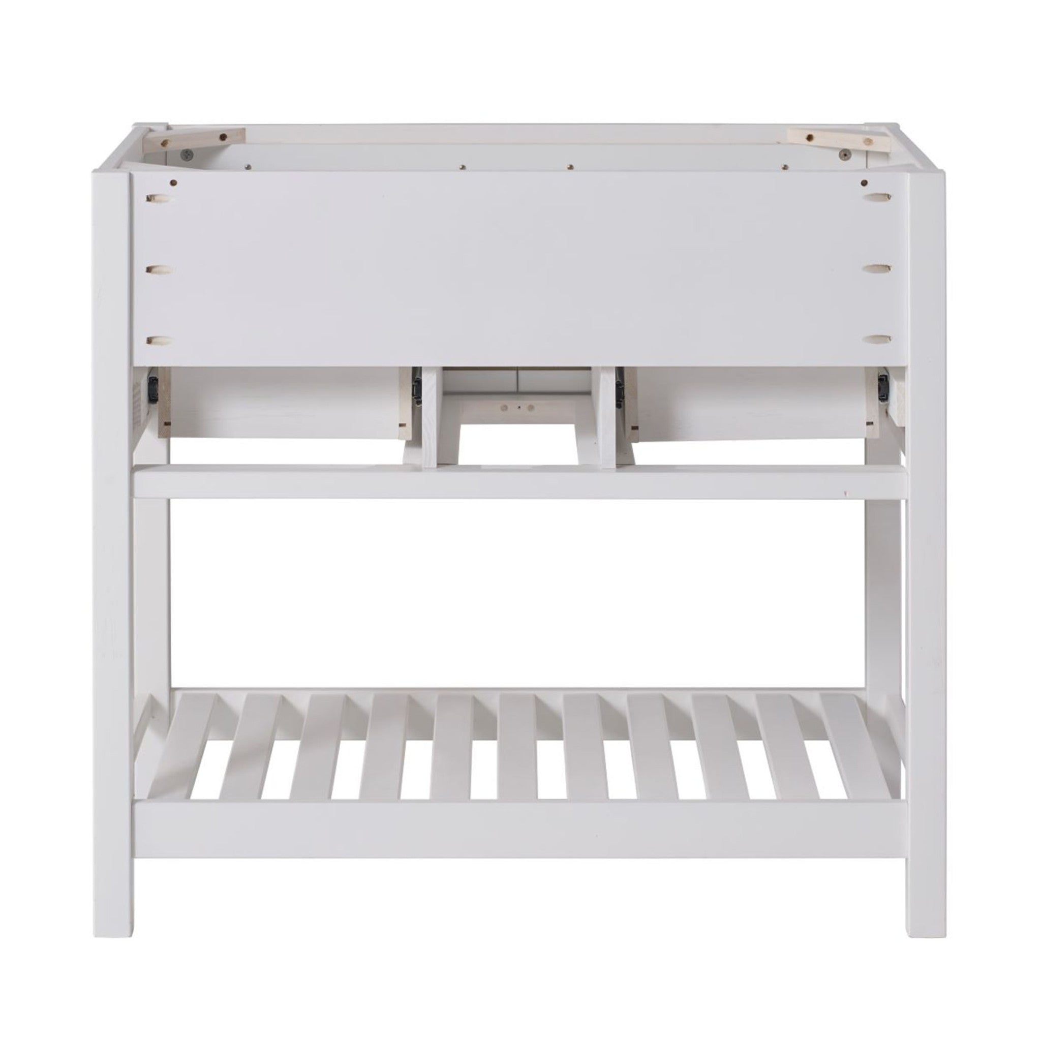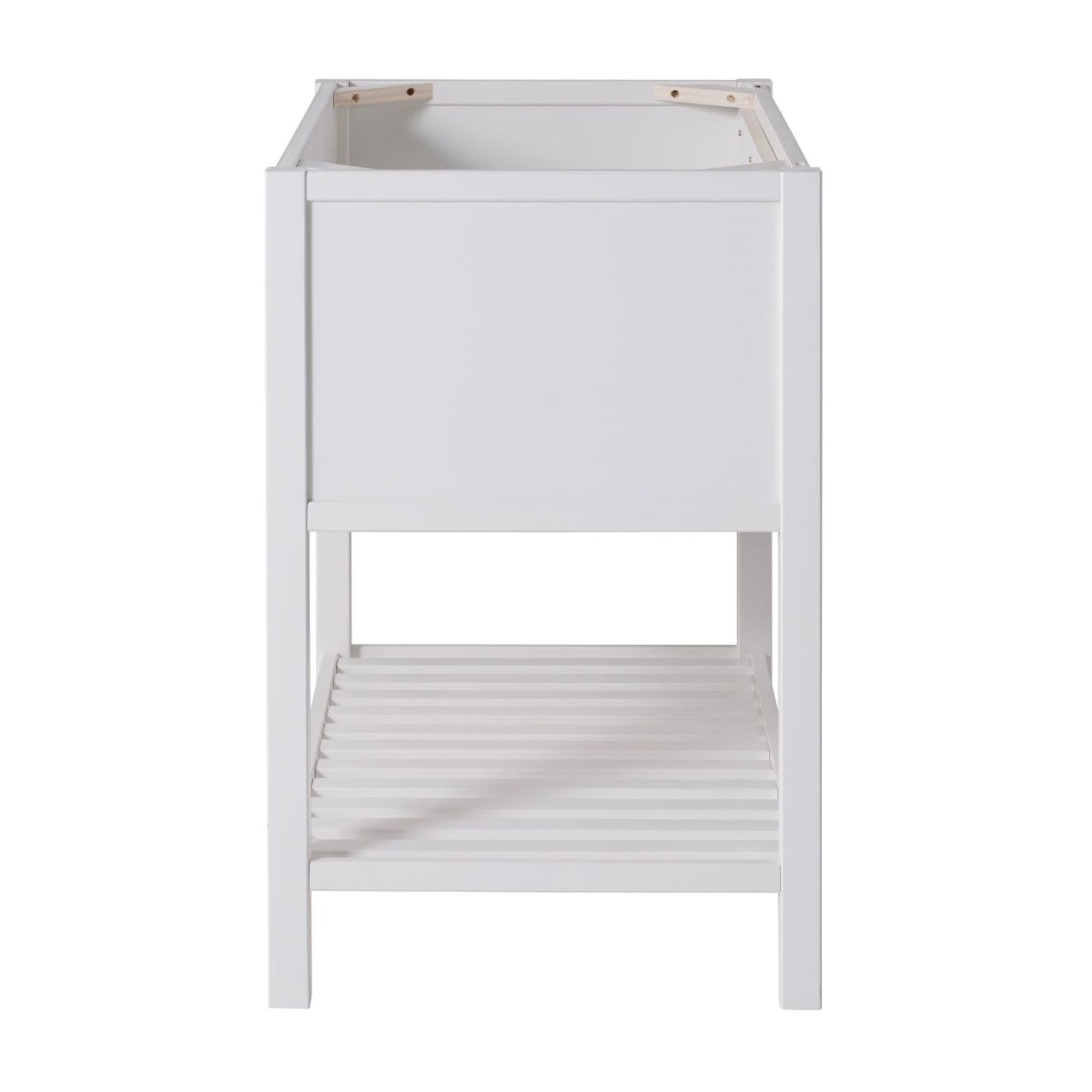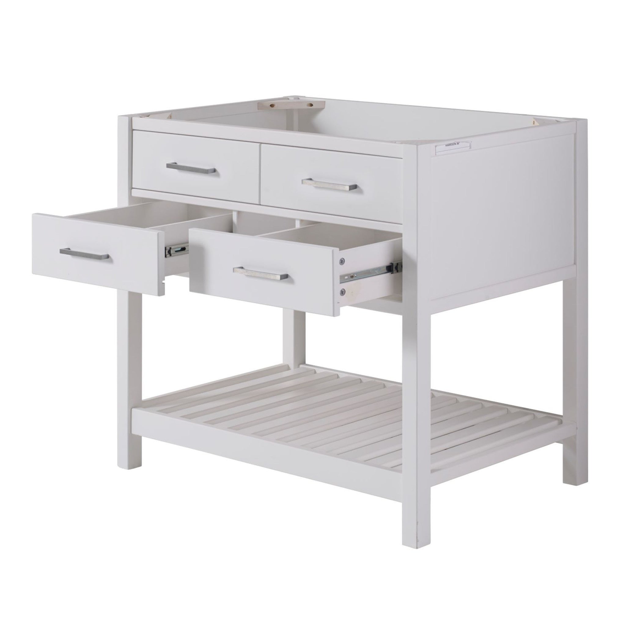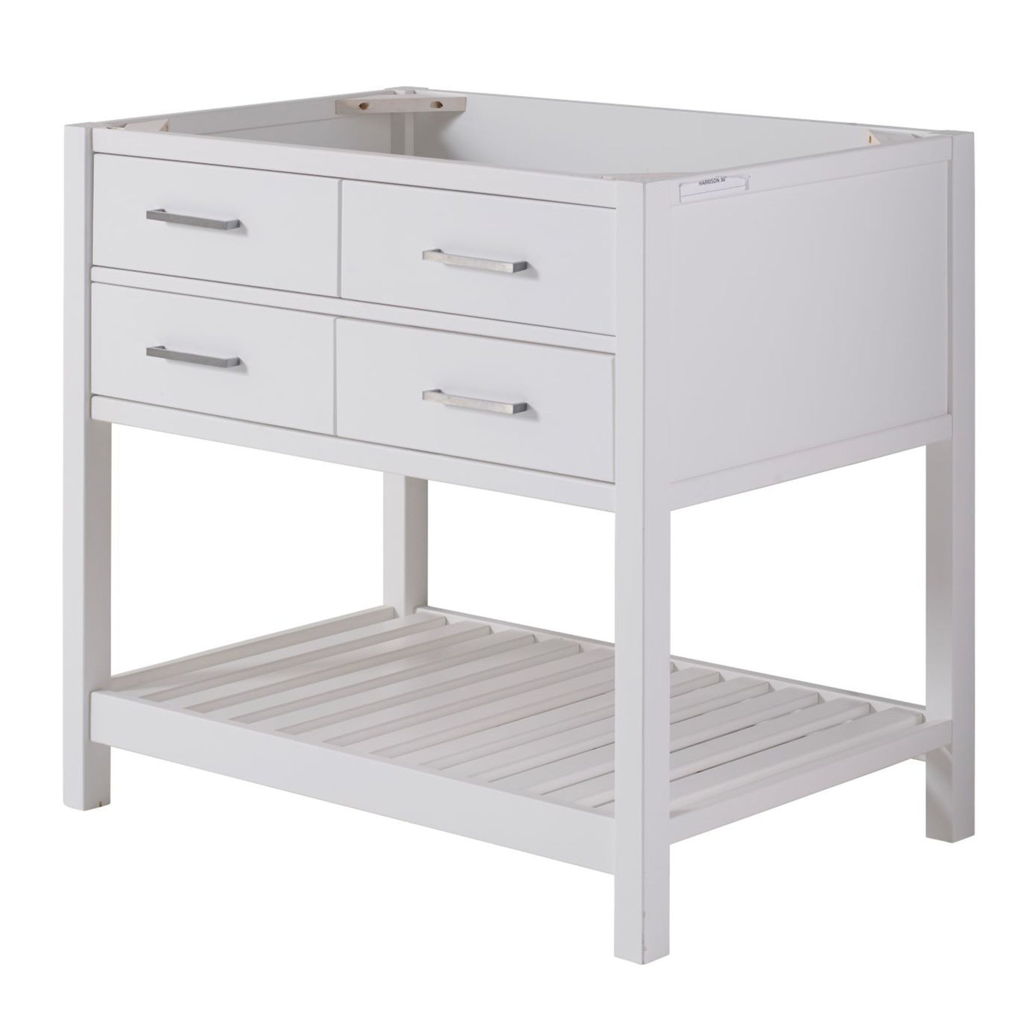 Bring beauty to your bathroom with this timeless vanity cabinet. This design combines traditional and modern influences with its clean-lined frame crafted from solid pine and composite wood. The vanity features nickel pulls and hardware. The soft-close drawer is perfect for stashing washcloths, makeup, and other necessities, while an open shelf down below offers a space for towels or other bathroom accessories. Vanity top and sink are not included.