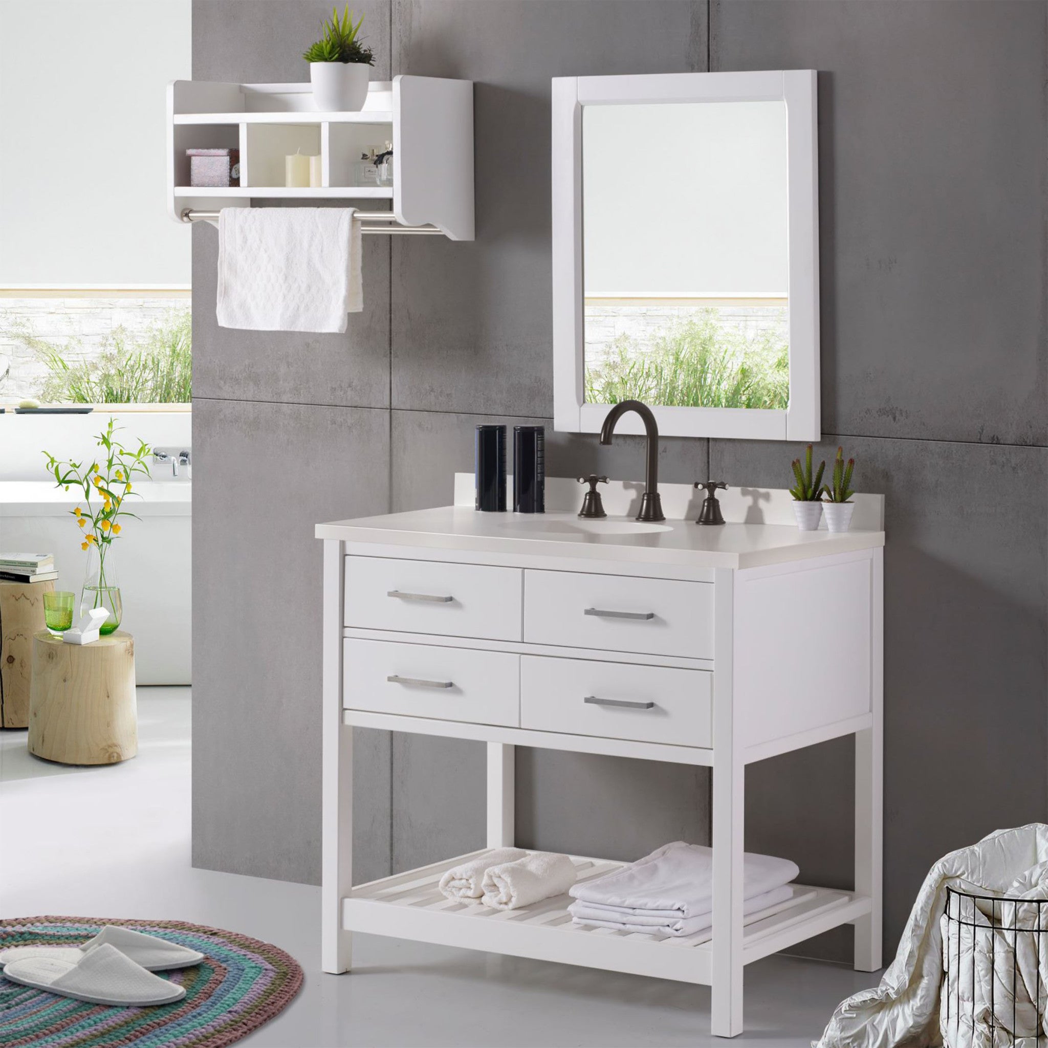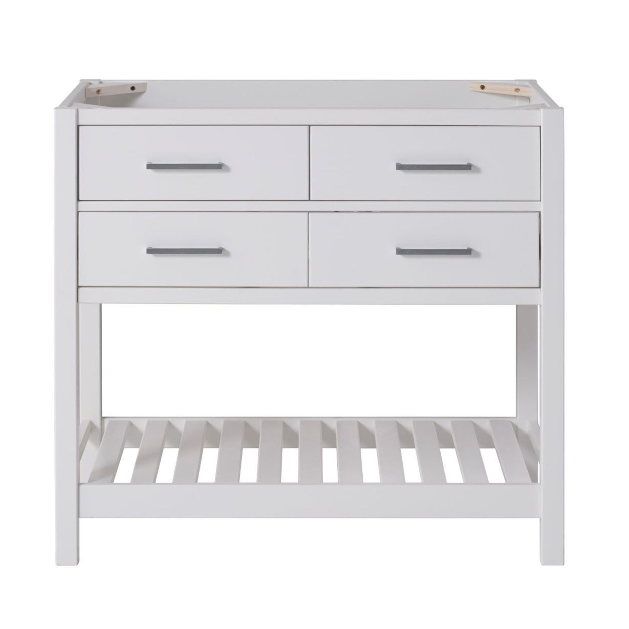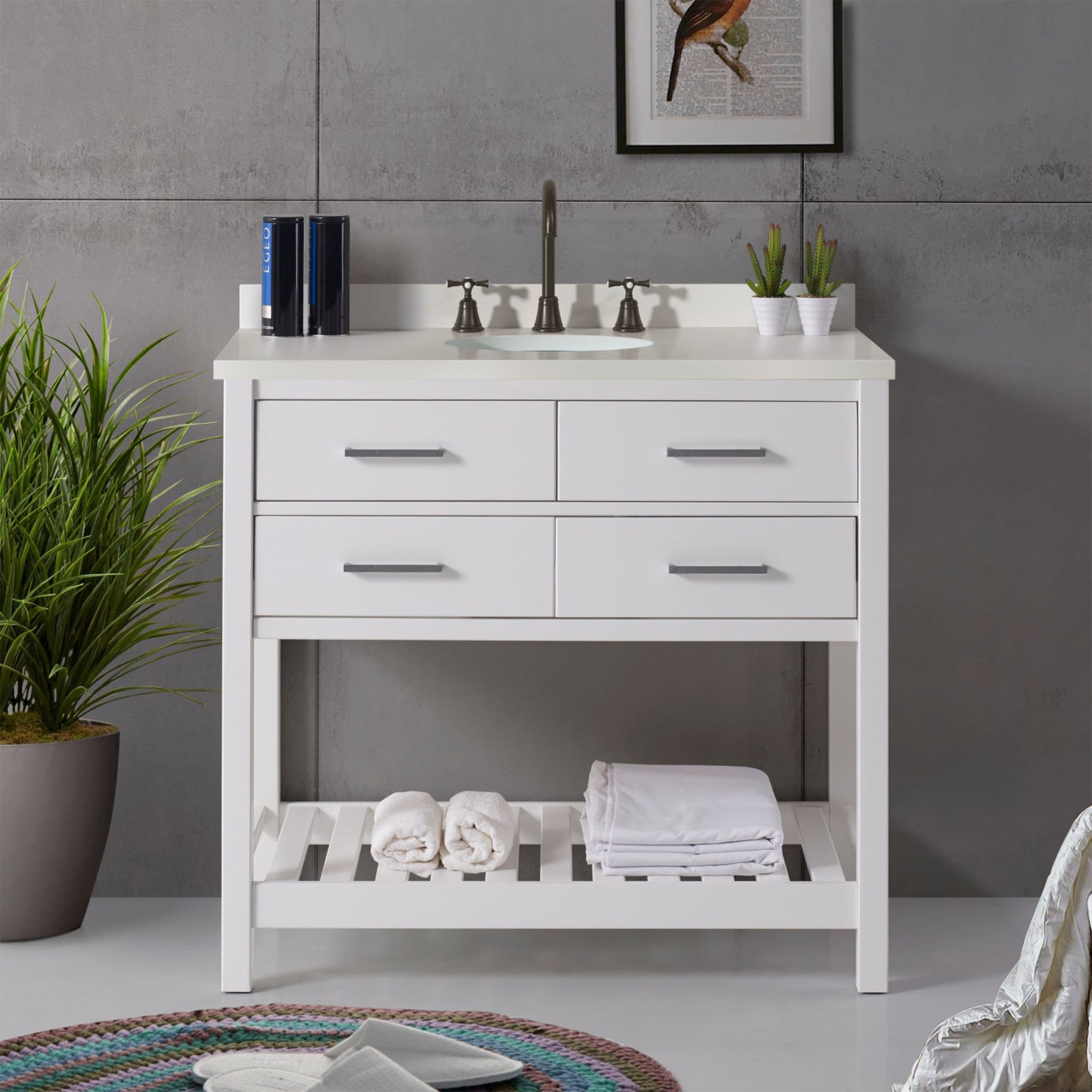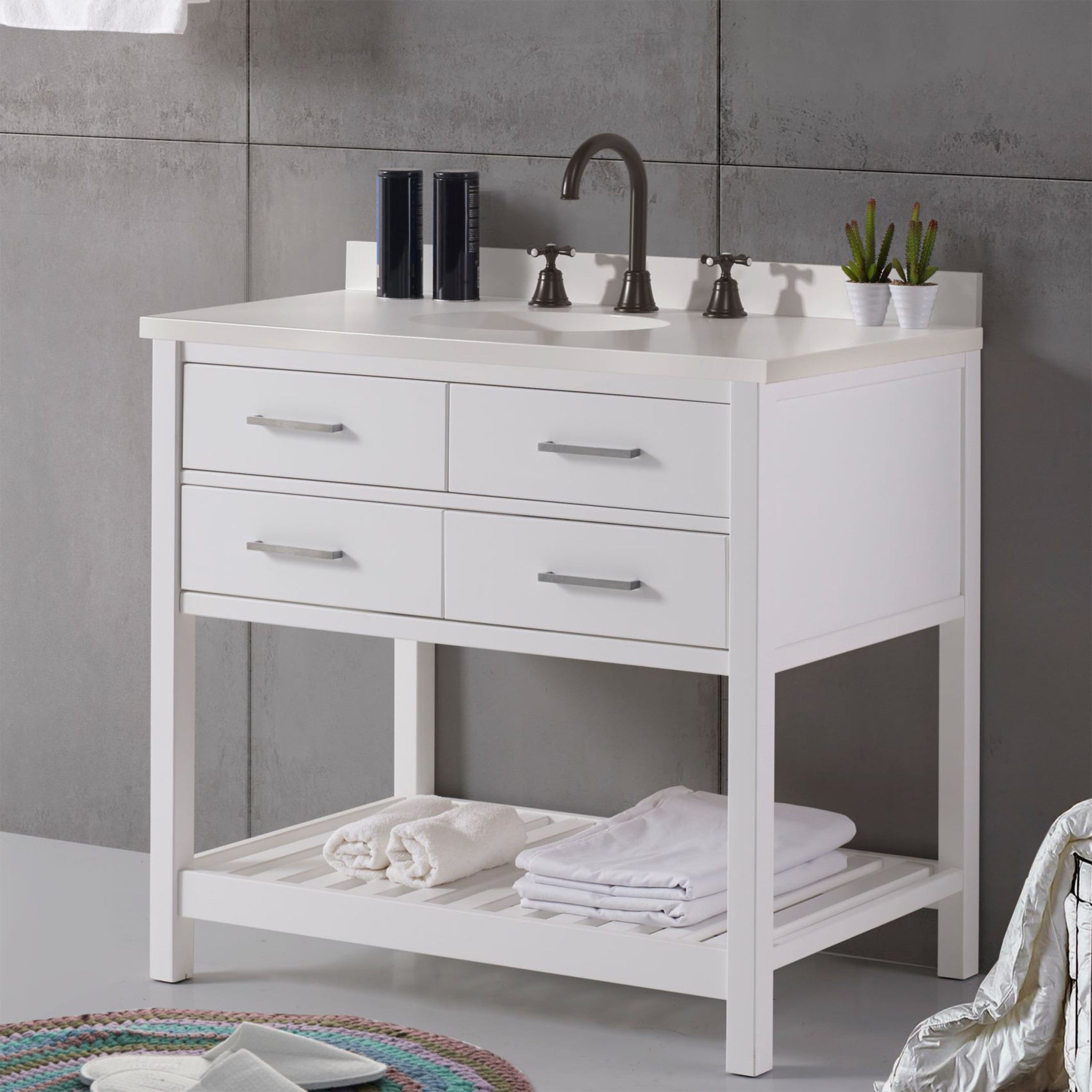 Bring beauty to your bathroom with this timeless vanity cabinet. This design combines traditional and modern influences with its clean-lined frame crafted from solid pine and composite wood. The vanity features nickel pulls and hardware. The soft-close drawer is perfect for stashing washcloths, makeup, and other necessities, while an open shelf down below offers a space for towels or other bathroom accessories. Vanity top and sink are not included.