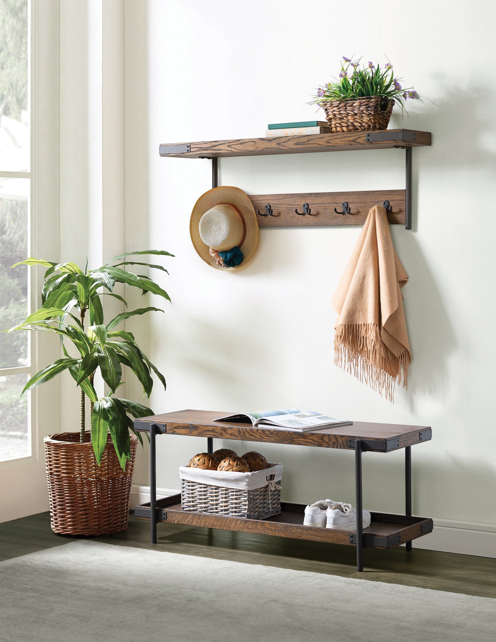 - [FUNCTIONAL VERSATILITY] The Kyra 42" Oak and Metal Coat Hook with Shelf and Bench Set offers seating and storage in one. Ideal for entryways or mudrooms, it organizes shoes, bags, and coats while adding functionality to your space