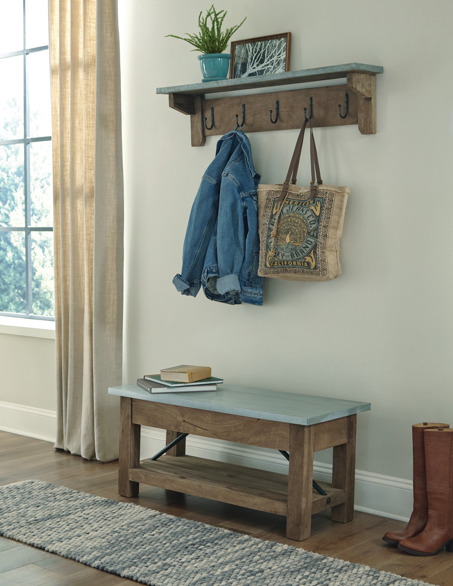 Zinc Metal mixed with Wood and Antique Iron hooks lends Modern Industrial style to your living space. This stunning coat hook and bench offers a balance of sturdy and solid with the lightness of the zinc metal tops; sure to make an impact in your entryway or mudroom. Both the bench and the coat hook features a shelf for additional storage or display space. Five single metal hooks will keep coats, bags, or other accessories organized.