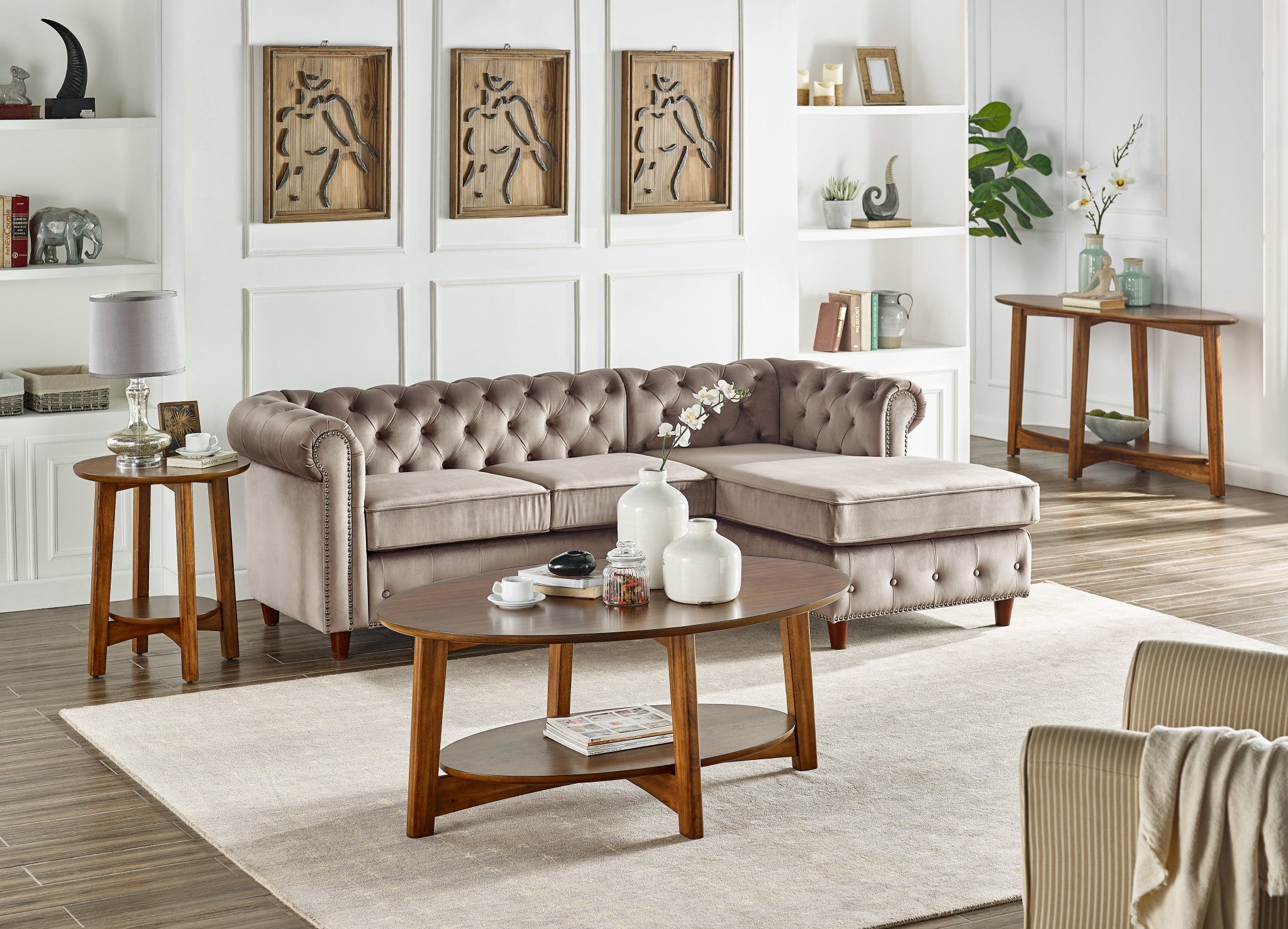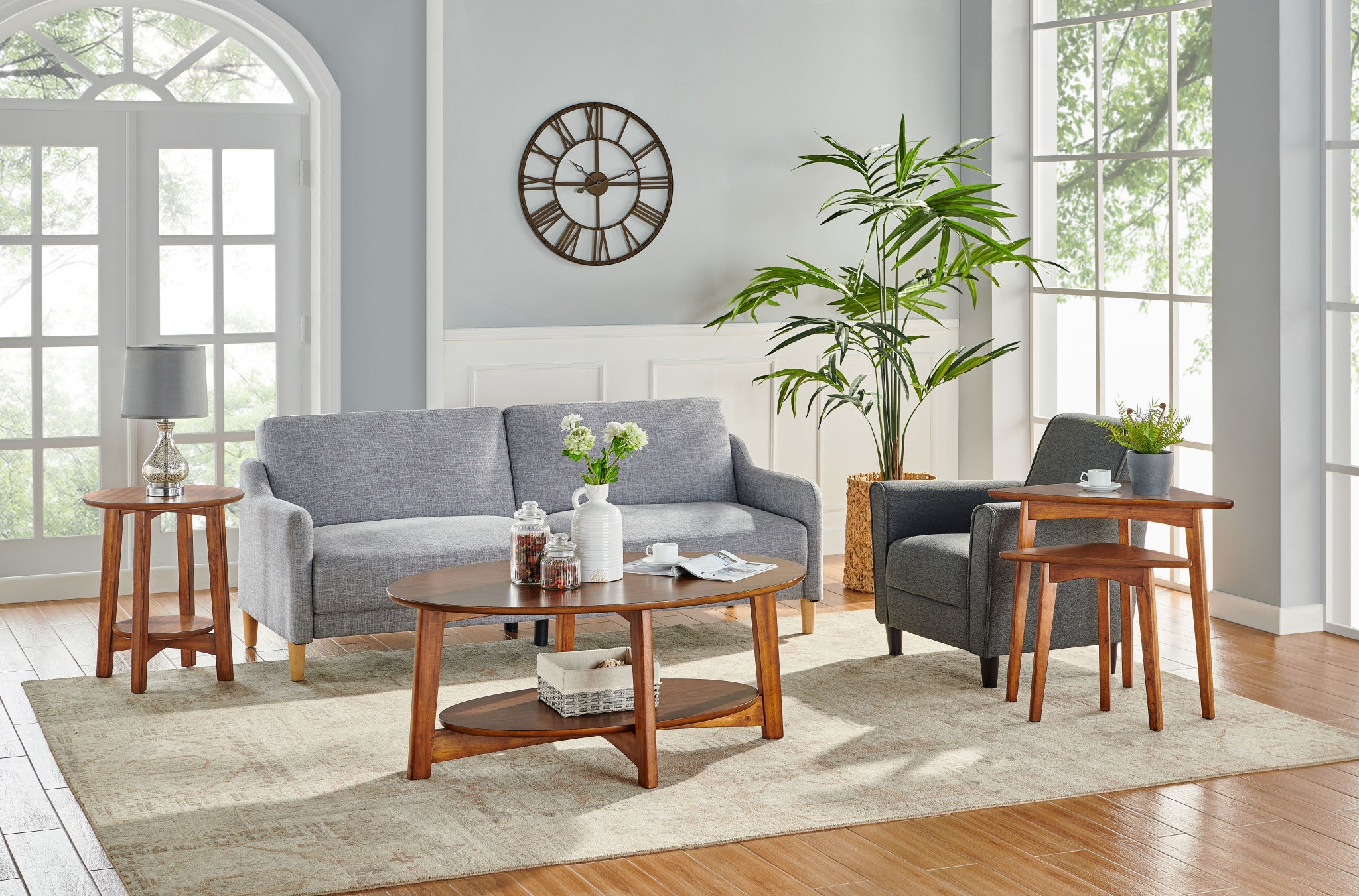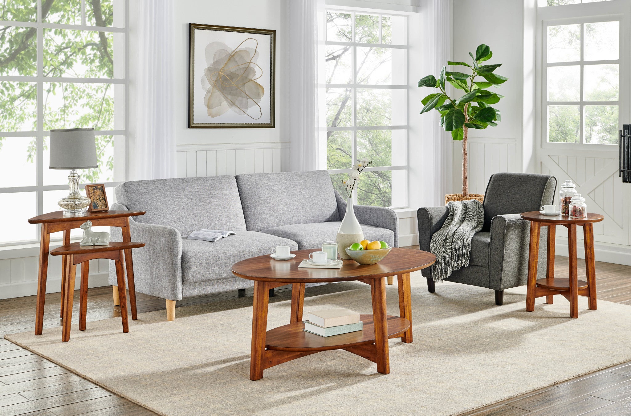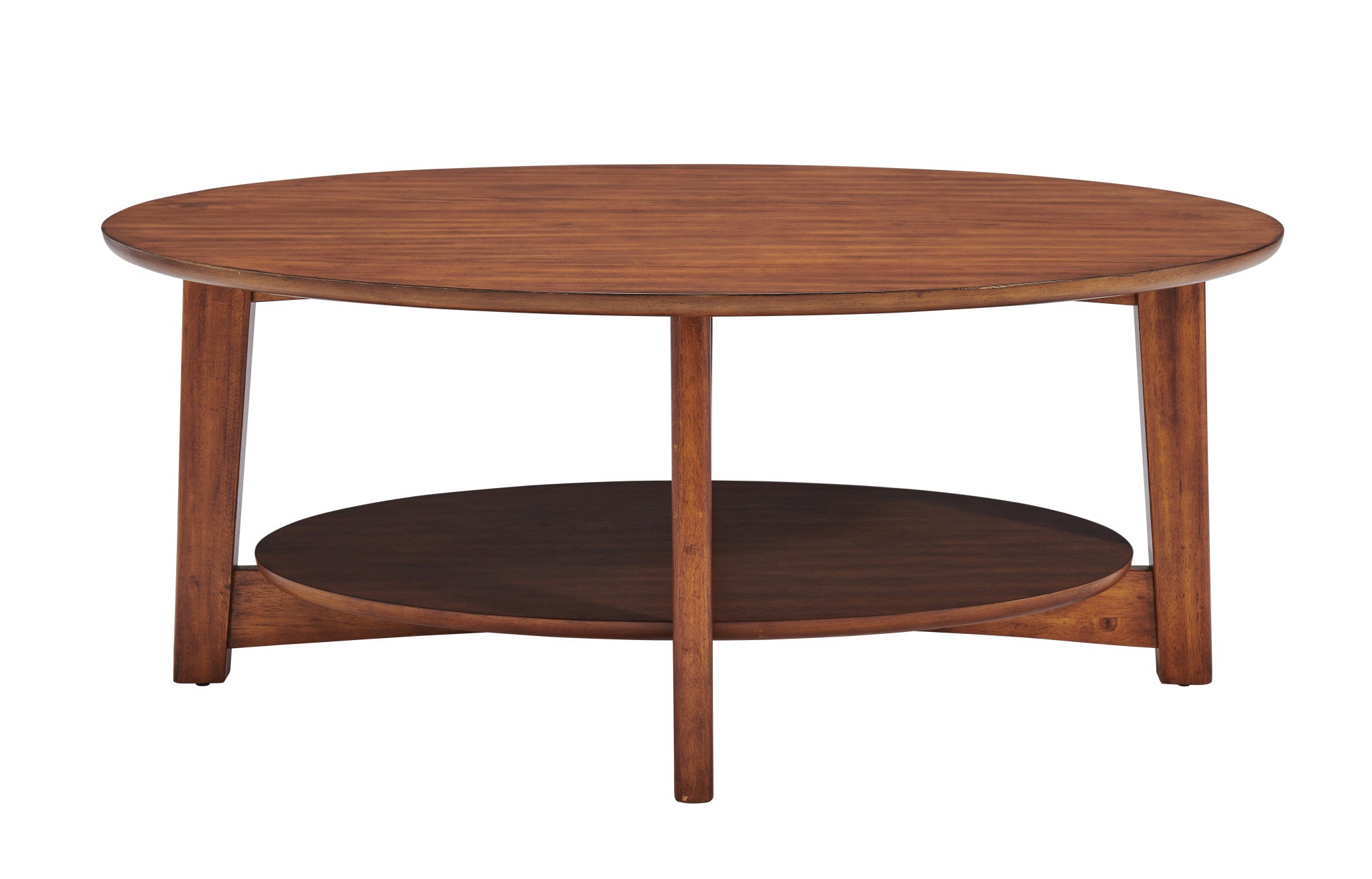 • [MAIN FEATURES AND BENEFITS] Take your living room decor to the next level with this Monterey 48'' L Oval Mid-Century Modern Wood Coffee Table; features warm chestnut finish, an oval tabletop and floating shelf