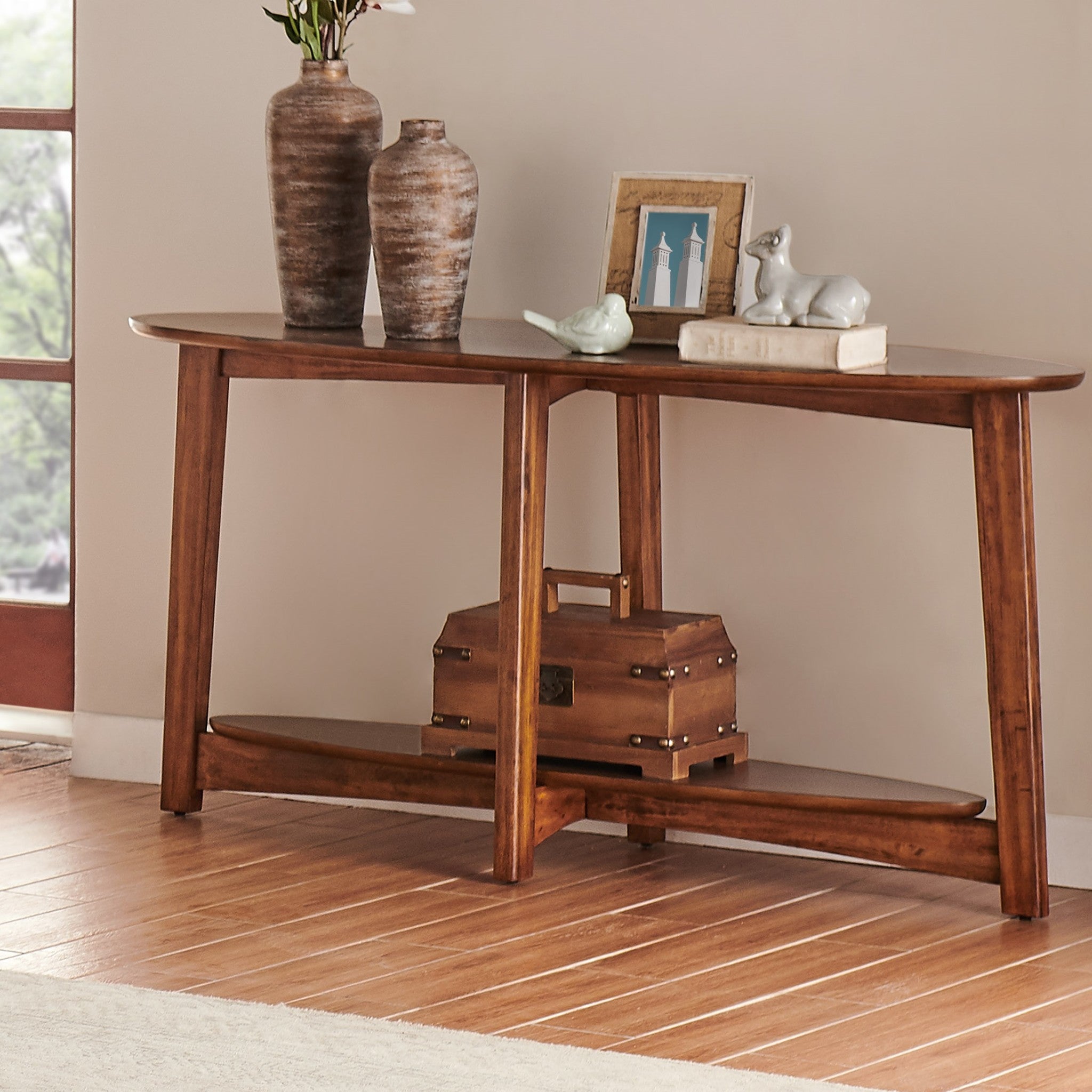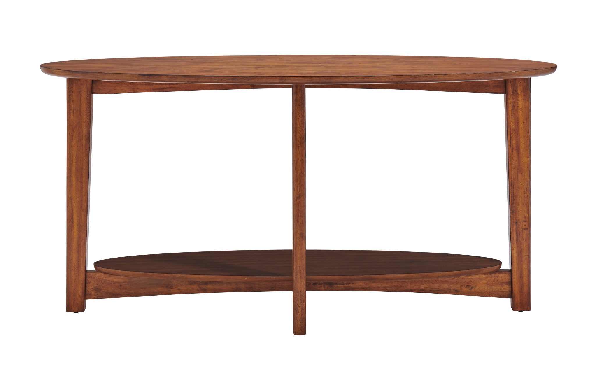 - [ELEVATED DESIGN] Monterey 60" L Console mid-century modern wood table exudes modernity and elegance in its warm chestnut finish, tapered legs, and oval-shaped top; perfect for your living room, entryway, or behind the sofa