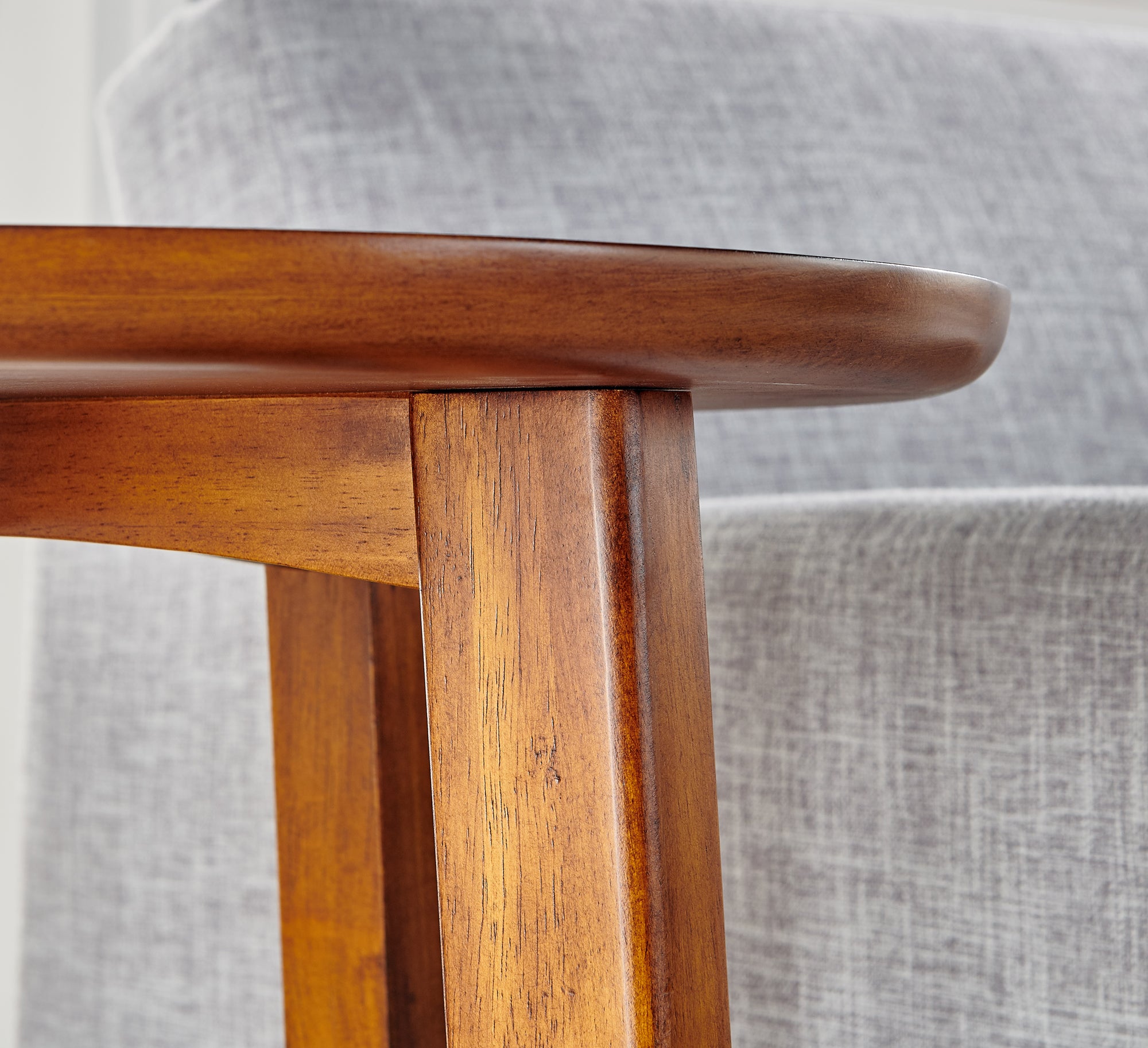 Dare we say these tables are a modern take on mid-century modern design? With their tapered legs and warm chestnut finish you will have the perfect accent to update your living space. This round end table with floating shelf is the perfect size next to your favorite chair. Whether a spot for your favorite book or remotes this end table will be noticed for its unique style.