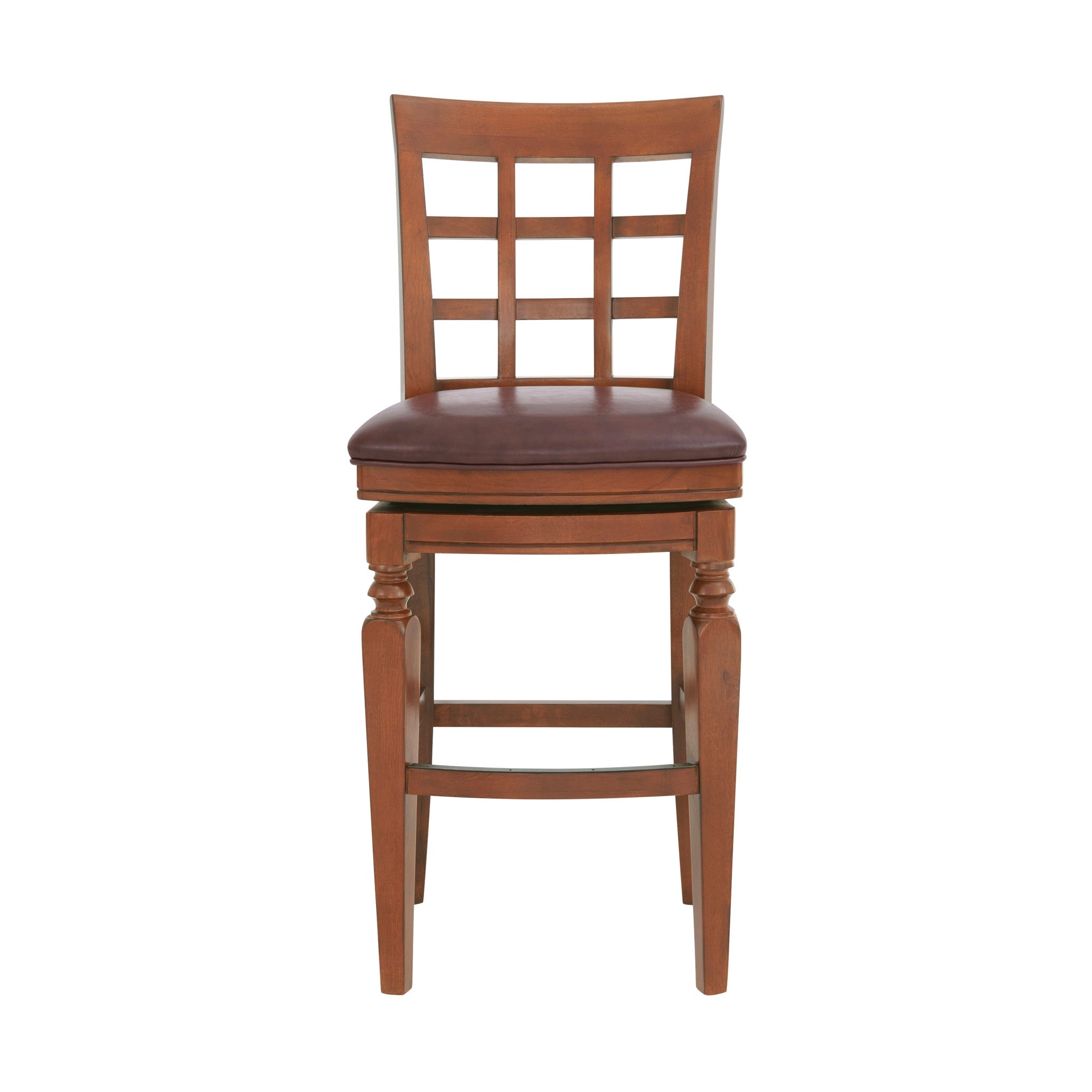 Add elegance to any dining space with this exquisitely crafted bar stool. The solid rubberwood frame features an open trellis back. Upholstered in faux leather and filled with foam, the seat provides just the right amount of support as you sit. This bar stool features a steel memory return-swivel mechanism, bringing your stool to its original position after removing static weight. This stool is suitable for use with pub tables and kitchen counters.  • Sold individually or in set of 2 • Available in bar or counter height • Counter height stool overall dimensions: 19" W x 22" D x 42" H; seat height: 26" • Bar height stool overall dimensions: 19" W x 22" D x 46" H; seat height: 30" • Counter height seat dimensions: 19 3/4"W x 16 1/2"D x 26"H; bar height seat dimensions: 19 3/4"W x 16 1/2"D x 30"H • Counter height seat back dimensions: 18 1/2"W x 15 1/4"H; bar height seat back dimensions: 18 1/2"W x 15 1/4"H • Steel memory return swivel • Counter height stool distance between floor and footrest 6 3/4"; bar height stool 10 1/4" • Footrest provides added stability • Durable metal kick plate protecting the top of the front-facing footrest from scuffs and scratches