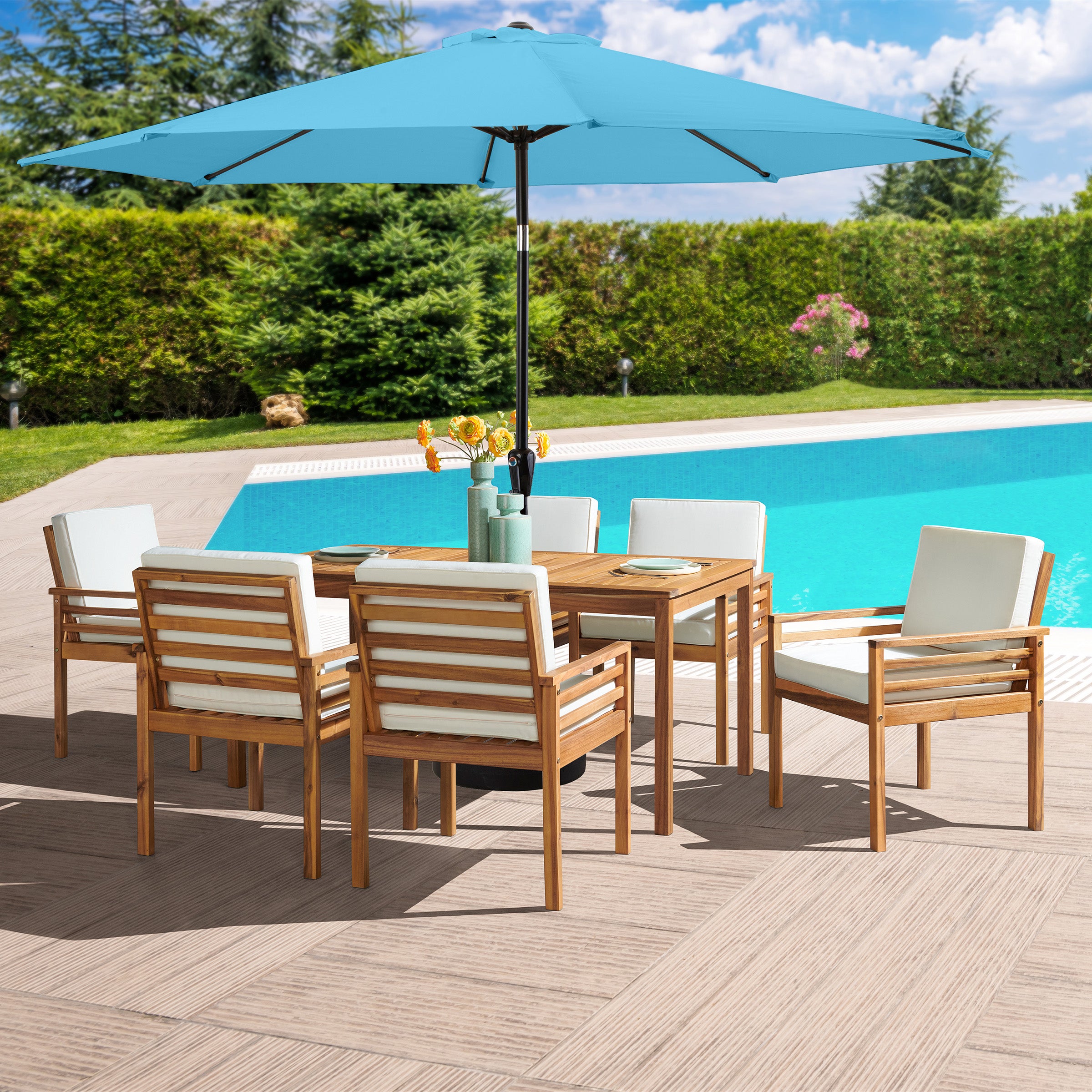 Enjoy hosting your friends and family around this solid acacia wood 8- piece outdoor dining set. Featuring acacia wood frames with plush water-resistant ivory chair cushions for a natural look that will brighten up your space with its simplicity. Up to six people can be seated comfortably around this table. The durable acacia wood design is resistant to outdoor elements so you can enjoy entertaining with this set for seasons to come. The 10-foot patio umbrella with auto tilt will protect your family and friends from the sun providing the perfect outdoor entertainment space!