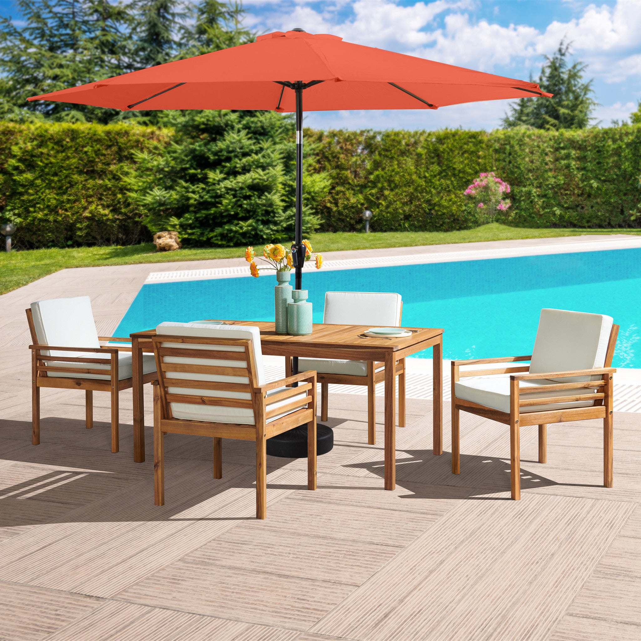 Enjoy hosting your friends and family around this solid acacia 6- piece wood outdoor dining set. Featuring acacia wood frames with plush water-resistant ivory chair cushions for a natural look that will brighten up your space with its simplicity. Up to four people can be seated comfortably around this table. The durable acacia wood design is resistant to outdoor elements so you can enjoy entertaining with this set for seasons to come. The 10-foot patio umbrella with auto tilt will protect your family and friends from the sun providing the perfect outdoor entertainment space!