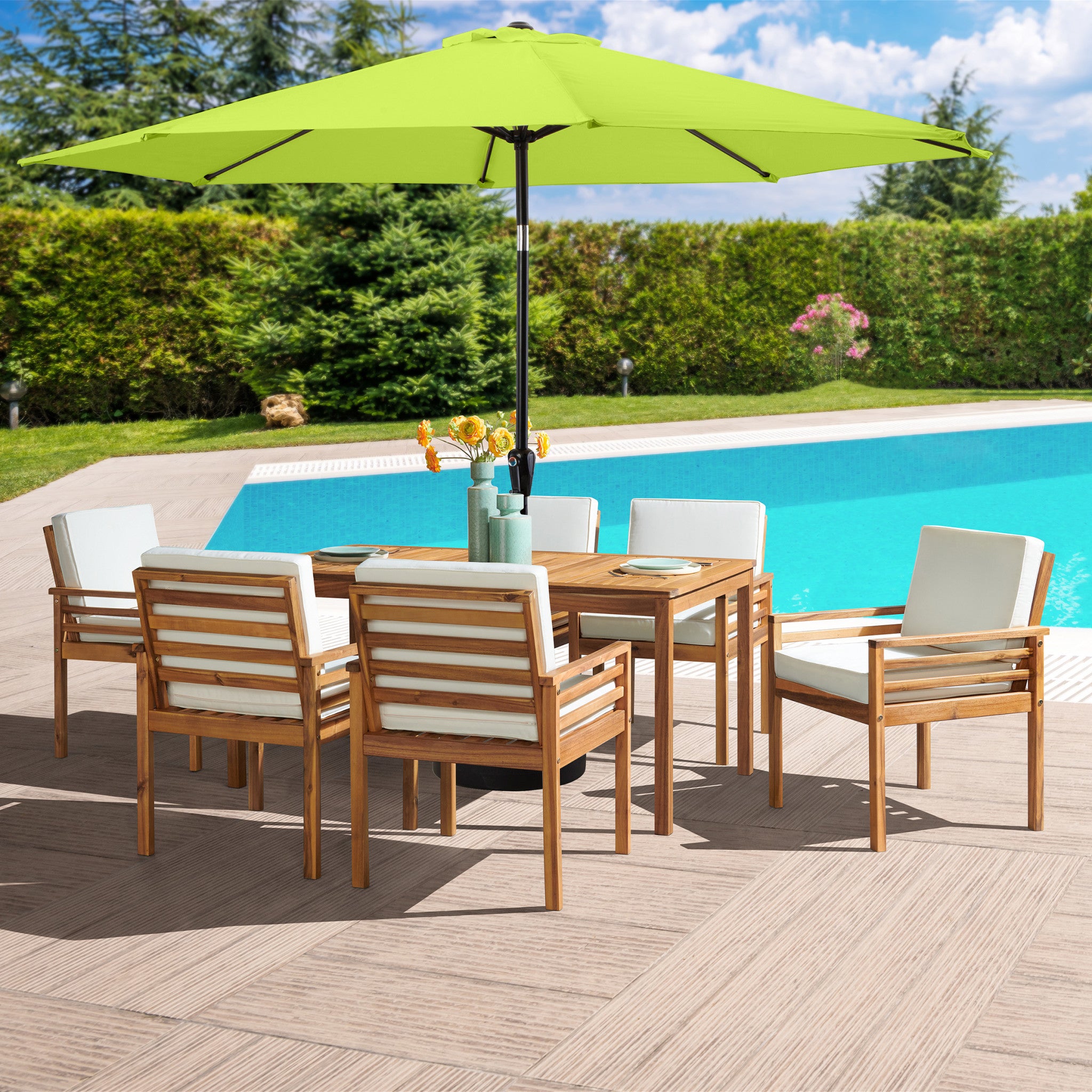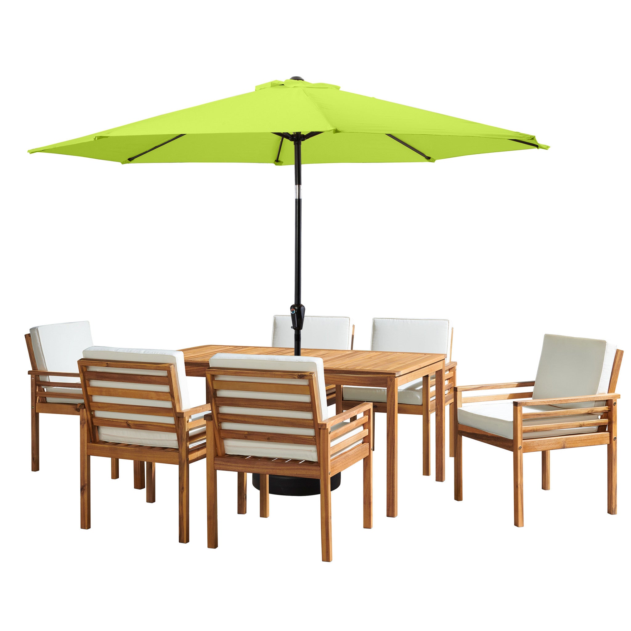 Enjoy hosting your friends and family around this solid acacia wood 8- piece outdoor dining set. Featuring acacia wood frames with plush water-resistant ivory chair cushions for a natural look that will brighten up your space with its simplicity. Up to six people can be seated comfortably around this table. The durable acacia wood design is resistant to outdoor elements so you can enjoy entertaining with this set for seasons to come. The 10-foot patio umbrella with auto tilt will protect your family and friends from the sun providing the perfect outdoor entertainment space!