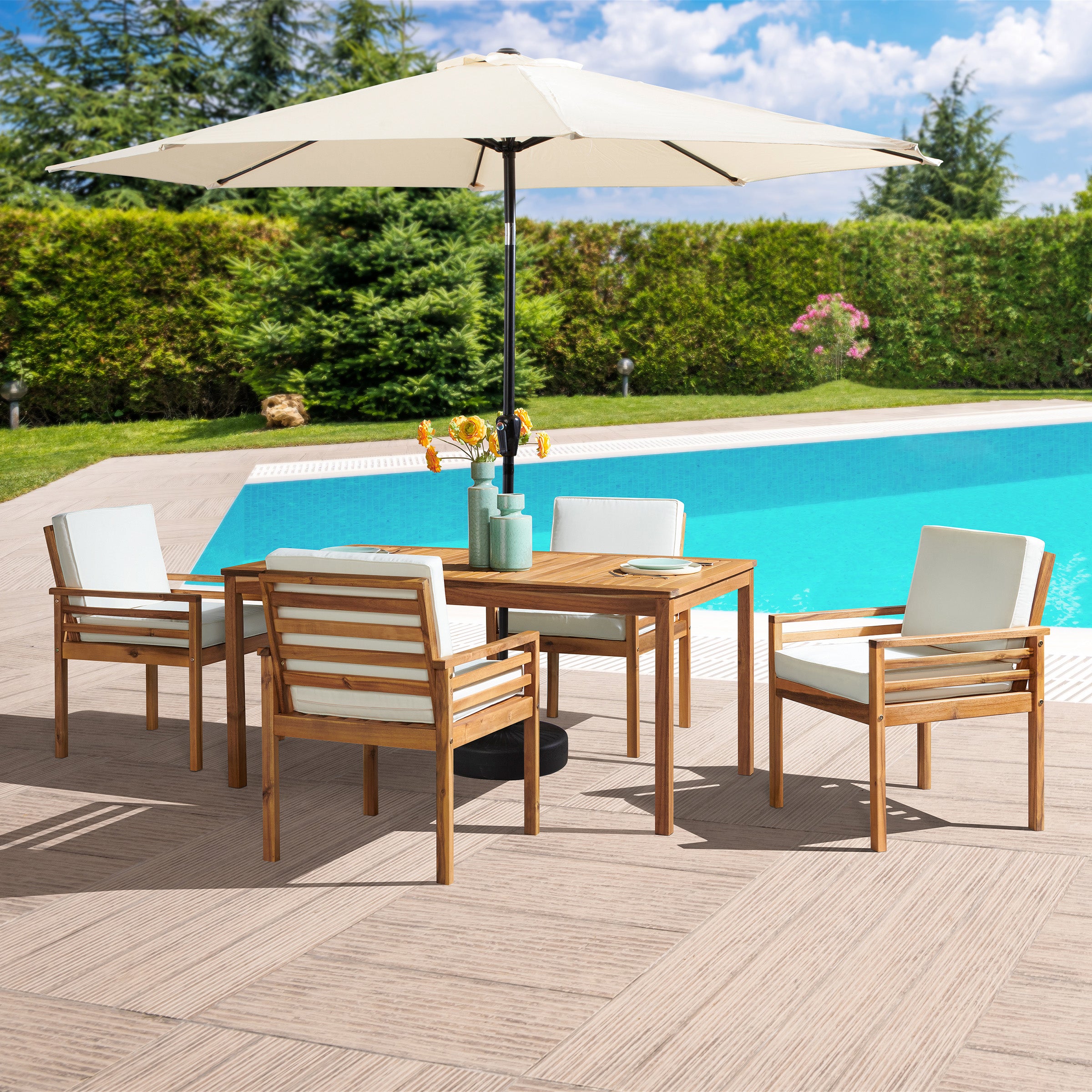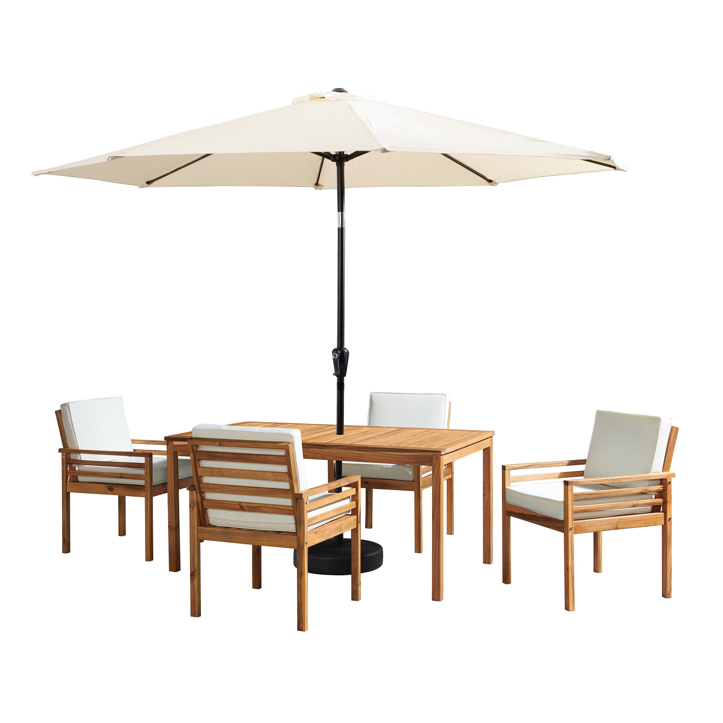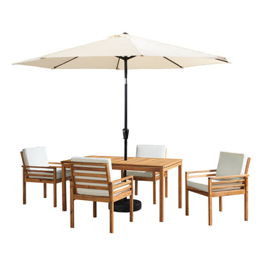 Enjoy hosting your friends and family around this solid acacia 6- piece wood outdoor dining set. Featuring acacia wood frames with plush water-resistant ivory chair cushions for a natural look that will brighten up your space with its simplicity. Up to four people can be seated comfortably around this table. The durable acacia wood design is resistant to outdoor elements so you can enjoy entertaining with this set for seasons to come. The 10-foot patio umbrella with auto tilt will protect your family and friends from the sun providing the perfect outdoor entertainment space!