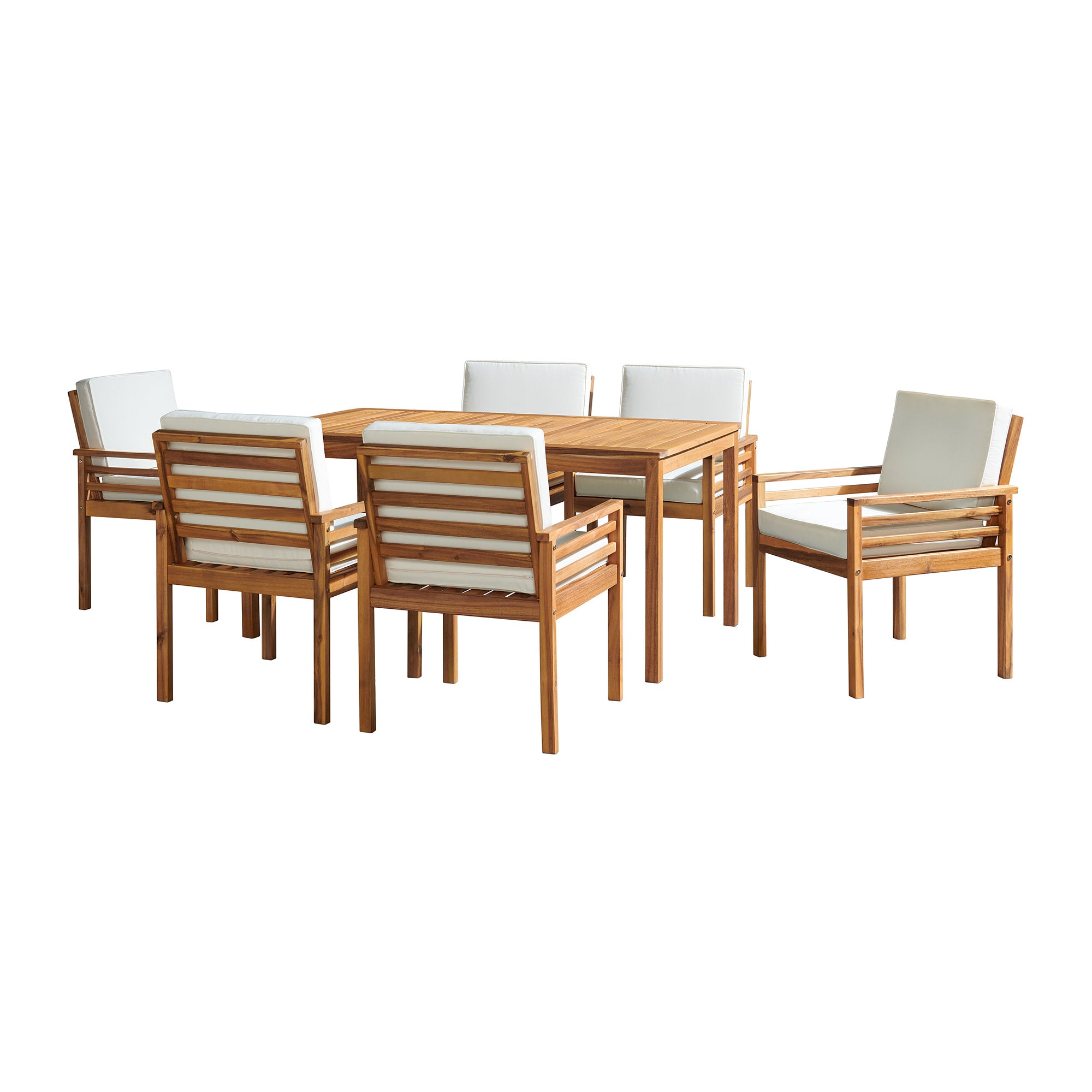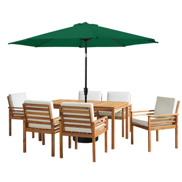 Enjoy hosting your friends and family around this solid acacia wood 8- piece outdoor dining set. Featuring acacia wood frames with plush water-resistant ivory chair cushions for a natural look that will brighten up your space with its simplicity. Up to six people can be seated comfortably around this table. The durable acacia wood design is resistant to outdoor elements so you can enjoy entertaining with this set for seasons to come. The 10-foot patio umbrella with auto tilt will protect your family and friends from the sun providing the perfect outdoor entertainment space!