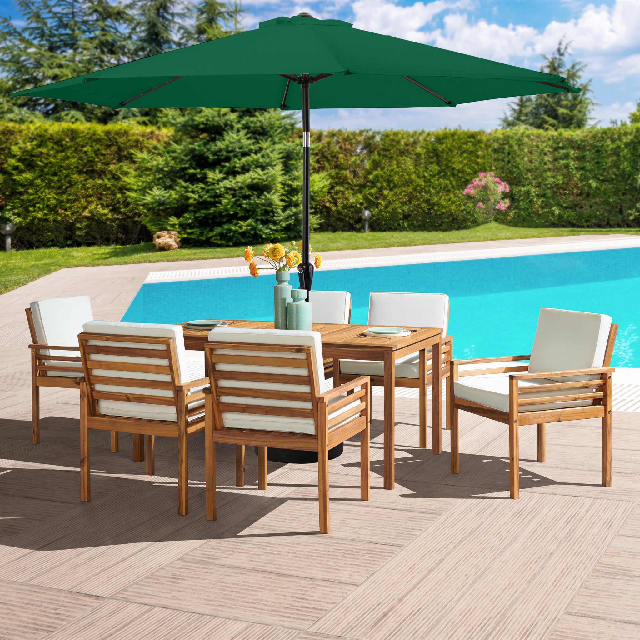 - [SEAMLESS OUTDOOR INTEGRATION] Includes a 10-foot hunter green umbrella that complements the acacia wood finish; equipped with a wind-resistant canopy and auto-tilt feature for optimal sun protection