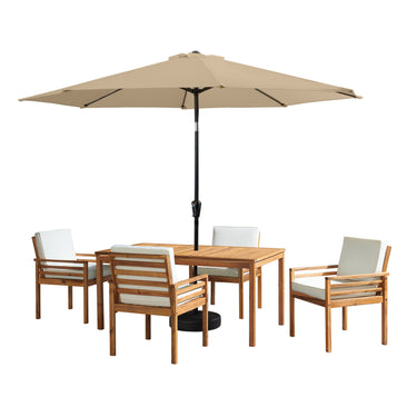 Enjoy hosting your friends and family around this solid acacia 6- piece wood outdoor dining set. Featuring acacia wood frames with plush water-resistant ivory chair cushions for a natural look that will brighten up your space with its simplicity. Up to four people can be seated comfortably around this table. The durable acacia wood design is resistant to outdoor elements so you can enjoy entertaining with this set for seasons to come. The 10-foot patio umbrella with auto tilt will protect your family and friends from the sun providing the perfect outdoor entertainment space!