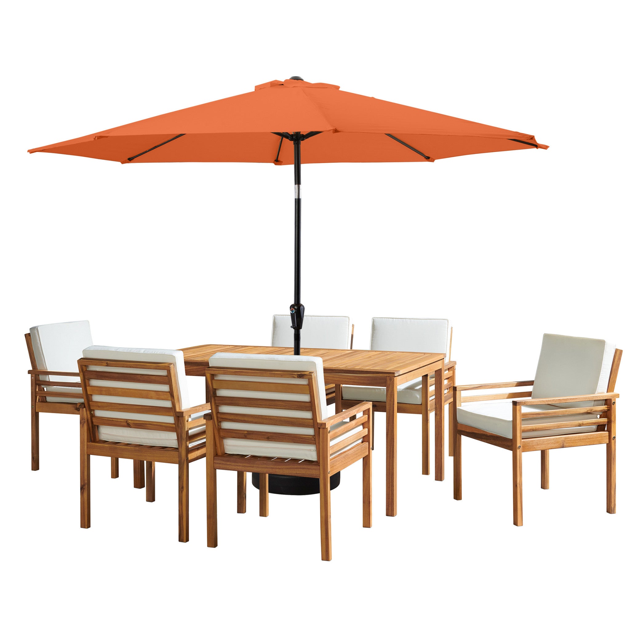 Enjoy hosting your friends and family around this solid acacia wood 8- piece outdoor dining set. Featuring acacia wood frames with plush water-resistant ivory chair cushions for a natural look that will brighten up your space with its simplicity. Up to six people can be seated comfortably around this table. The durable acacia wood design is resistant to outdoor elements so you can enjoy entertaining with this set for seasons to come. The 10-foot patio umbrella with auto tilt will protect your family and friends from the sun providing the perfect outdoor entertainment space!