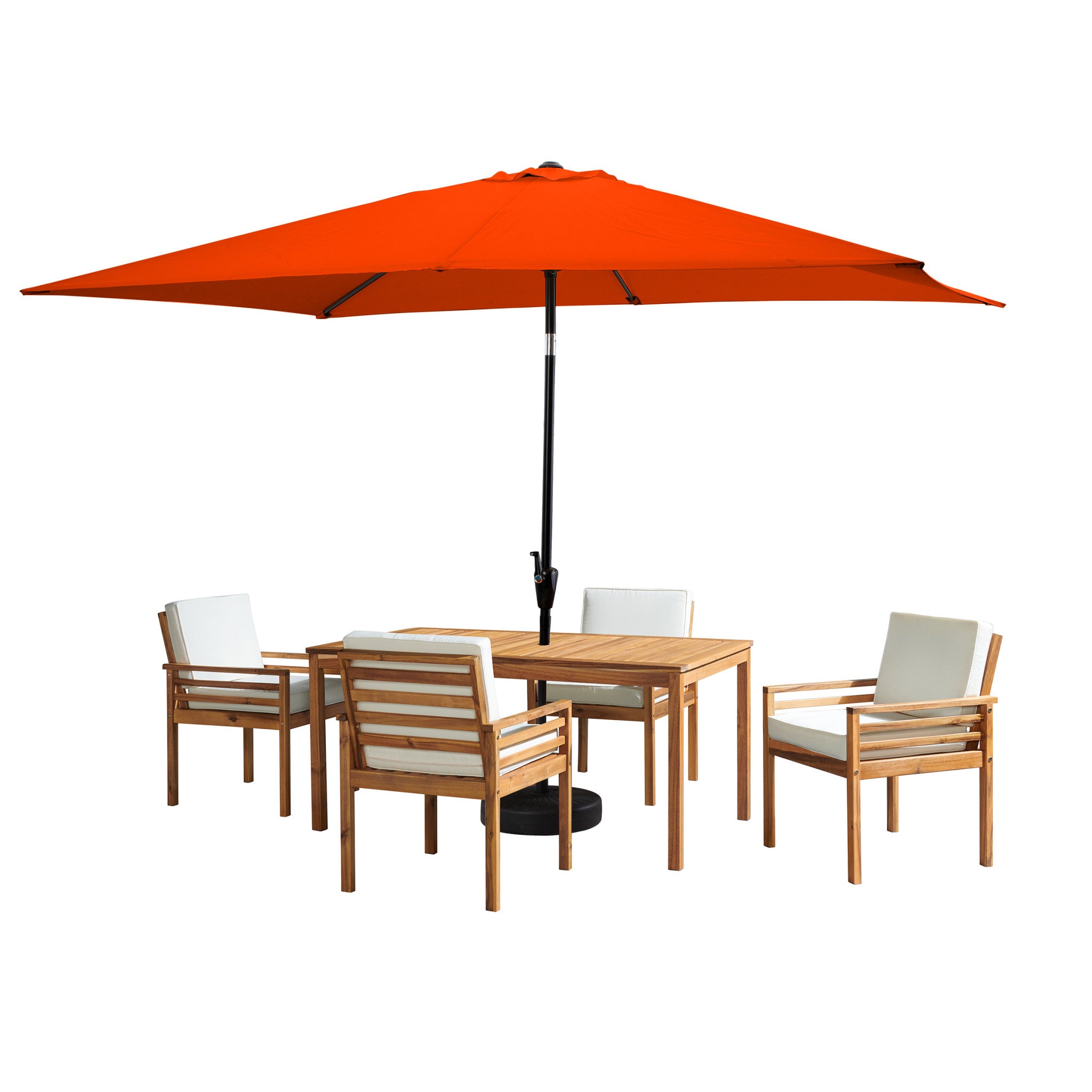 Enjoy hosting your friends and family around this solid acacia wood 6-piece outdoor dining set. Featuring acacia wood frames with plush water-resistant ivory chair cushions for a natural look that will brighten up your space with its simplicity. Up to four people can be seated comfortably around this table. The durable acacia wood design is resistant to outdoor elements so you can enjoy entertaining with this set for seasons to come. The set also includes a 10-foot rectangular umbrella. The sun umbrella outdoor patio shade is an attractive piece of outdoor décor that provides quality sun protection whether you’re entertaining guests on the deck or lounging by your swimming pool.