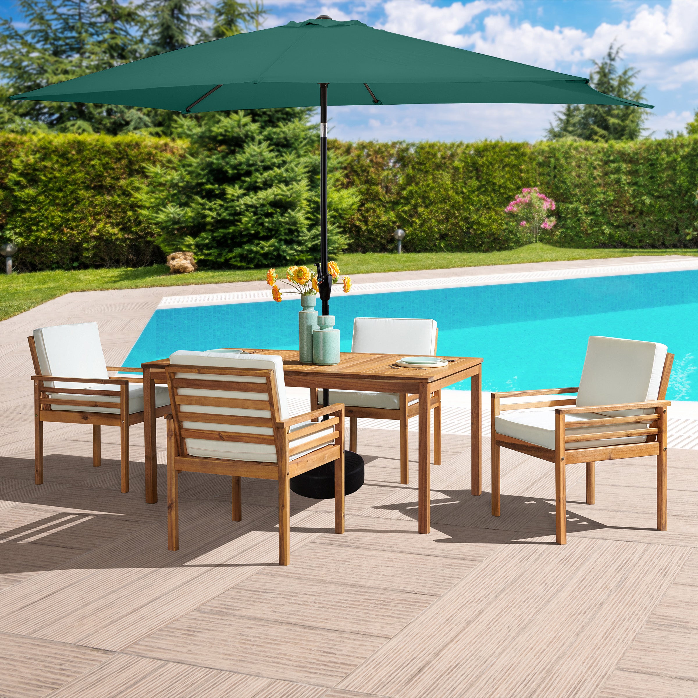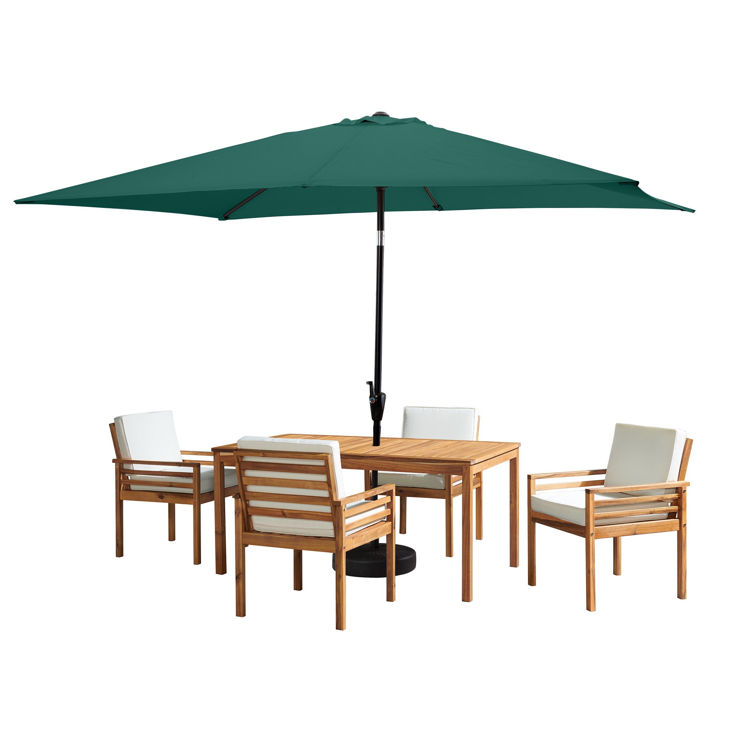 - [WEATHER RESILIENCE & AESTHETIC APPEAL] Acacia wood with a natural finish for outdoor use. Paired with a hunter green umbrella, this set offers year-round resilience and stylish sun protection for outdoor gatherings