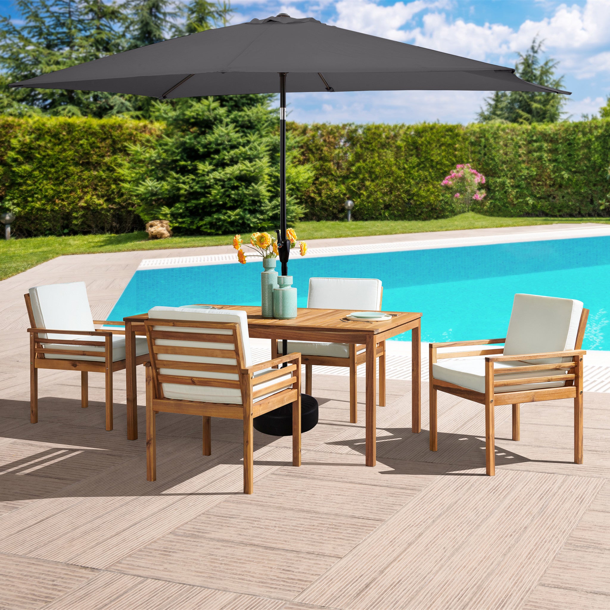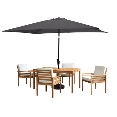 Enjoy hosting your friends and family around this solid acacia wood 6-piece outdoor dining set. Featuring acacia wood frames with plush water-resistant ivory chair cushions for a natural look that will brighten up your space with its simplicity. Up to four people can be seated comfortably around this table. The durable acacia wood design is resistant to outdoor elements so you can enjoy entertaining with this set for seasons to come. The set also includes a 10-foot rectangular umbrella. The sun umbrella outdoor patio shade is an attractive piece of outdoor décor that provides quality sun protection whether you’re entertaining guests on the deck or lounging by your swimming pool.
