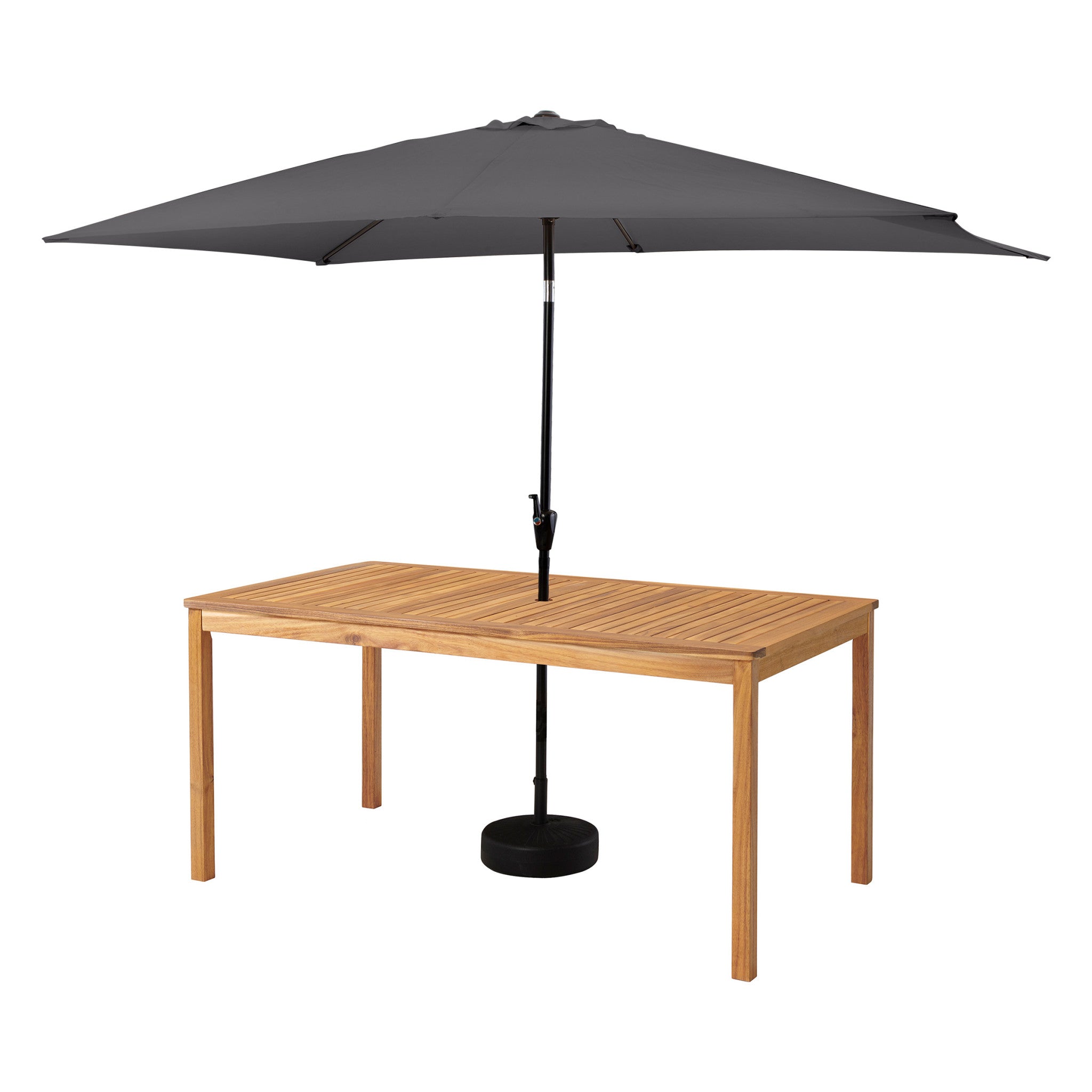 - [DIMENSIONS AND MATERIAL] Table 63" W x 35" D x 29" H, chairs 24" W x 27" D x 33" H. Made from weather-resistant acacia wood with a 10-foot umbrella for optimal shade