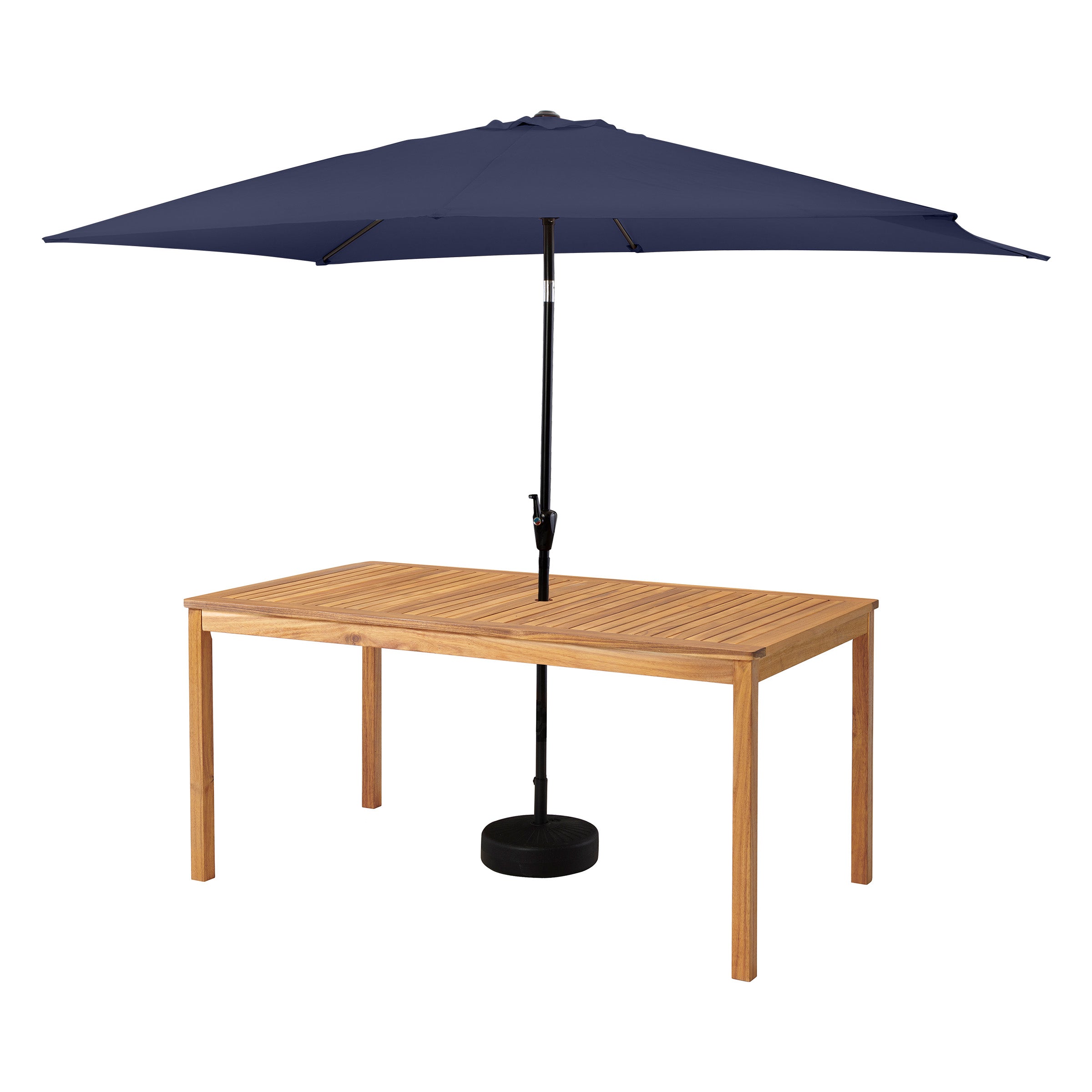 Enjoy hosting your friends and family around this solid acacia wood 8-piece outdoor dining set. Featuring acacia wood frames with plush water-resistant ivory chair cushions for a natural look that will brighten up your space with its simplicity. Up to six people can be seated comfortably around this table. The durable acacia wood design is resistant to outdoor elements so you can enjoy entertaining with this set for seasons to come. The set also includes a 10-foot rectangular umbrella. The sun umbrella outdoor patio shade is an attractive piece of outdoor décor that provides quality sun protection whether you’re entertaining guests on the deck or lounging by your swimming pool.