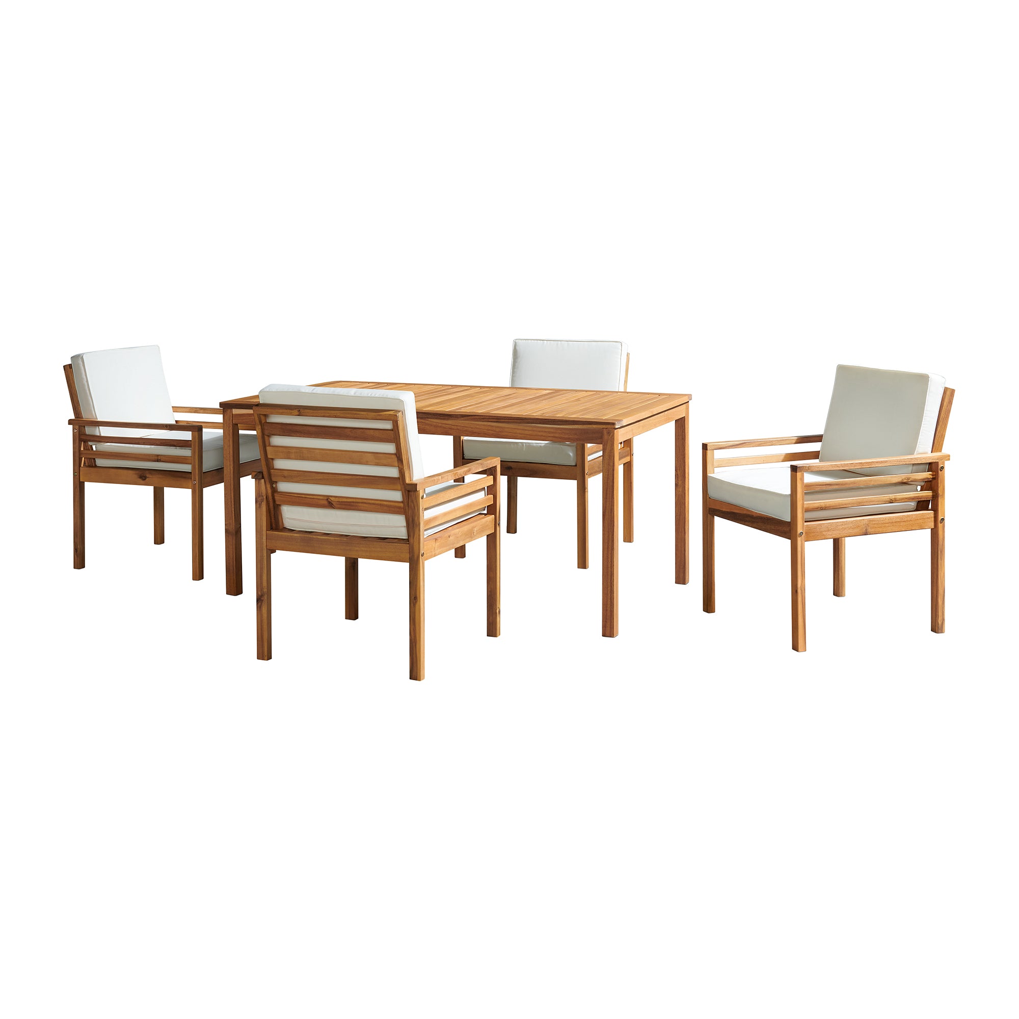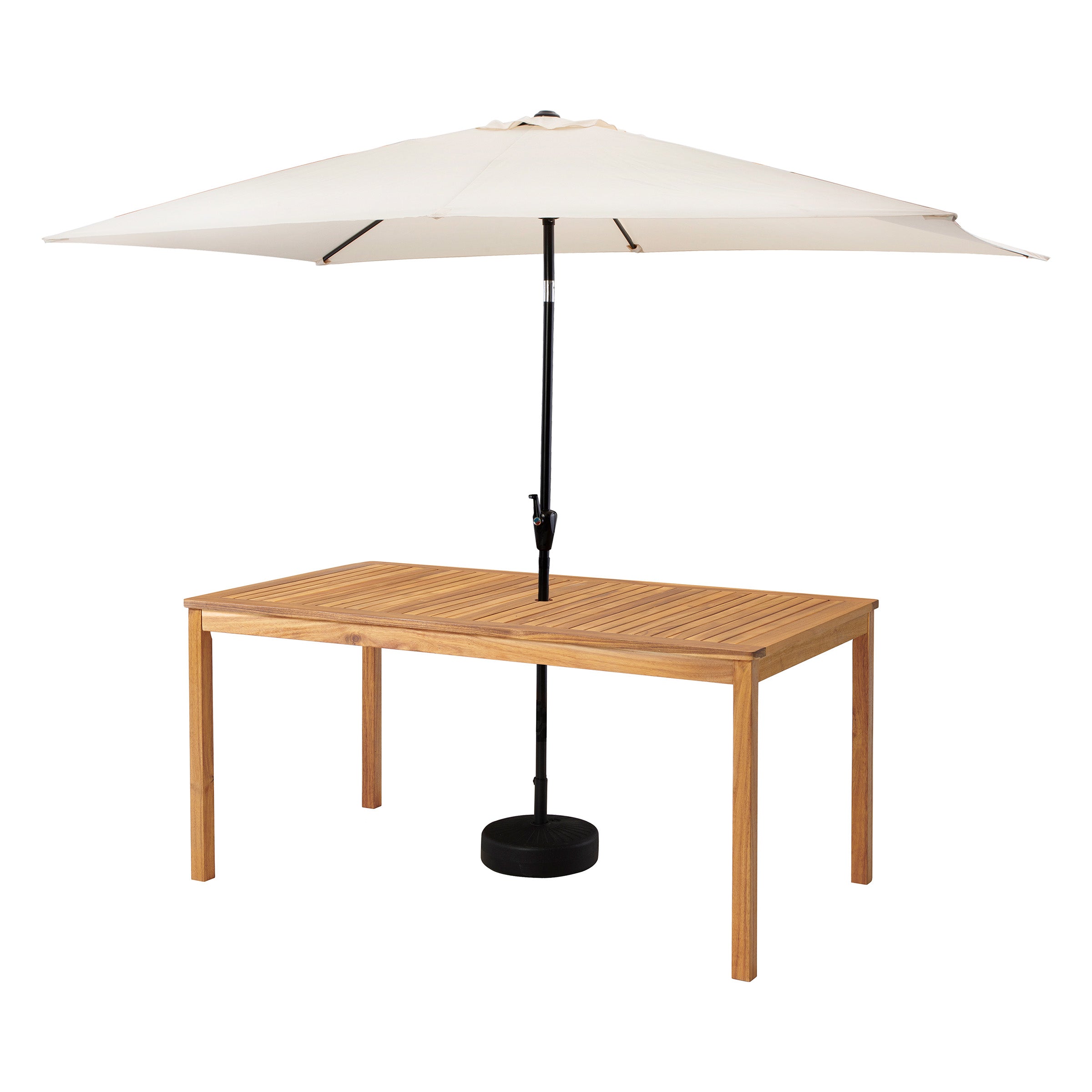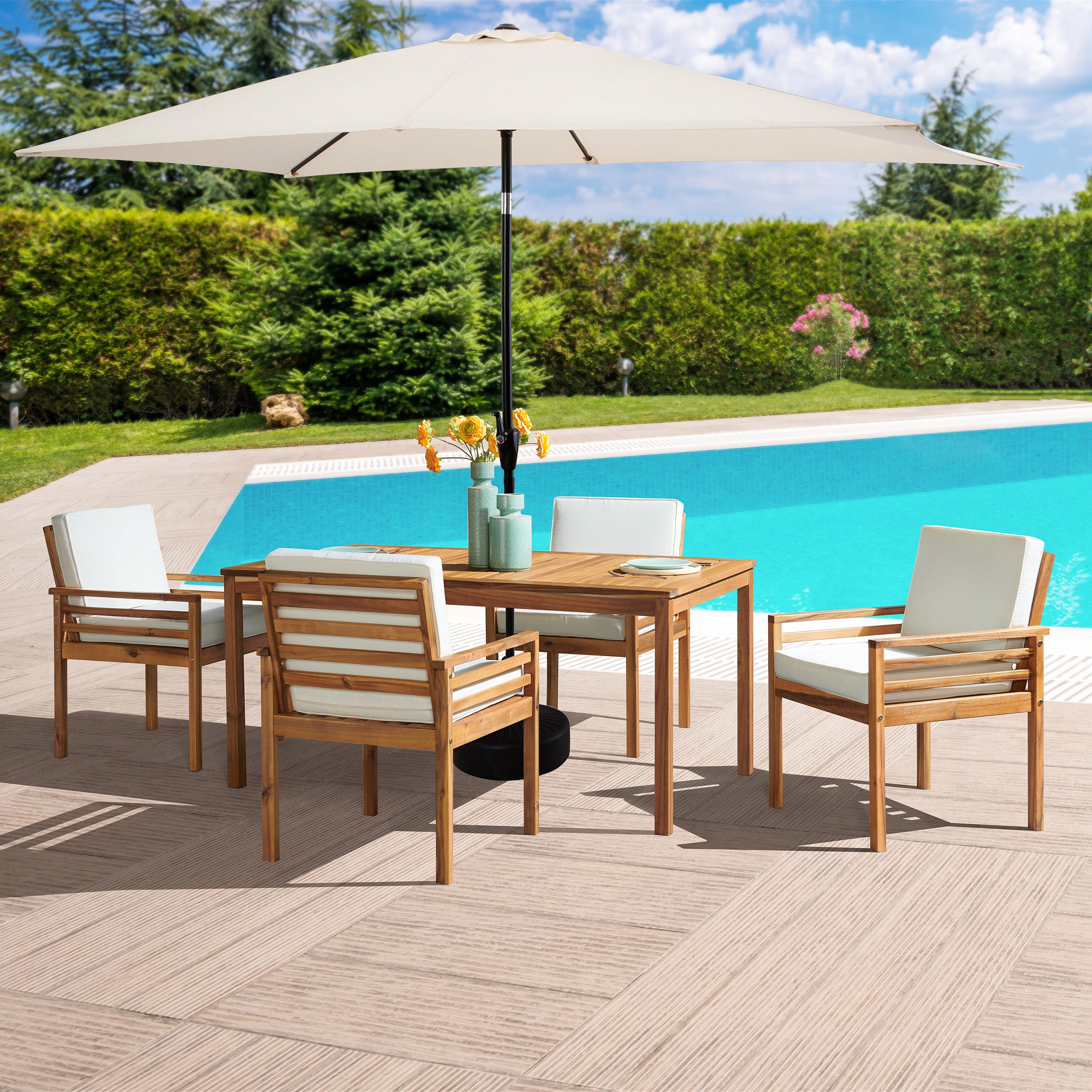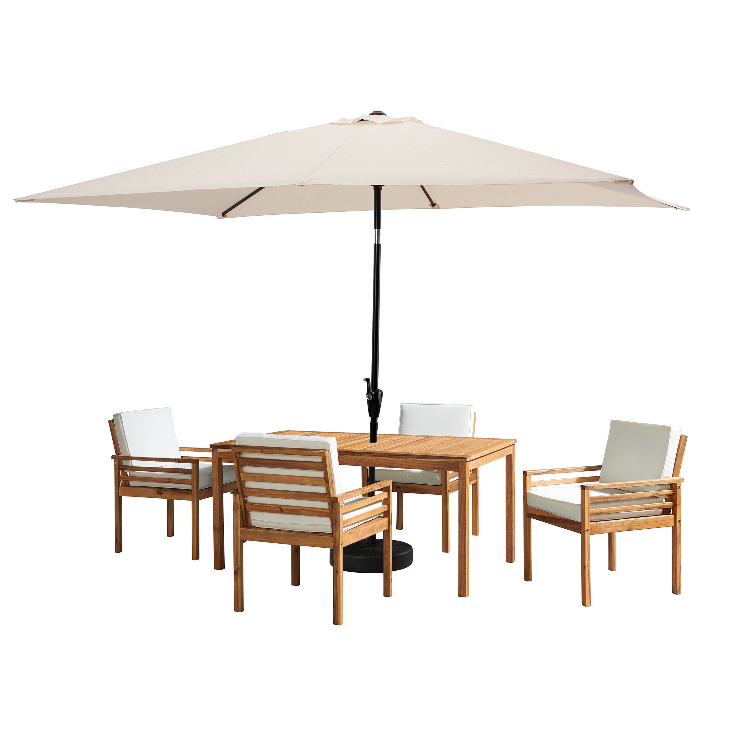 Enjoy hosting your friends and family around this solid acacia wood 6-piece outdoor dining set. Featuring acacia wood frames with plush water-resistant ivory chair cushions for a natural look that will brighten up your space with its simplicity. Up to four people can be seated comfortably around this table. The durable acacia wood design is resistant to outdoor elements so you can enjoy entertaining with this set for seasons to come. The set also includes a 10-foot rectangular umbrella. The sun umbrella outdoor patio shade is an attractive piece of outdoor décor that provides quality sun protection whether you’re entertaining guests on the deck or lounging by your swimming pool.