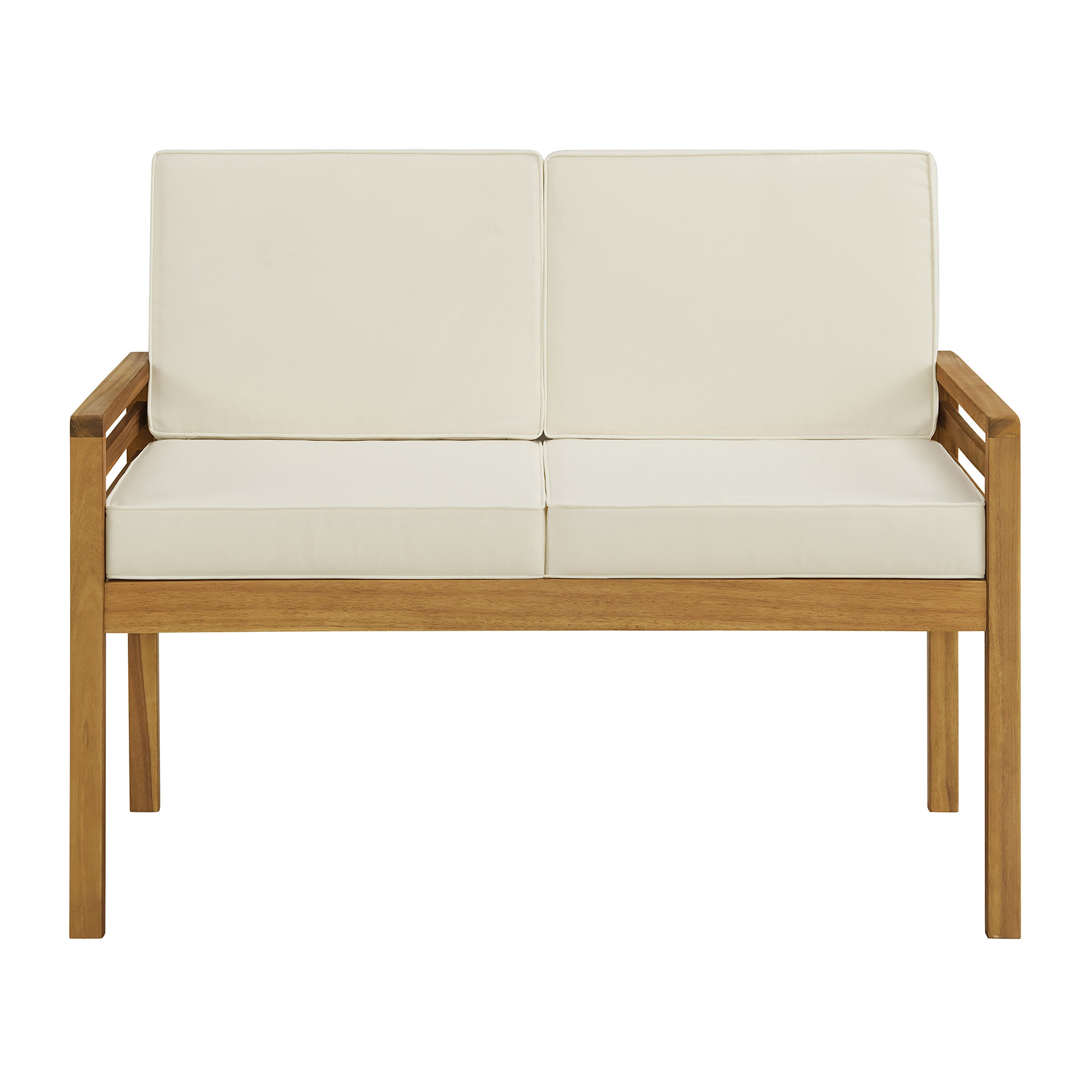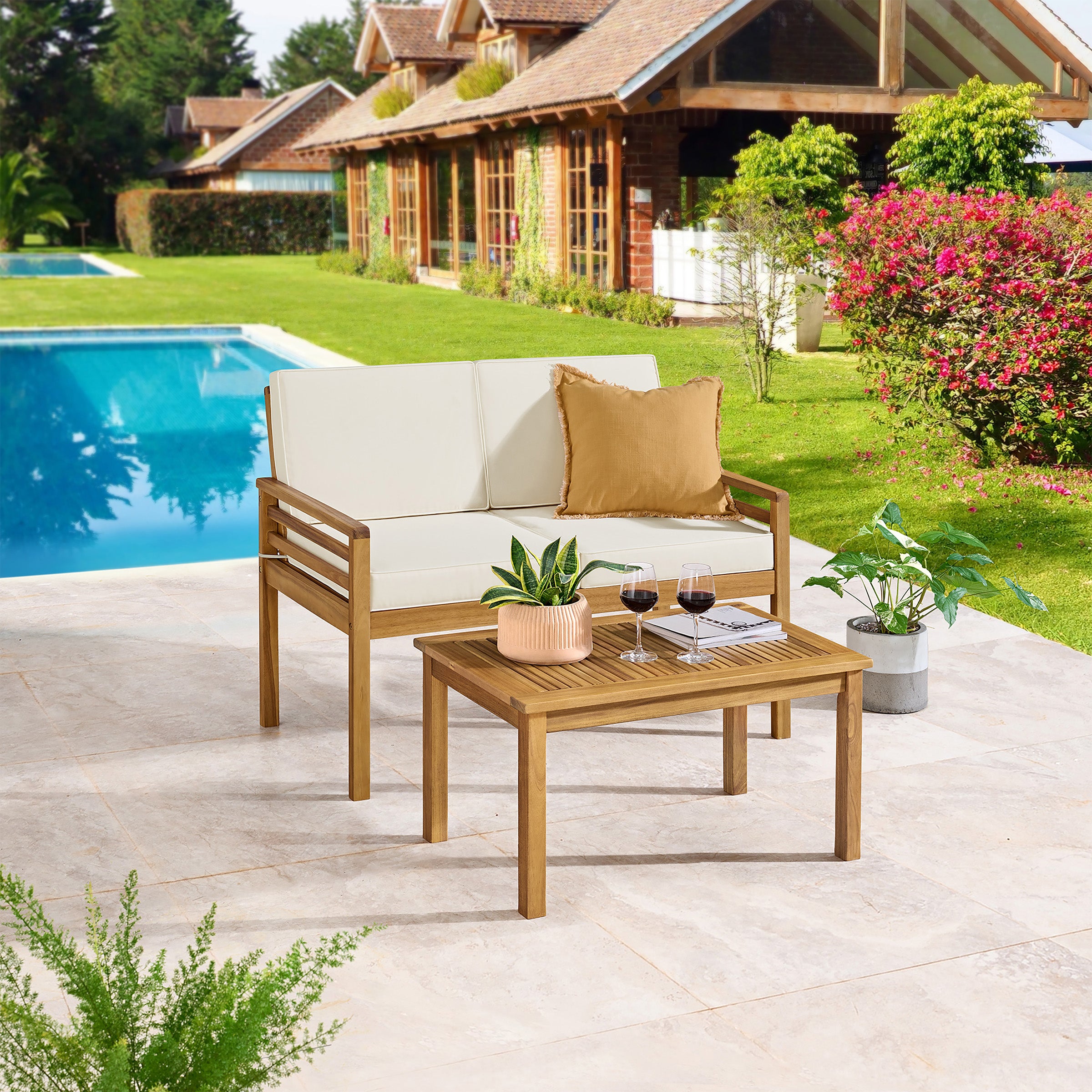 - The outdoor sofa and table are made of durable weather-resistant acacia wood as well as water-resistant cushions for a comfortable, long-lasting small patio set